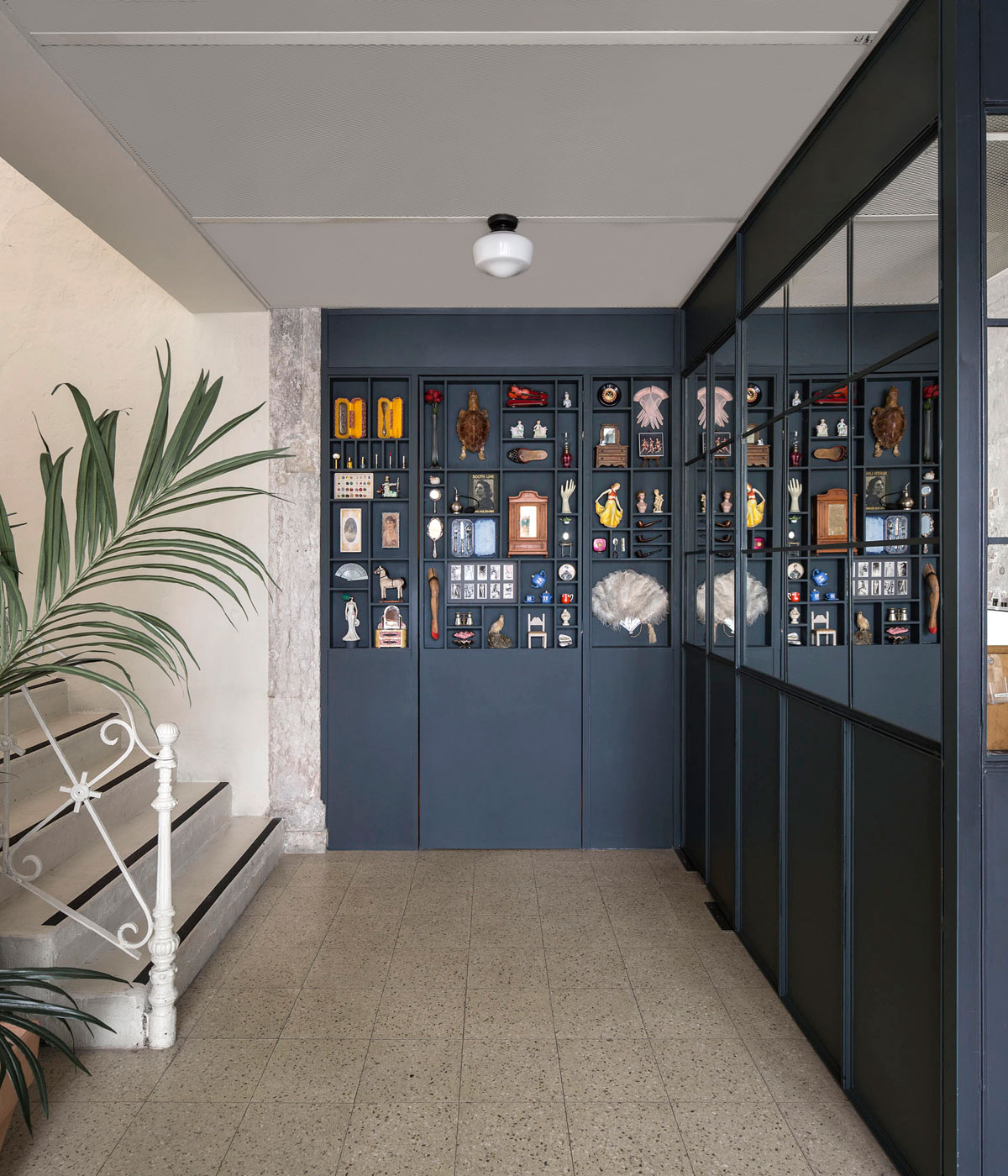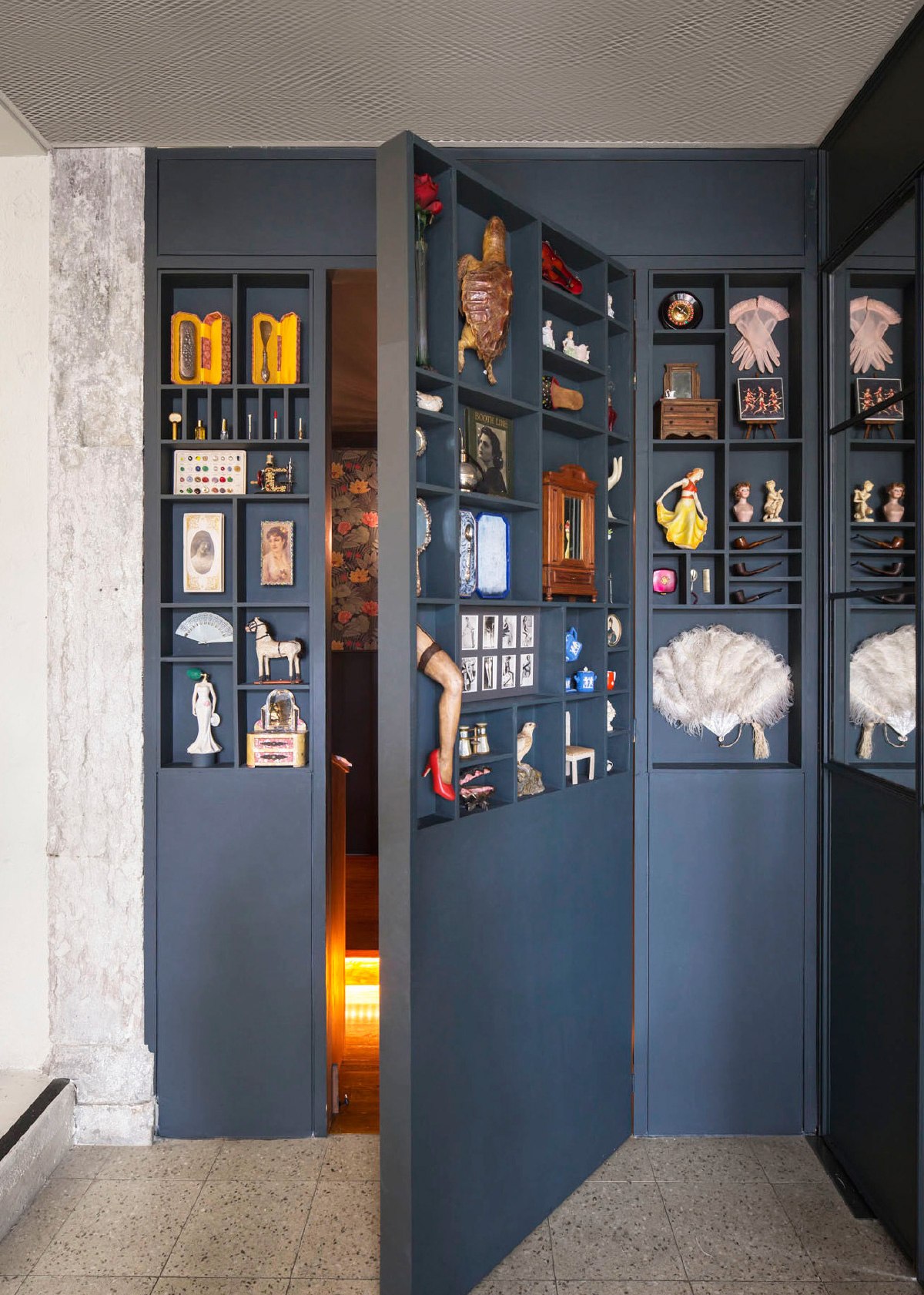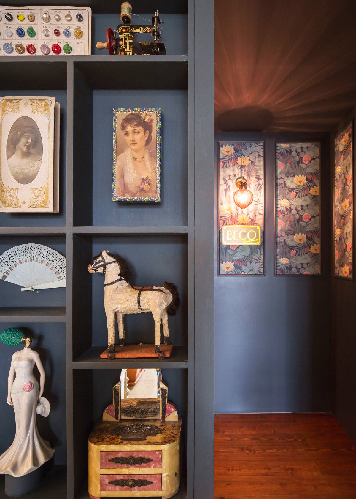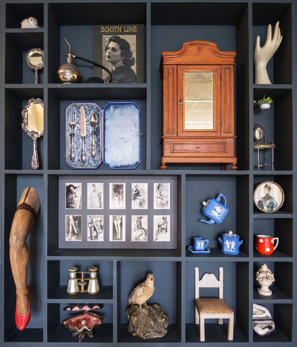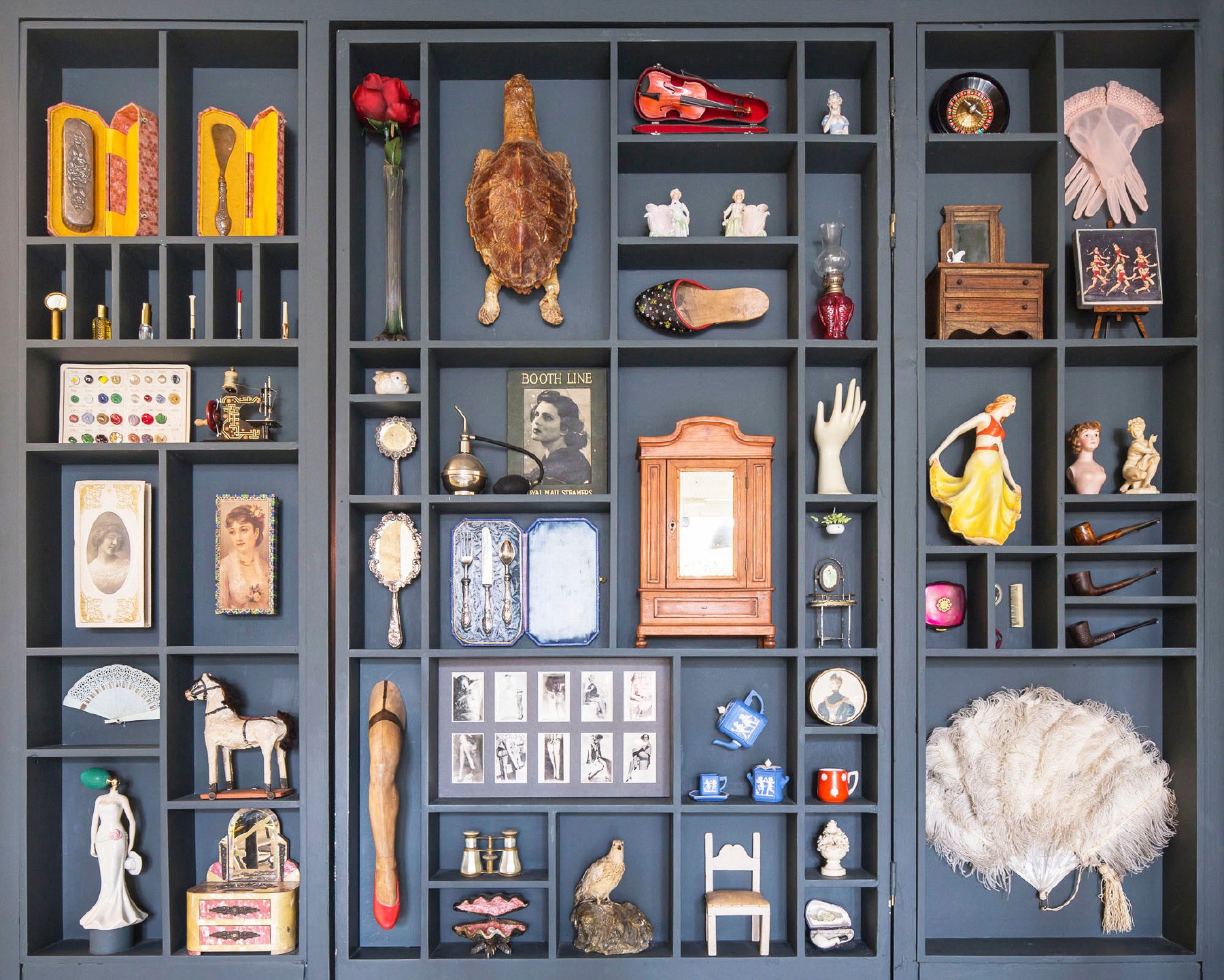 Taking the form of a cabinet turned architecture, the shelving grid is painted in deep, tonal hues—its modular compartments more akin to miniature frames than functional storage. Each niche hosts a collection of trinkets, found souvenirs, ceramics, vintage wares, and ephemera—objects imbued with history, personal resonance, and subtle wit.