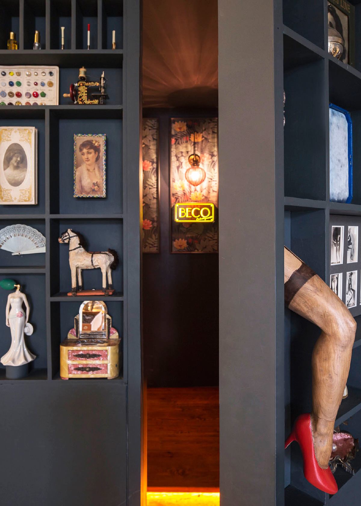 The carefully calibrated lighting enhances an atmosphere that balances familiarity with curiosity: the shelves glow like illuminated windows in twilight, inviting a pause, an intimate exploration, a guest viewing. At once reminiscent of a domestic curiosity cabinet and a theatrical backdrop, Beco manifests Studio Astolfi’s storytelling in spatial form, blurring the lines between display, architecture, and art.