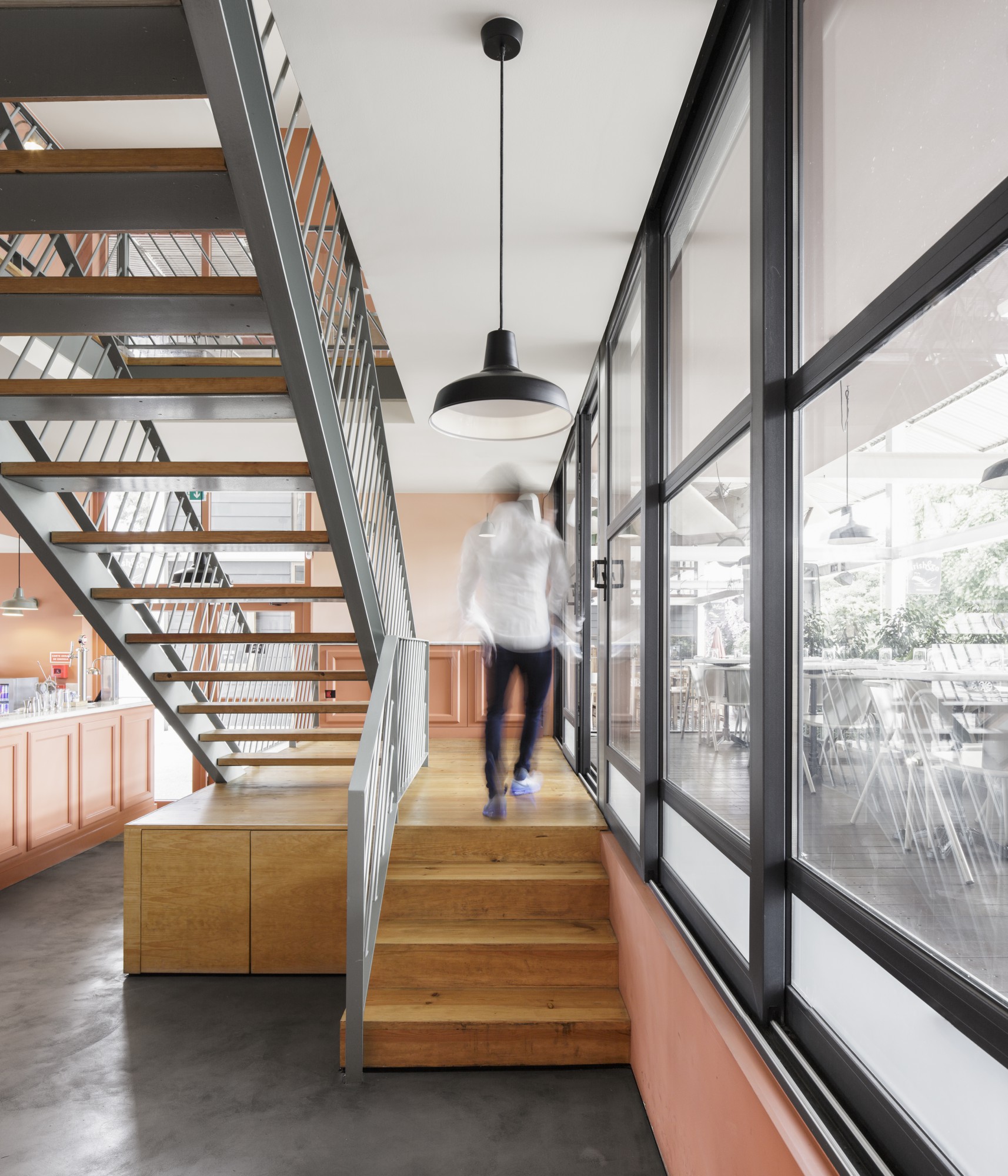 Tables and retro Scandinavian chairs, painted in muted shades of grey-blue and dusty salmon, create a cool contrast to the warm palette. These are set against the graphic presence of black industrial metal used in window frames and lighting fixtures, adding structure and rhythm to the space.