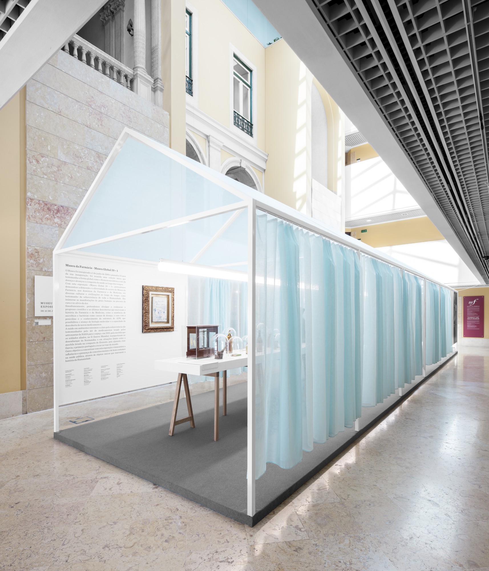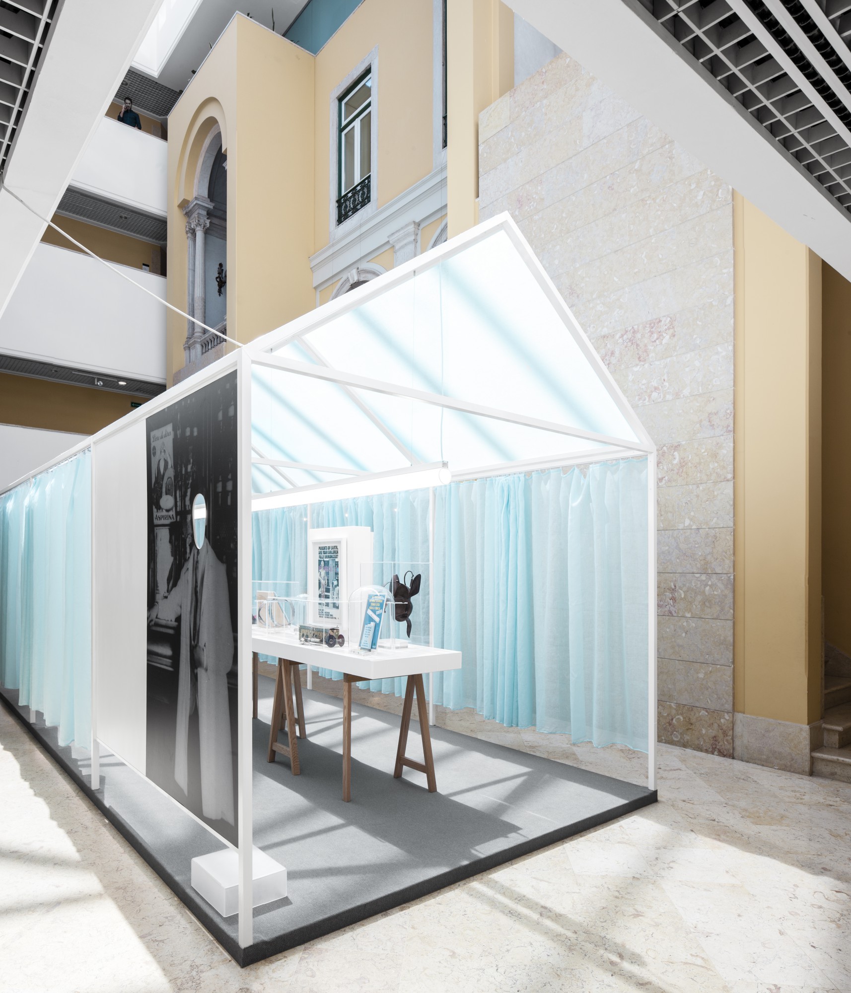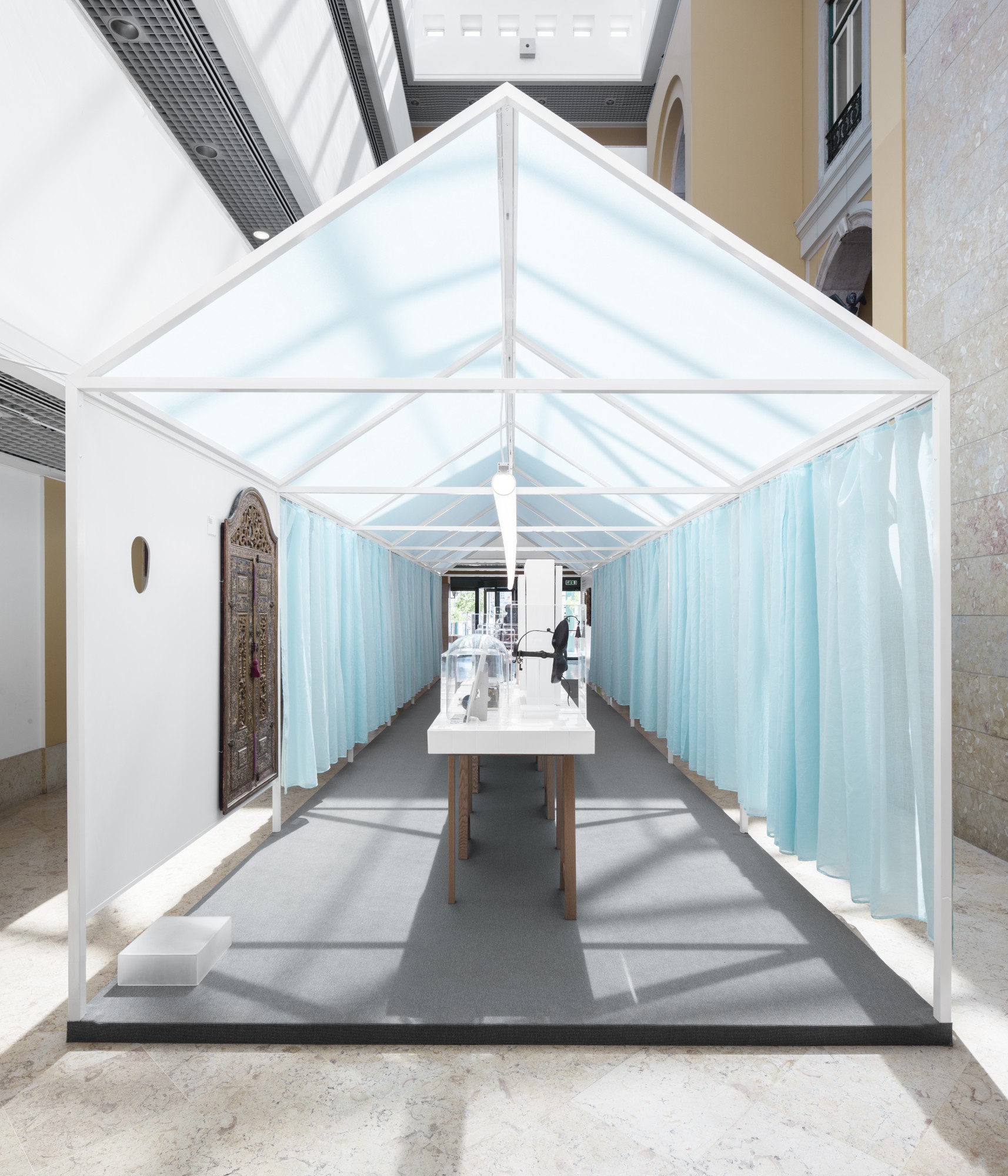 Studio Astolfi was invited to create the exhibition’s spatial concept, responding with a poetic “space within a space” that transforms the museum environment into an evocative and contemplative setting. At the center of the installation, a traditional house-like structure was constructed entirely from slender metallic framing. Its soft, translucent walls are made from light blue curtains, gently enclosing the exhibit in a space that feels both domestic and ethereal.