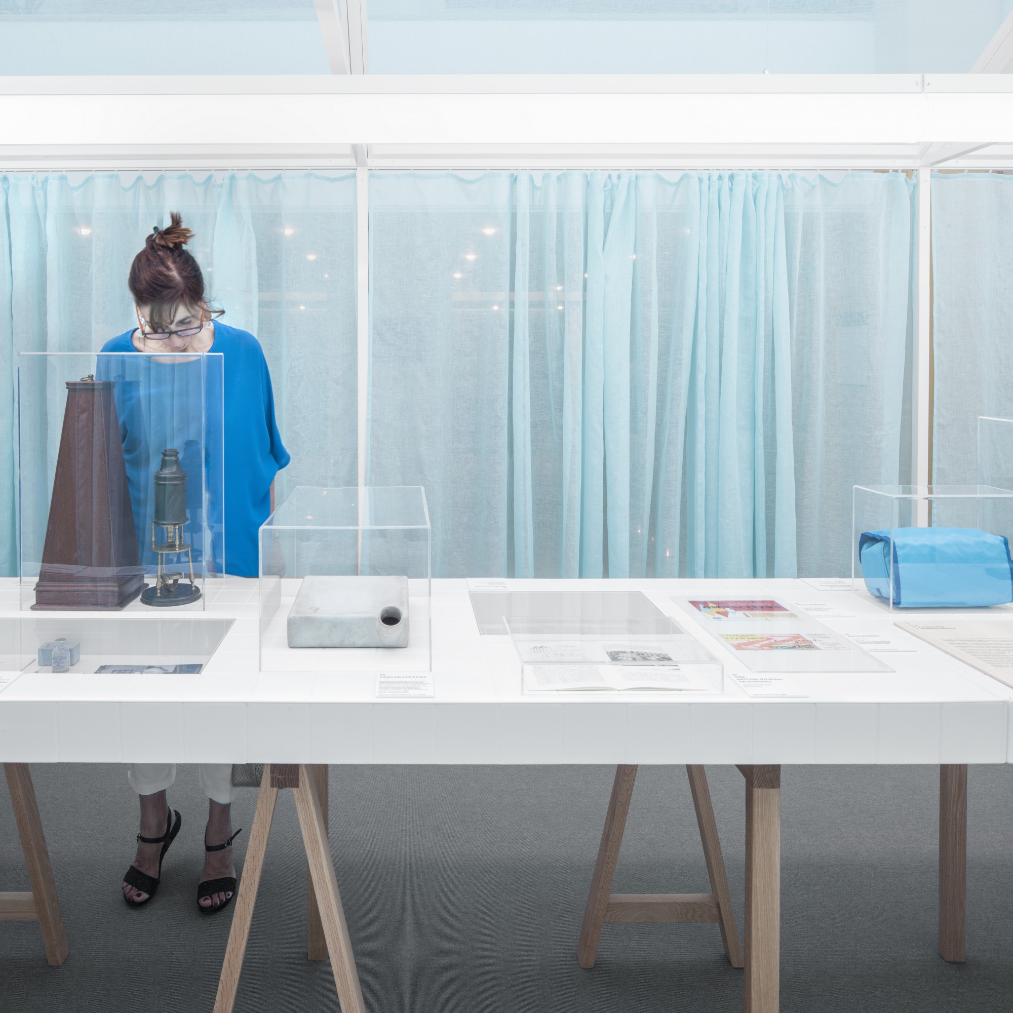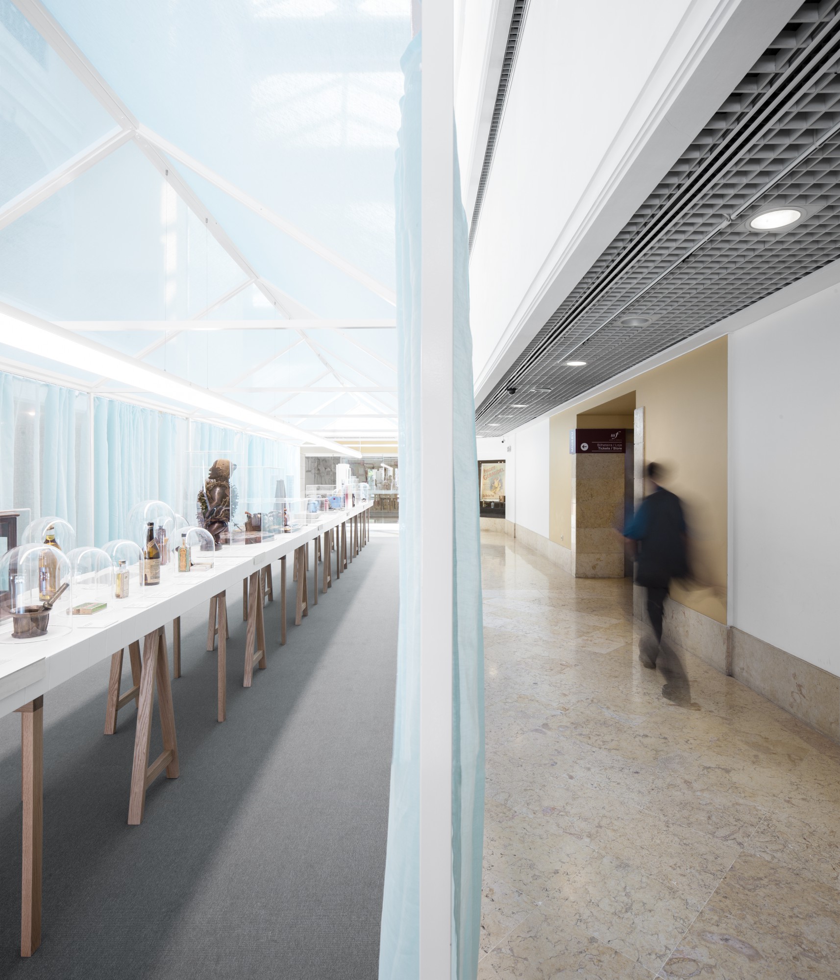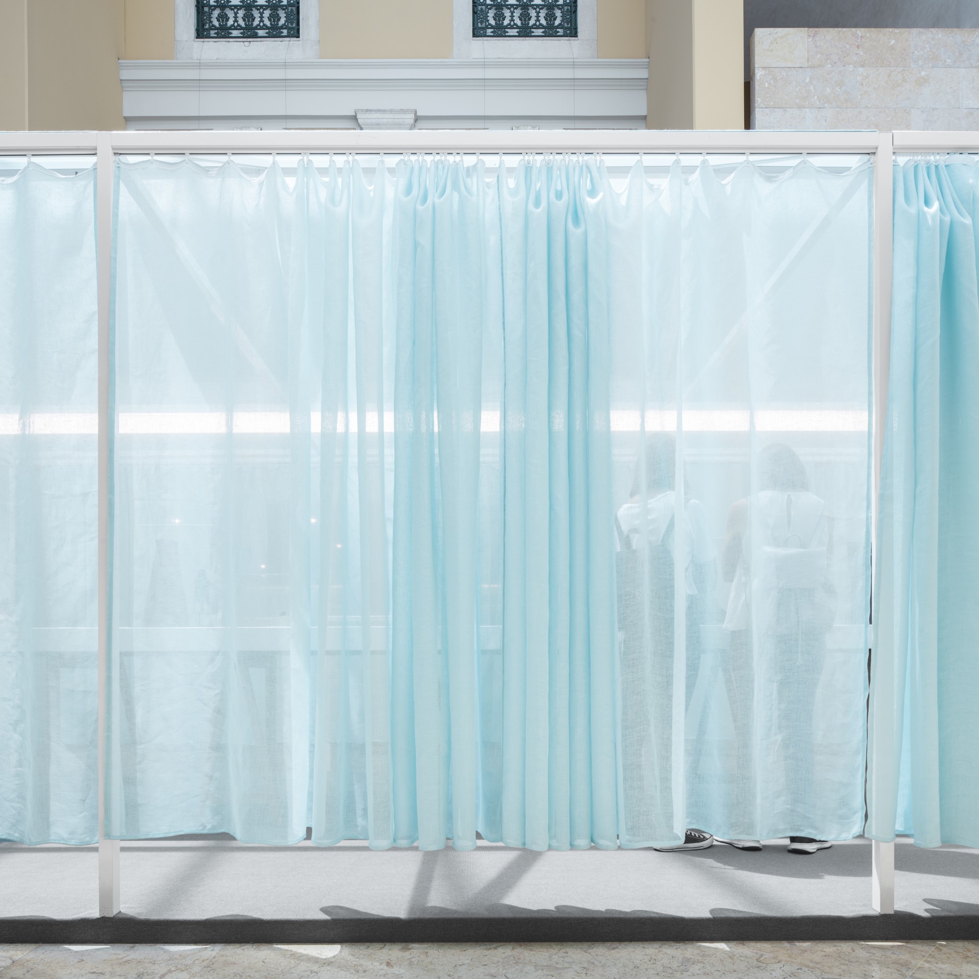 Studio Astolfi was invited to create the exhibition’s spatial concept, responding with a poetic “space within a space” that transforms the museum environment into an evocative and contemplative setting. At the center of the installation, a traditional house-like structure was constructed entirely from slender metallic framing. Its soft, translucent walls are made from light blue curtains, gently enclosing the exhibit in a space that feels both domestic and ethereal.