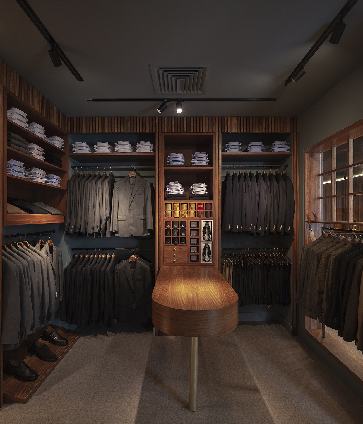 The palette of textures and materials includes the wood paneling that runs throughout the shop; the black-iron profiles of the display system, with its geometric lines integrated into the shop’s walls; carpet; velvet; and an immersive deep blue that lends masculine sensibility to the space. The vintage lighting fixtures and furniture contribute to the creation of a cozy habitat. Various vintage decorative objects, linked to the world of the tailor and invoking a sense of virile lifestyle, play a fundamental role in telling the history of the brand.