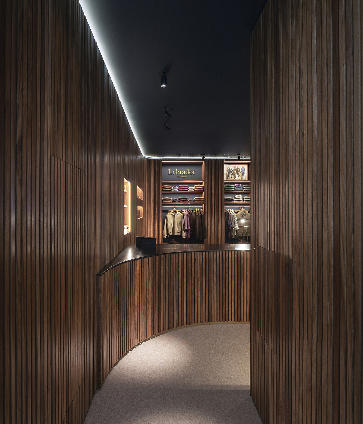 The narrative of the space for Labrador’s flagship store is based in the now-classic North American “Case Study Houses” of the 1950s. It is a retail space characterized by a unique sense of domesticity and comfort, shot through with a skein of mid-century minimalist elegance and fortified with a distinctively masculine twist. The journey through the shop is a voyage of discovery, where various moments of “space in space” characterize different zones: foyer, the Tailor’s House, a lounge with fireplace and bar, the Alfaiataria (an open workshop where the clients can observe garment construction in action) and fitting rooms. Embracing all of these spaces is a fluid perimeter where all of the brand’s products are exposed in an integrative exhibition system based in the concept of built-in furniture. To celebrate the former Labrador shop, we have integrated the old storefront façade in the Tailor’s House, enhancing the sensation of “space in space.”