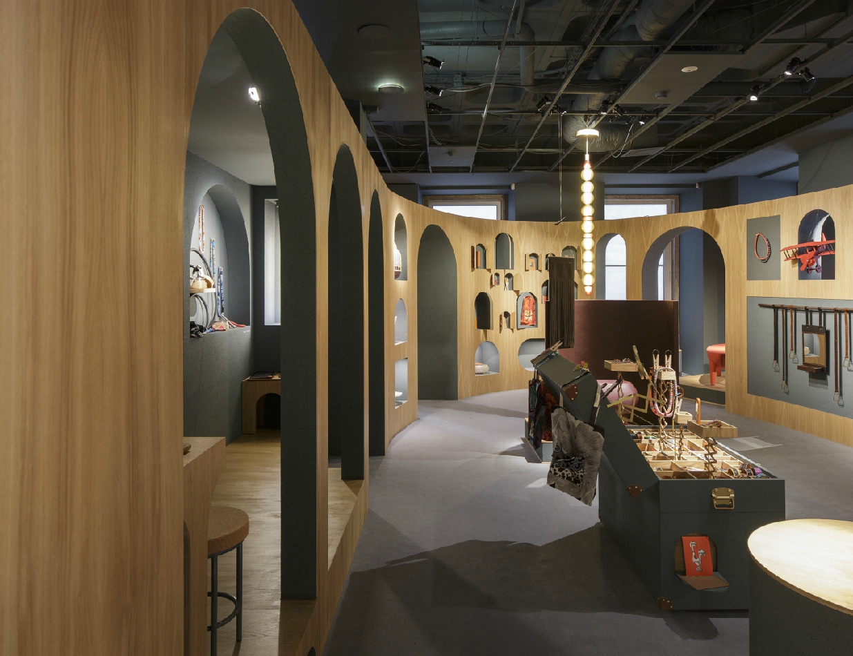 The Petit H pop-up shop at Hermès Chiado, in Lisbon, aimed to celebrate their collection of capricious, resourceful and whimsical one-of-a-kind products for a special event in 2018. The Petit H atelier invites artisans to work with in-house designers, and they collaborate on new ideas that put fabric scraps and various production “leftovers” from the Hermès brand to creative use as bags, gadgets, toys, stationery, furniture, jewelry and accessories. Given the Petit H mission, our point of departure was the figure of the artisan himself, and a wish to wander within his internal imaginative universe.