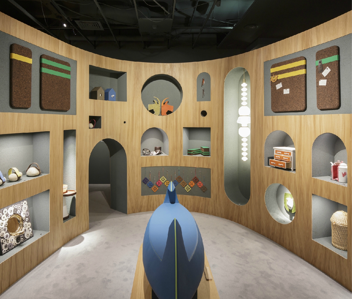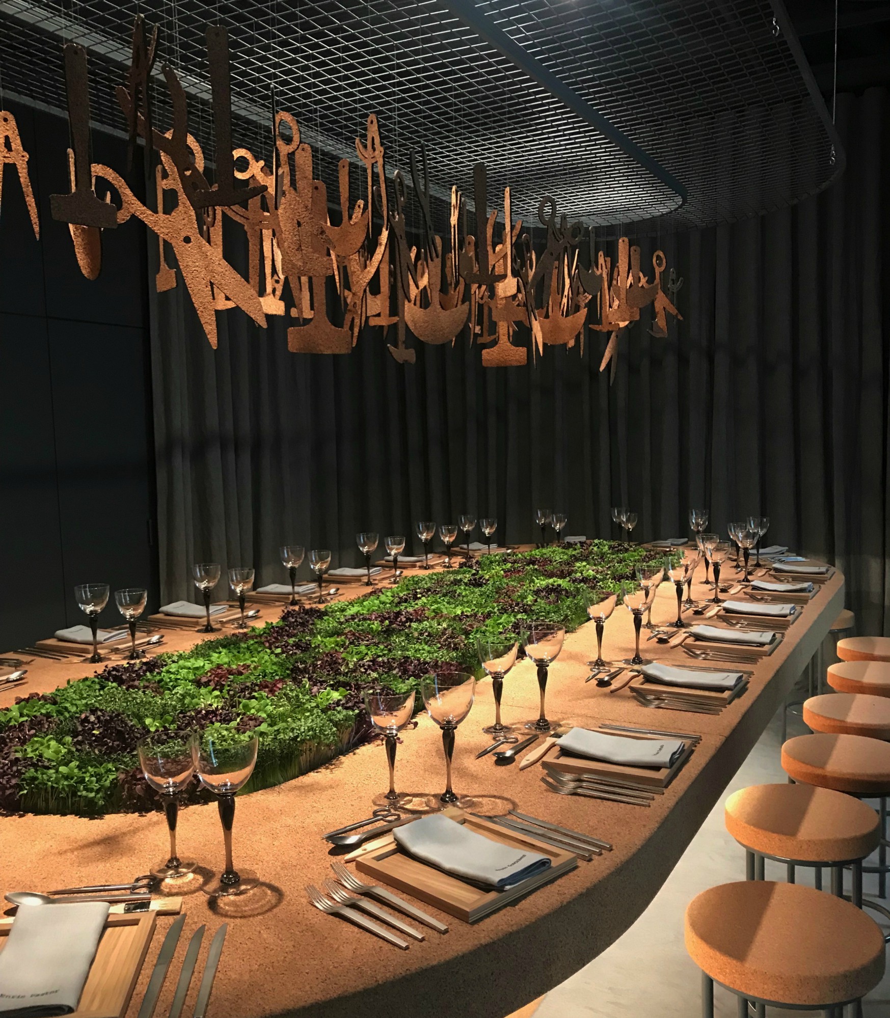 Passing outside of the ellipse, a visitor enters into the distinctively dramatic workshop area, which is backed by scenographic curtains to block out natural light and dominated by a monolithic custom-designed Portuguese heritage cork table. Above the table, a suspended grid echoes its shape and displays a collection of objects and tools (also made from cork) that recall the life and work of the craftsman.
