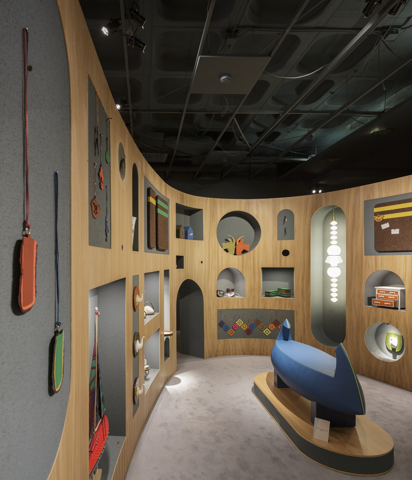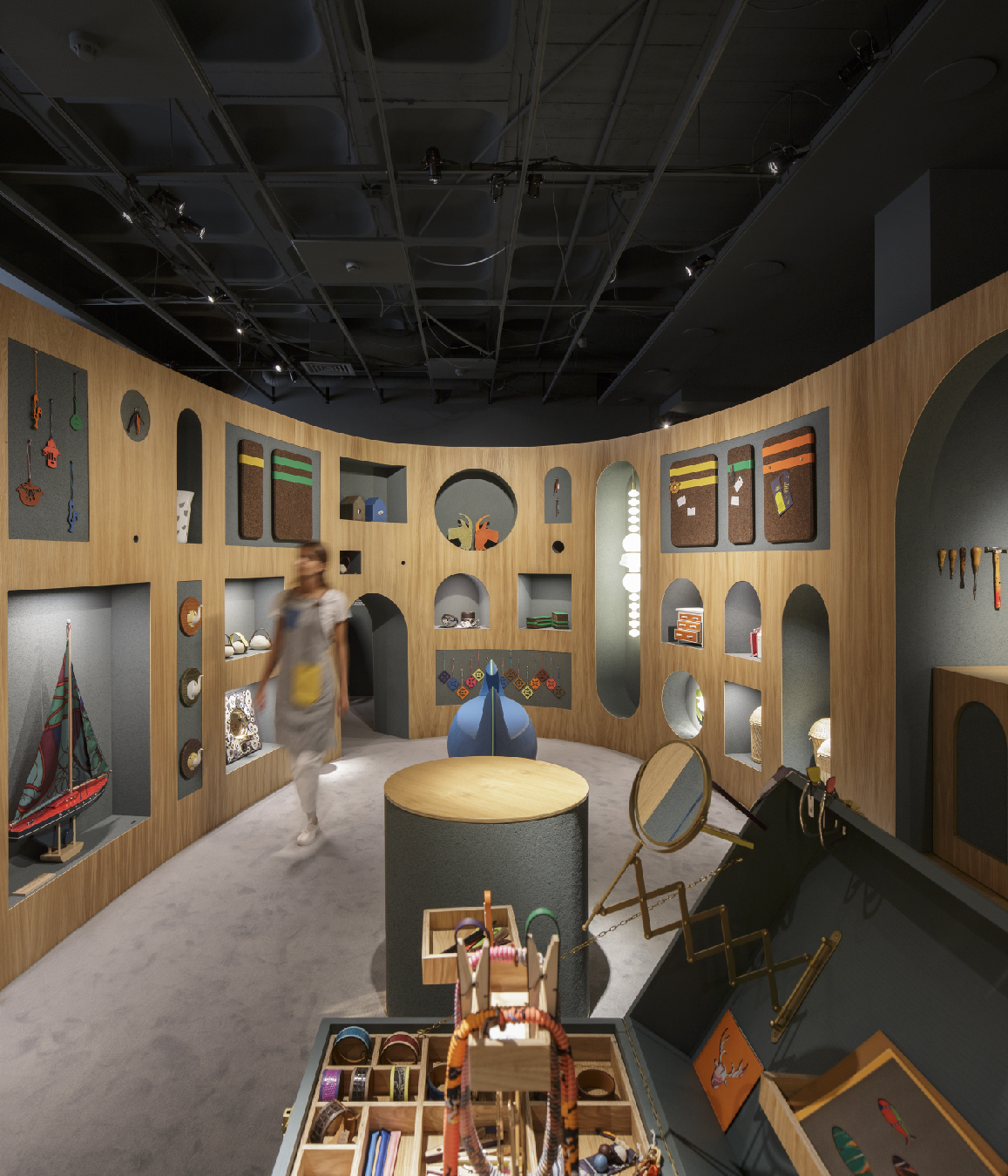The extant upper floor above the Chiado shop was a nondescript office space. We stripped down the ceiling, walls and floor, exposing all surfaces to start from scratch. Starting with a ground of dark slate blue for the walls and ceiling and a floor-carpet in a blend of wool and silk in light ash blue, we began to create cells of space-in-space from the inside out. The main focus is a three-dimensional, part-spiral ellipse constructed from a cork core with wood cladding and set into the center of the room, rising part way to the ceiling. From this base structure, in a subtractive construction process, we extracted arched openings, creating portals and niches and cubbies and peepholes, and then – in the minimal-waste spirit of Petit H – we then used the extracted cork-and-wood pieces to form pedestals, platforms, doors and shelves. Each niche was drawn to accommodate a specific product, all of them with different shapes and sizes. Doors, mirrors, and other elements open and close to reveal and conceal whimsical objects in a layered game of visibility and invisibility, offering and suggestion, seeing and discovery. Jewelry nestles into the nooks and crannies of a treasure trunk, which visitors can probe and explore by way of integrated lenses, magnifying glasses, mirrors and tantalizingly tiny drawers.