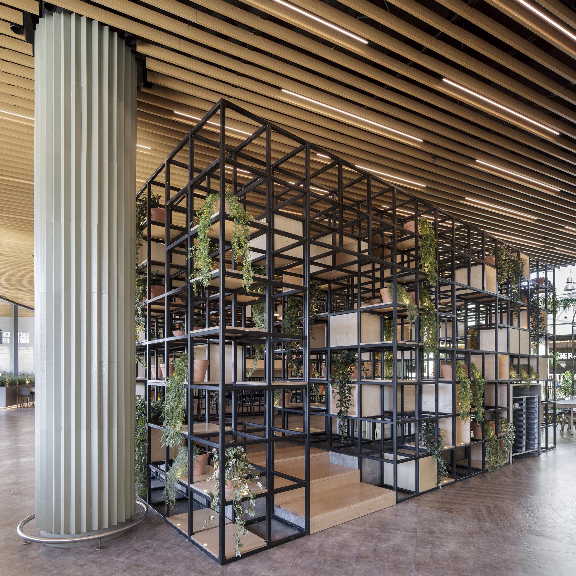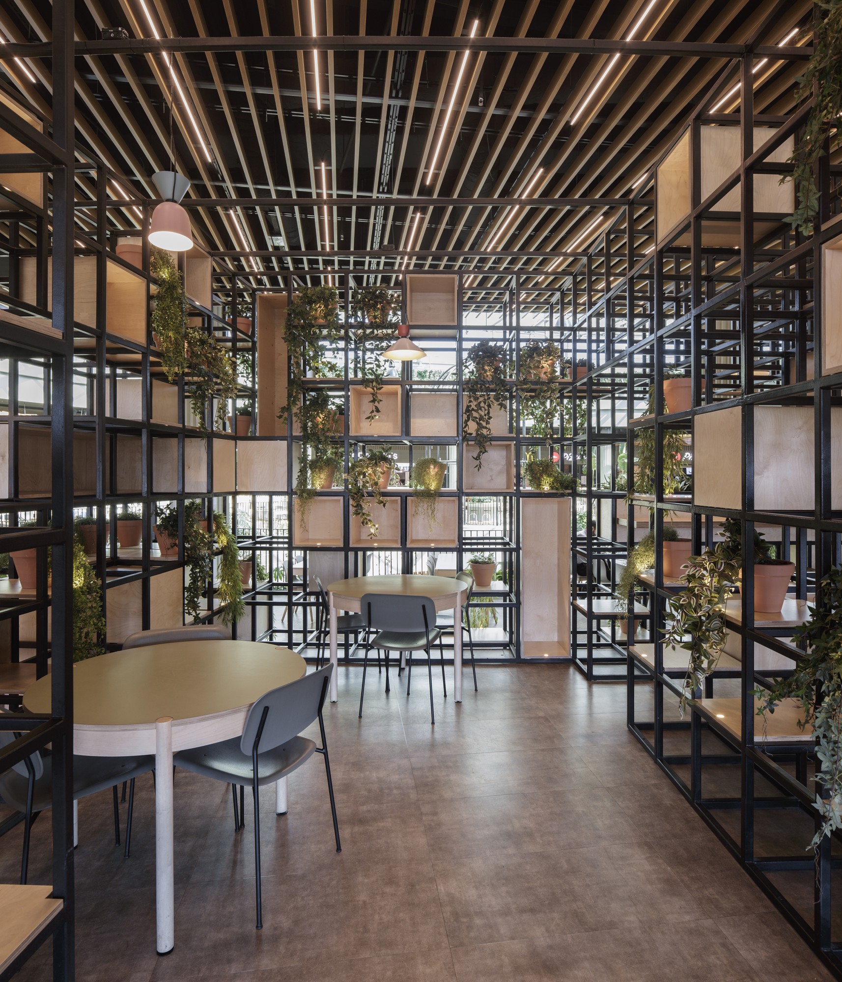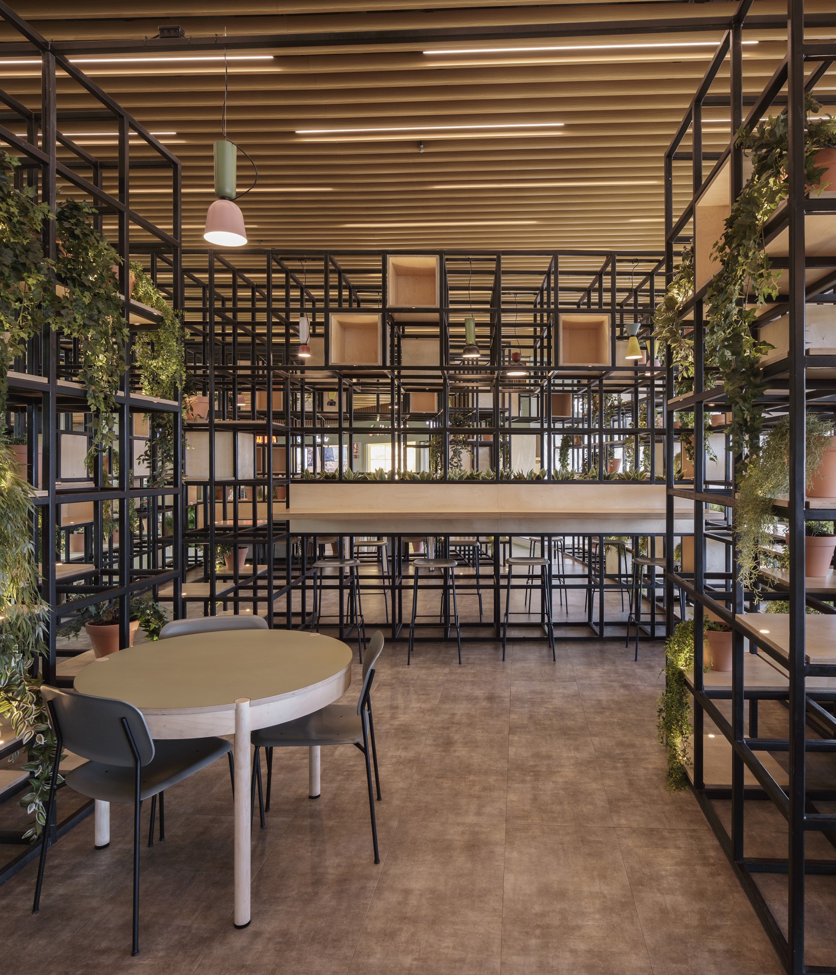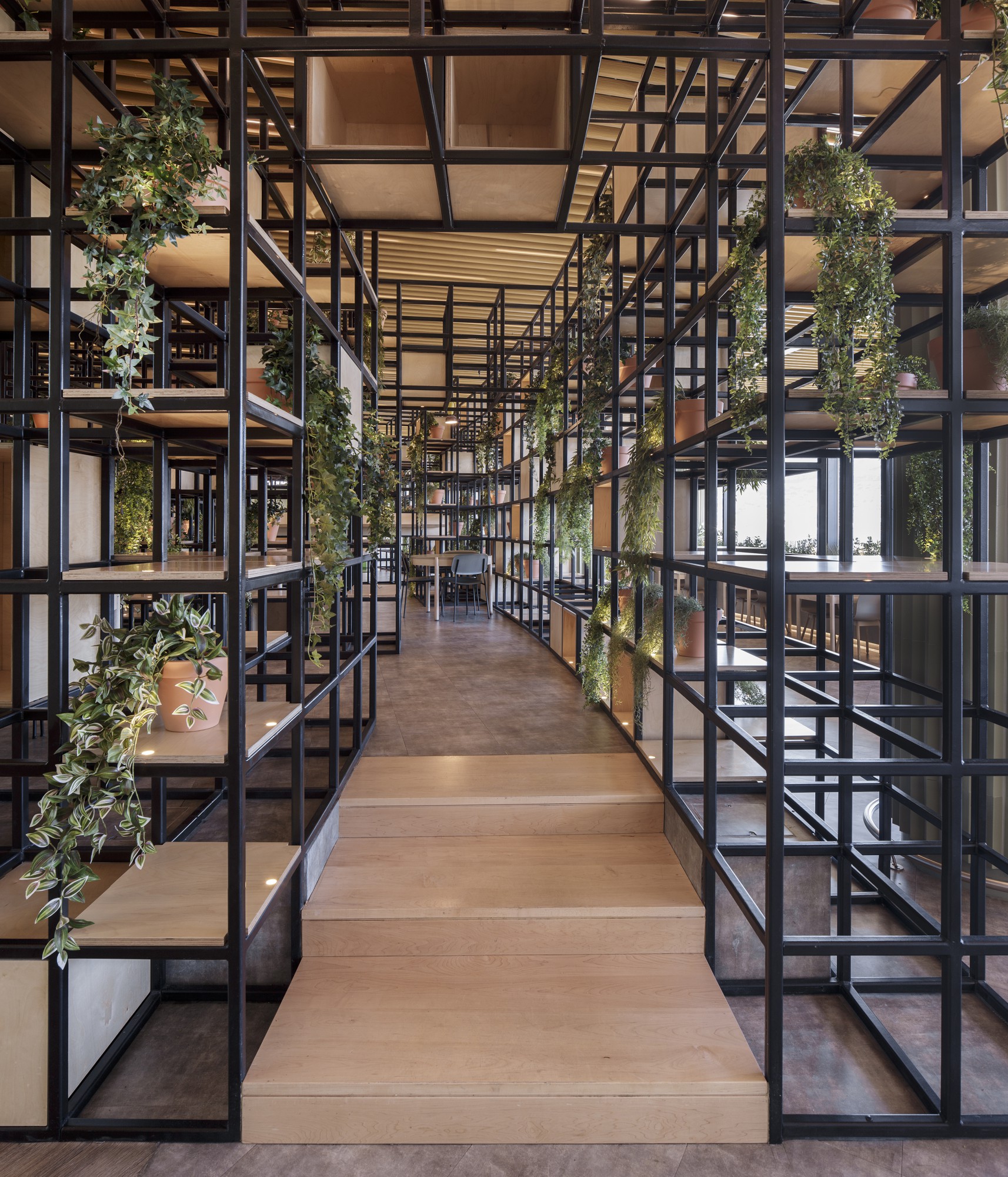 Fifty enormous vintage metal lamps, rescued from an old defunct factory, suspend from the soaring ceiling, and join low-set incorporated LED lighting to augment the sun during the day and provide a warm glow after dark. An enormous bird-cage, eight meters tall and wrought in black metal, hovers cantilevered above the main floor; within it, visitors can sit at a large round communal table that features a live olive tree at its core. A modular labyrinthine “greenhouse” provides further whimsy, inviting visitors to peek in and wander through a black-metal frame displaying thousands of movable and interchangeable potted plants. The final touch is an external terrace that spills into the open air. Here, integrated seating is lined with living plants, green metal lounge chairs provide a comfortable view, a wood pergola ceiling casts benevolent shade, and a thin-rod railing in black metal links the outdoor aesthetic to the indoor.