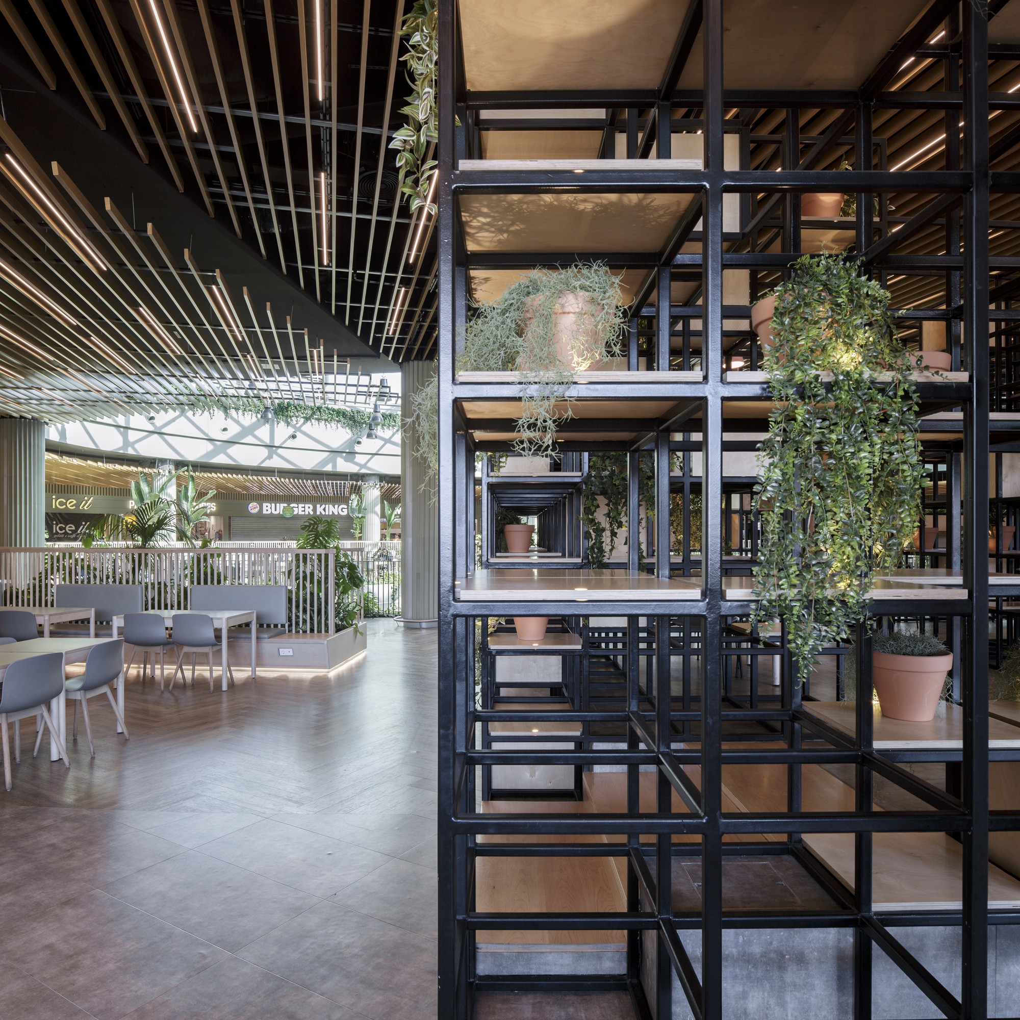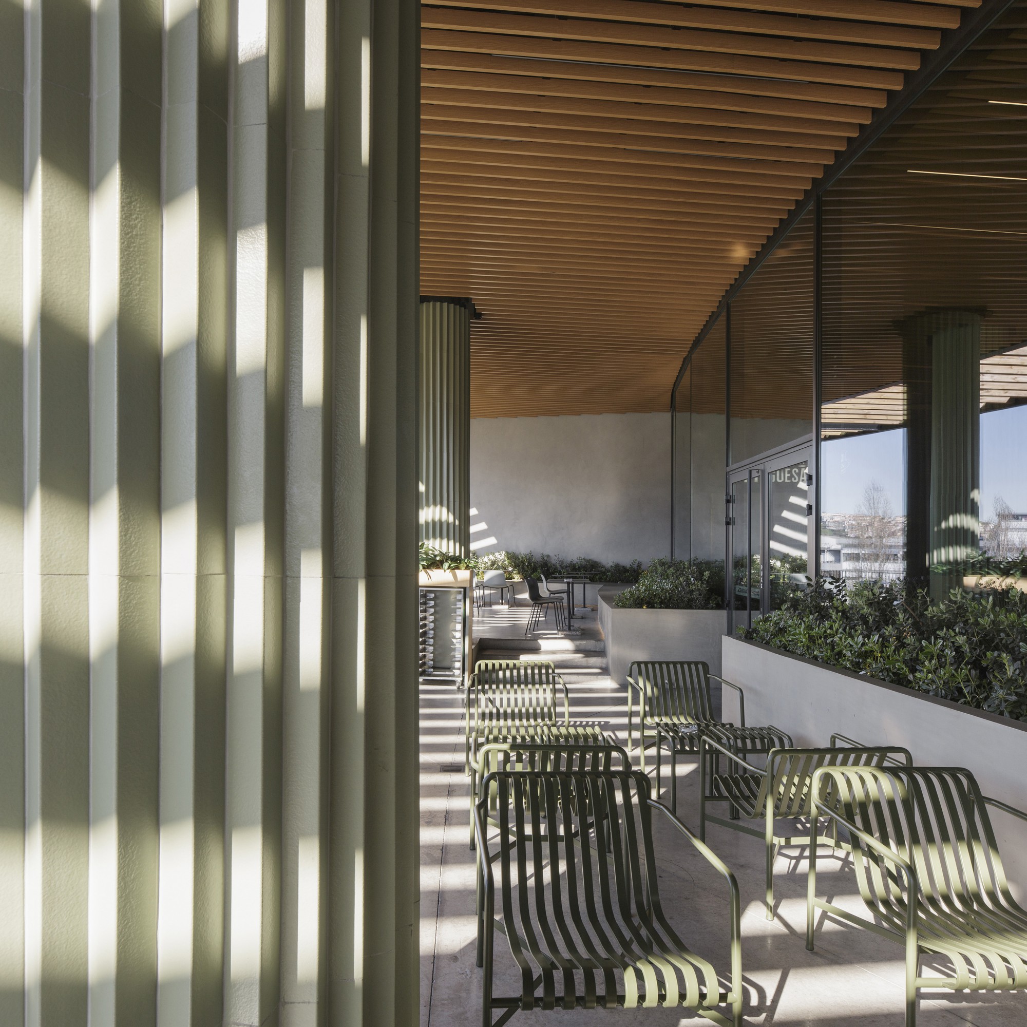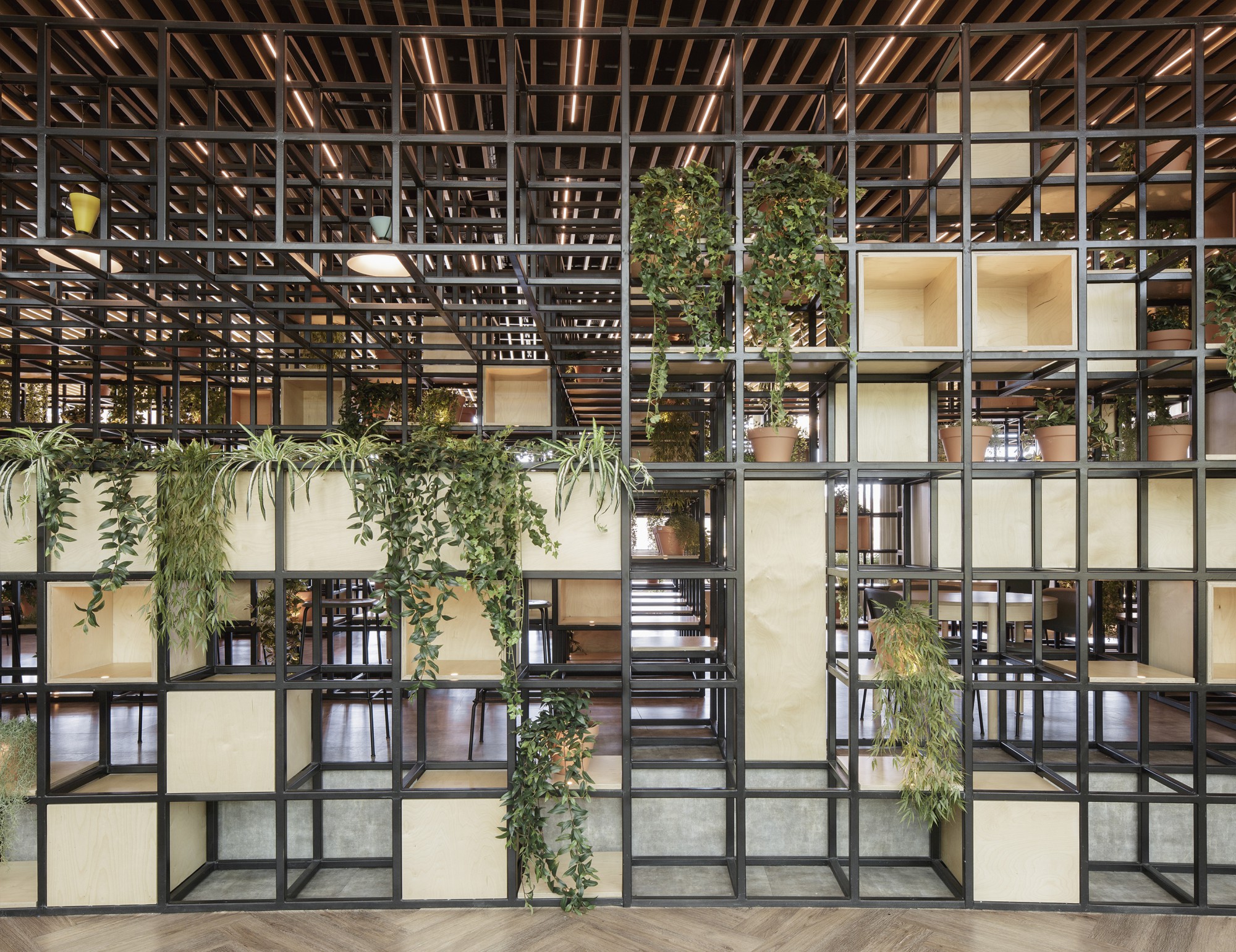 Fifty enormous vintage metal lamps, rescued from an old defunct factory, suspend from the soaring ceiling, and join low-set incorporated LED lighting to augment the sun during the day and provide a warm glow after dark. An enormous bird-cage, eight meters tall and wrought in black metal, hovers cantilevered above the main floor; within it, visitors can sit at a large round communal table that features a live olive tree at its core. A modular labyrinthine “greenhouse” provides further whimsy, inviting visitors to peek in and wander through a black-metal frame displaying thousands of movable and interchangeable potted plants. The final touch is an external terrace that spills into the open air. Here, integrated seating is lined with living plants, green metal lounge chairs provide a comfortable view, a wood pergola ceiling casts benevolent shade, and a thin-rod railing in black metal links the outdoor aesthetic to the indoor.