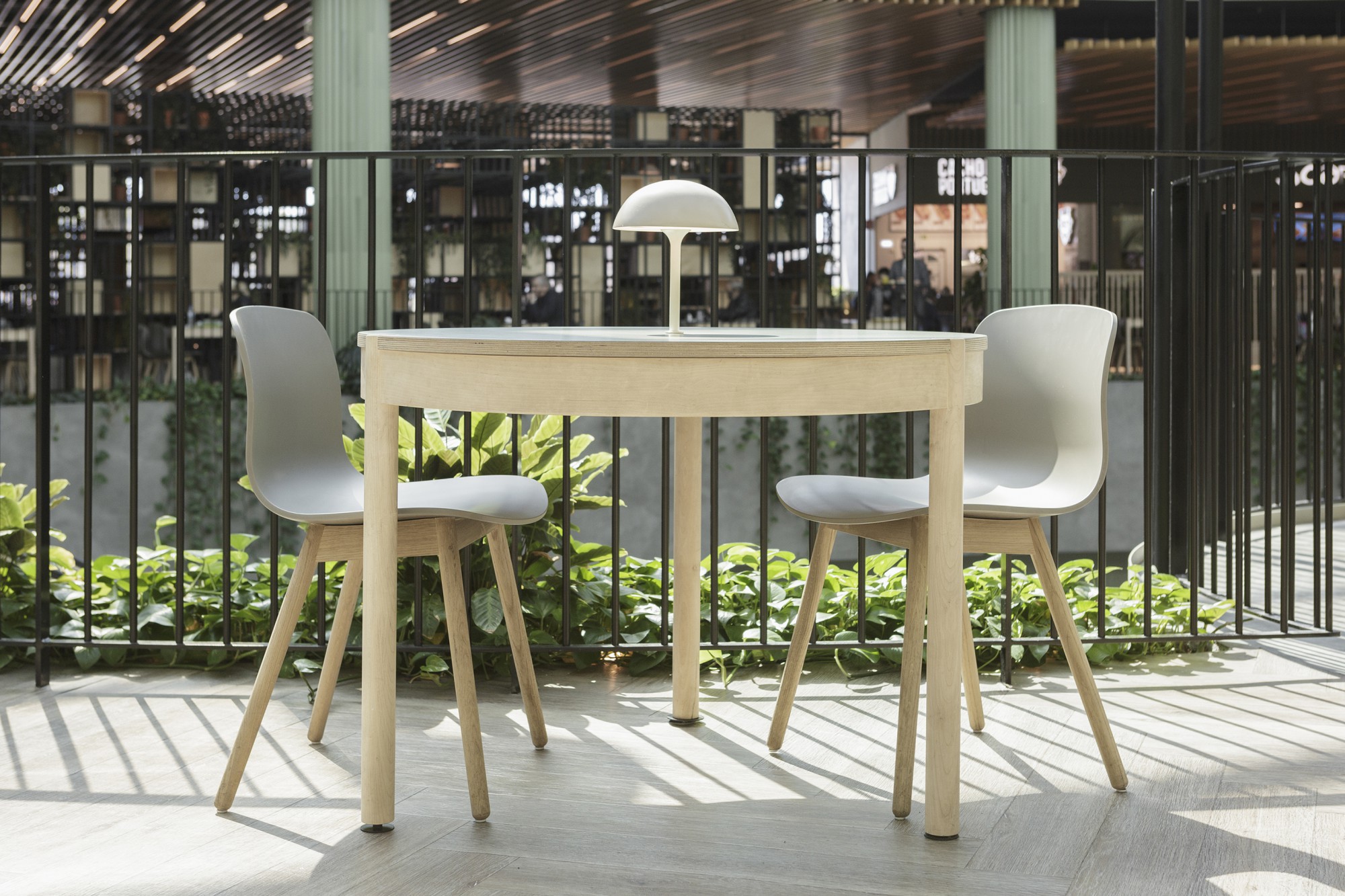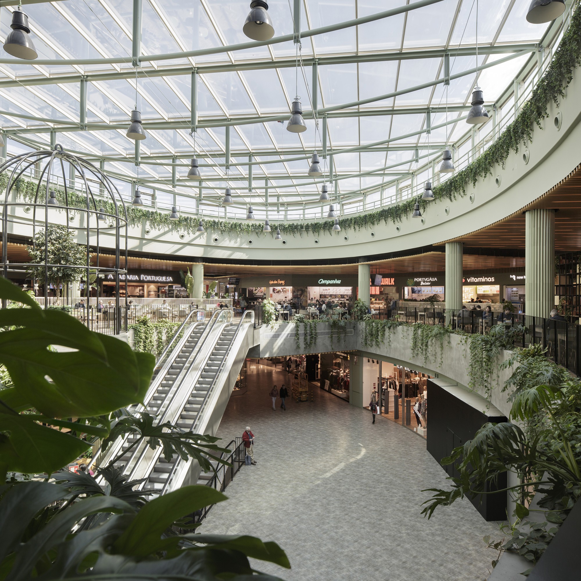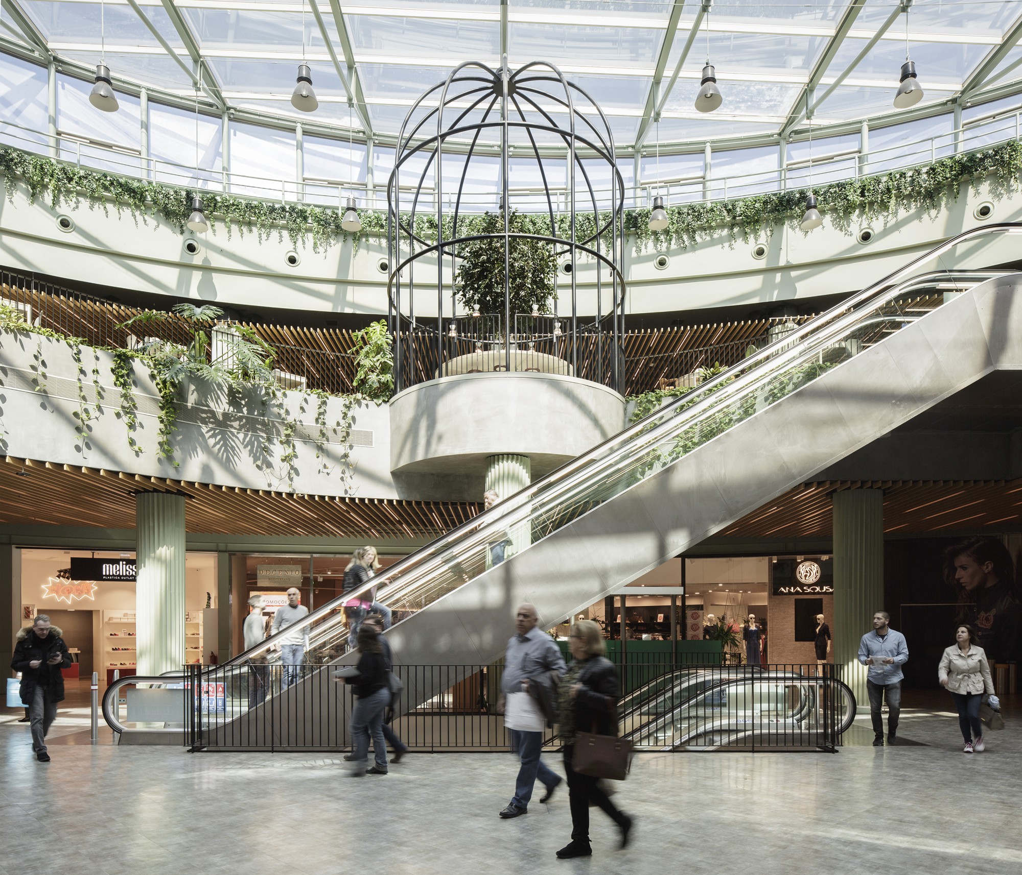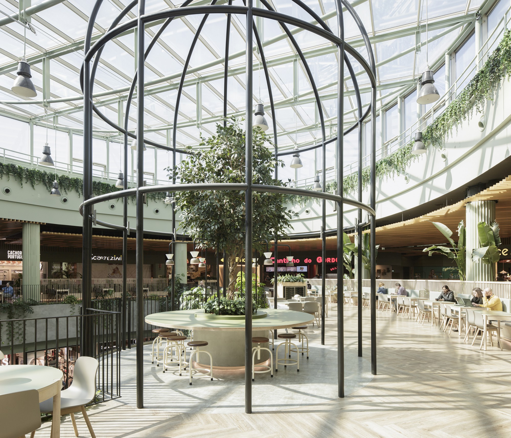 Fifty enormous vintage metal lamps, rescued from an old defunct factory, suspend from the soaring ceiling, and join low-set incorporated LED lighting to augment the sun during the day and provide a warm glow after dark. An enormous bird-cage, eight meters tall and wrought in black metal, hovers cantilevered above the main floor; within it, visitors can sit at a large round communal table that features a live olive tree at its core. A modular labyrinthine “greenhouse” provides further whimsy, inviting visitors to peek in and wander through a black-metal frame displaying thousands of movable and interchangeable potted plants. The final touch is an external terrace that spills into the open air. Here, integrated seating is lined with living plants, green metal lounge chairs provide a comfortable view, a wood pergola ceiling casts benevolent shade, and a thin-rod railing in black metal links the outdoor aesthetic to the indoor.