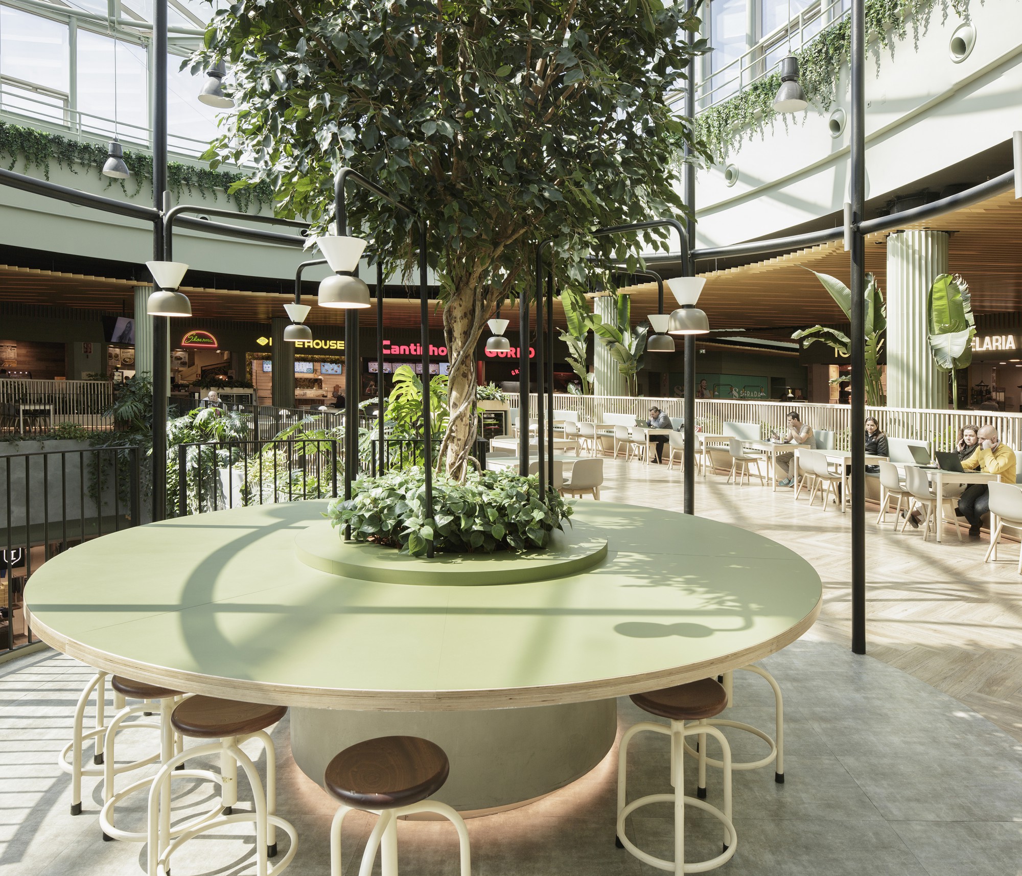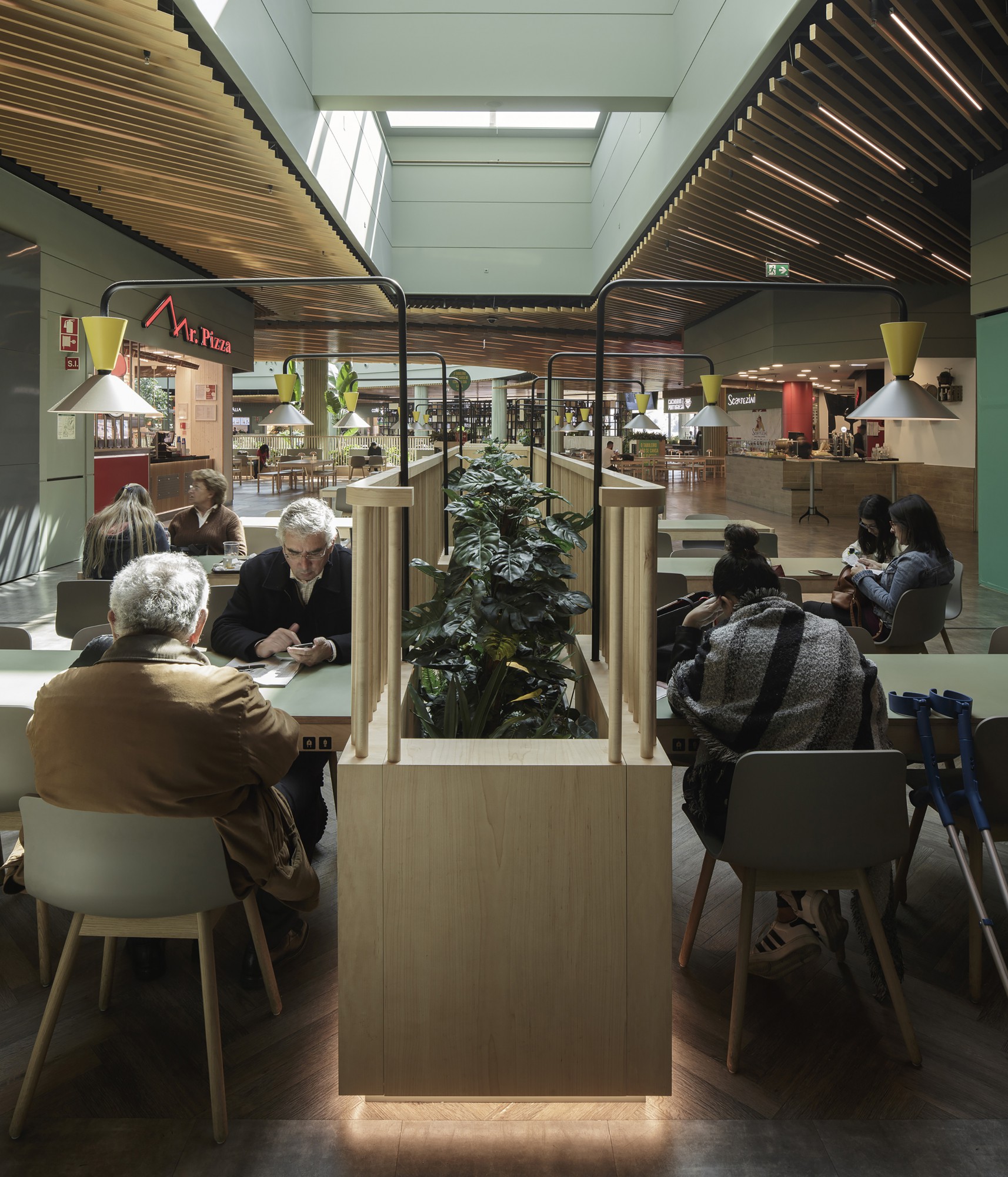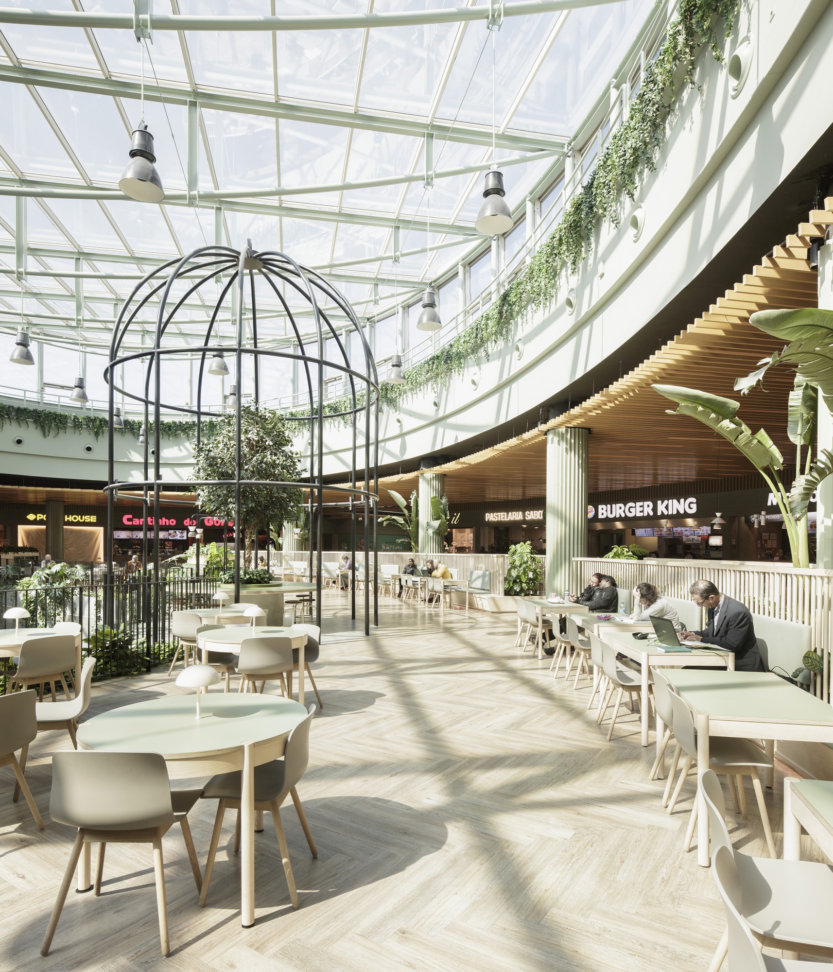 The cavernous, 2000-square-meter culinary court at Strada, arranged over mezzanined levels that flow together in a large atrium, was a top-to-bottom renovation challenge. We took the opportunity to transform this static skeleton – cold, dull, and soulless – into a lush, verdant and seductive series of areas that invites the visitor to explore, to settle in, and to stay. A preexisting glass roof provides a sky-like expanse of natural light all day long, so it was only natural to transform the court into a tropical jungle that infuses the space with air and with life, both literally and figuratively. The base palette relies upon white oak wood with its tones of birch and bone; a full spectrum of lichen, moss and sage greens; and structural accents of dark matte metal. We designed subsidiary spaces that set themselves off from one another, like distinct cells within a living body, by using the careful arrangement of custom-built tables and benches in white oak and formica, pillars clad in organic clay tiles, planters overflowing with live greenery, and flowering balustrades. Thus the main cavern is cleverly divided into spaces-in-space, like matryoshka nesting dolls that tuck into and emerge from one another as the visitor moves through to choose the space that feels most comfortable for her. Some zones are brighter and others are darker; some offer seating that cuddles into hidden corners while others offer an open view perfect for seeing and being seen.