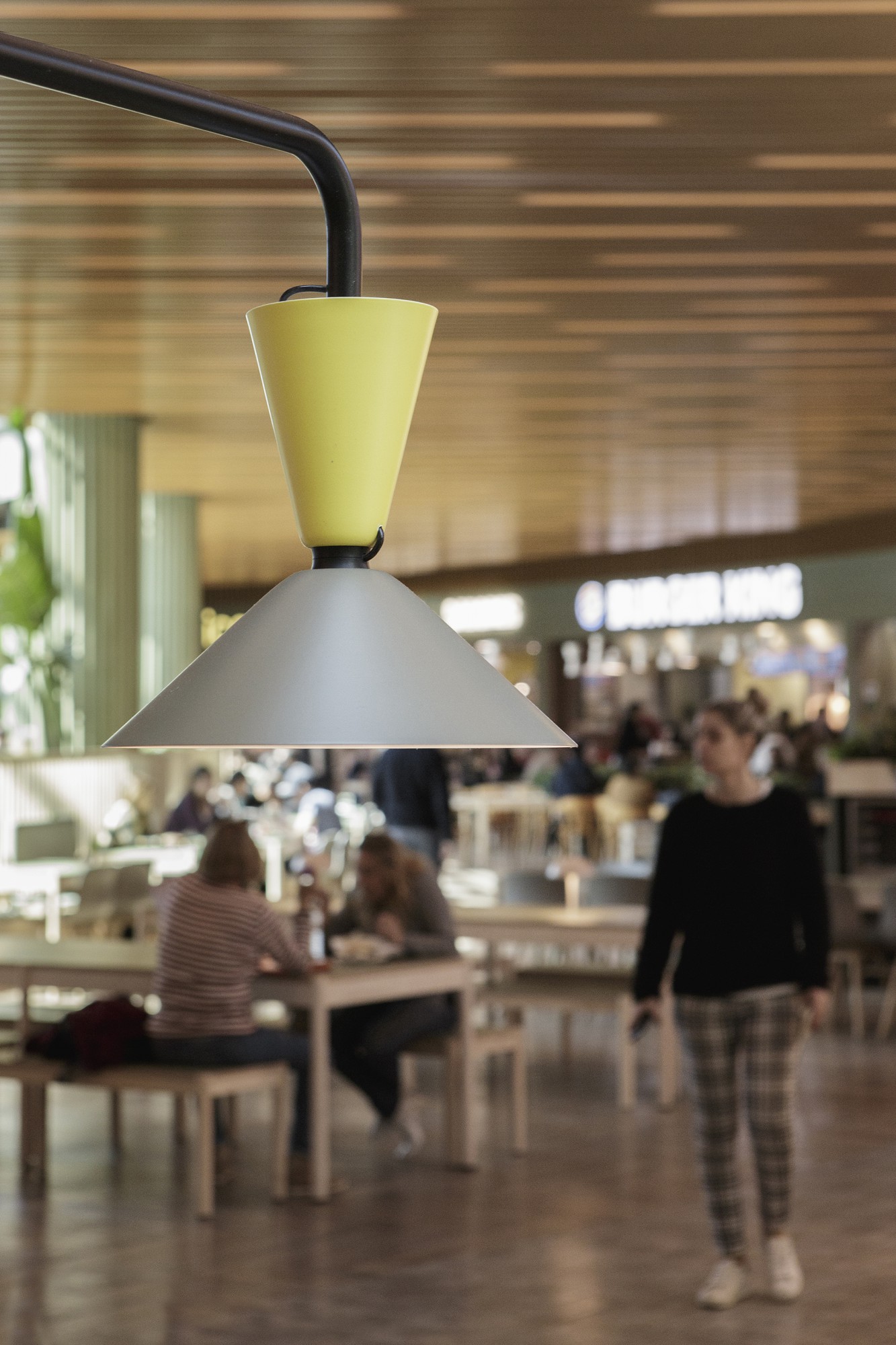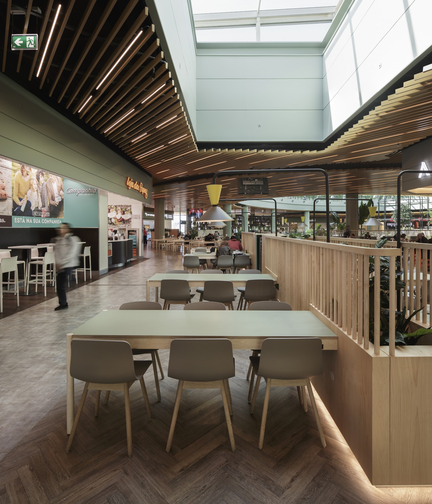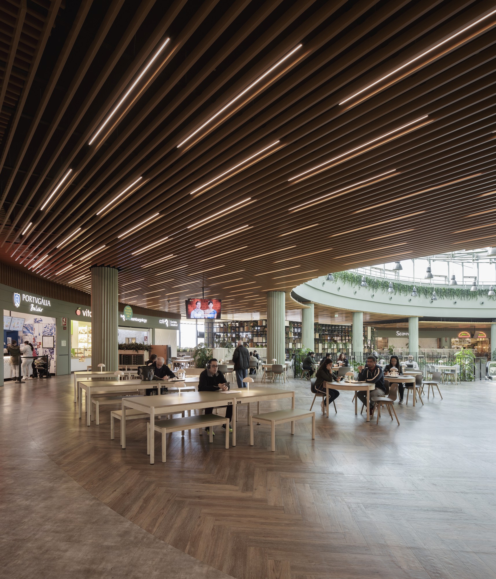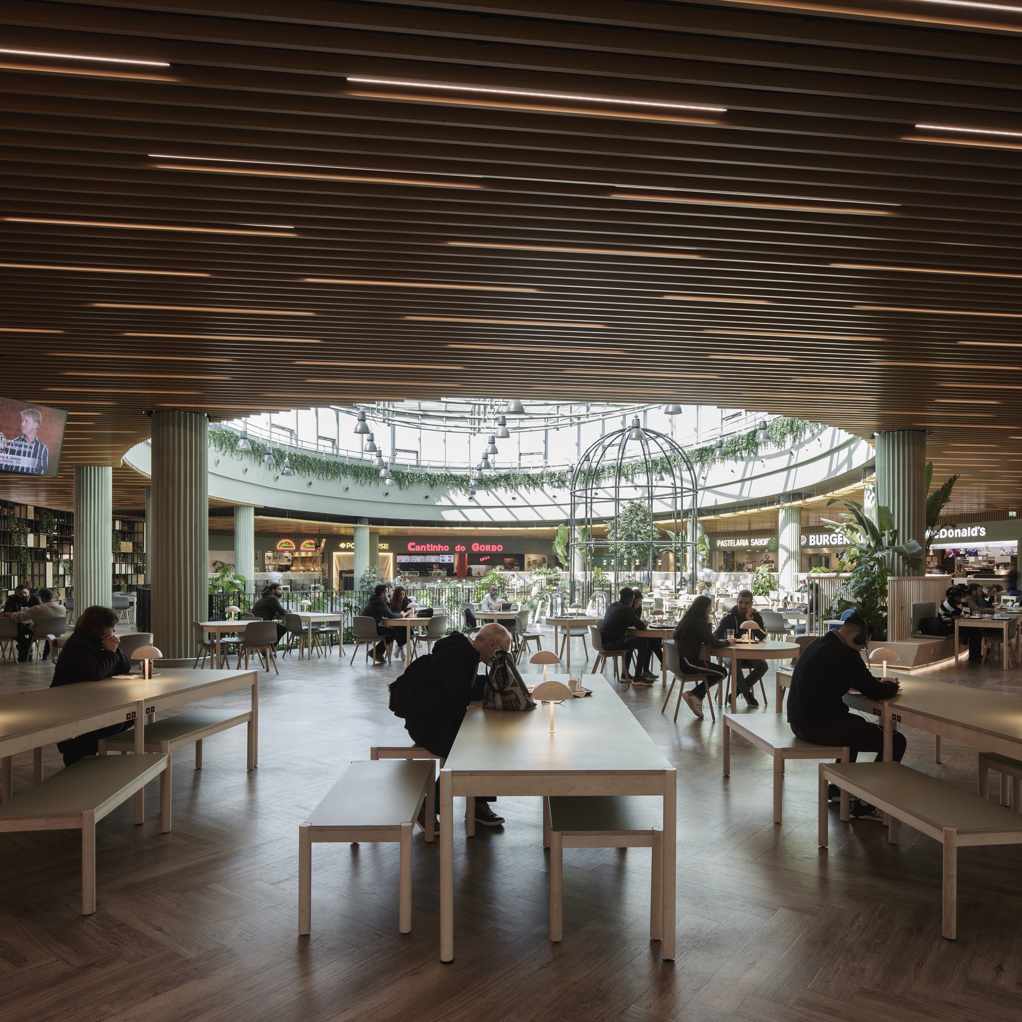 The cavernous, 2000-square-meter culinary court at Strada, arranged over mezzanined levels that flow together in a large atrium, was a top-to-bottom renovation challenge. We took the opportunity to transform this static skeleton – cold, dull, and soulless – into a lush, verdant and seductive series of areas that invites the visitor to explore, to settle in, and to stay. A preexisting glass roof provides a sky-like expanse of natural light all day long, so it was only natural to transform the court into a tropical jungle that infuses the space with air and with life, both literally and figuratively. The base palette relies upon white oak wood with its tones of birch and bone; a full spectrum of lichen, moss and sage greens; and structural accents of dark matte metal. We designed subsidiary spaces that set themselves off from one another, like distinct cells within a living body, by using the careful arrangement of custom-built tables and benches in white oak and formica, pillars clad in organic clay tiles, planters overflowing with live greenery, and flowering balustrades. Thus the main cavern is cleverly divided into spaces-in-space, like matryoshka nesting dolls that tuck into and emerge from one another as the visitor moves through to choose the space that feels most comfortable for her. Some zones are brighter and others are darker; some offer seating that cuddles into hidden corners while others offer an open view perfect for seeing and being seen.