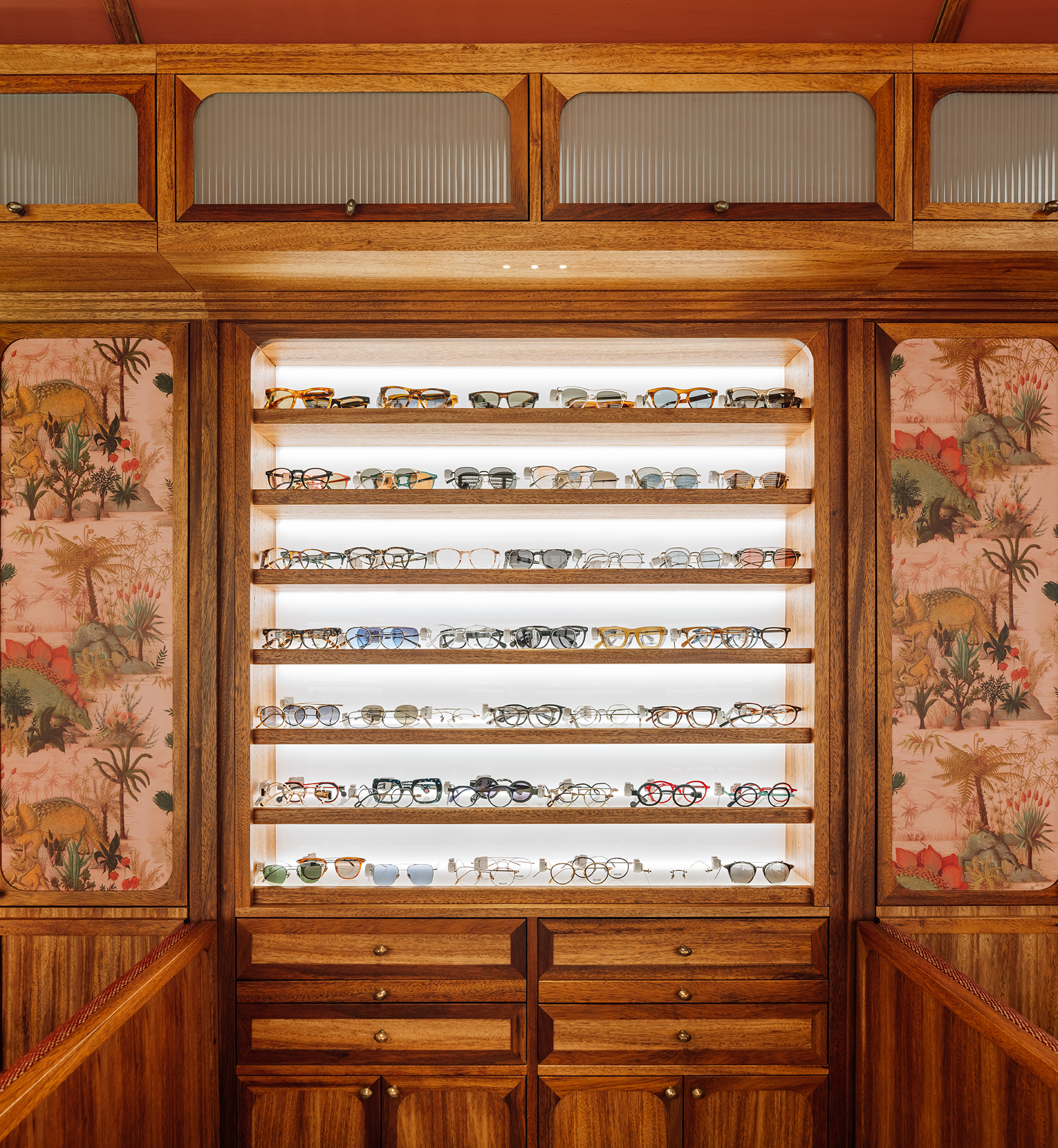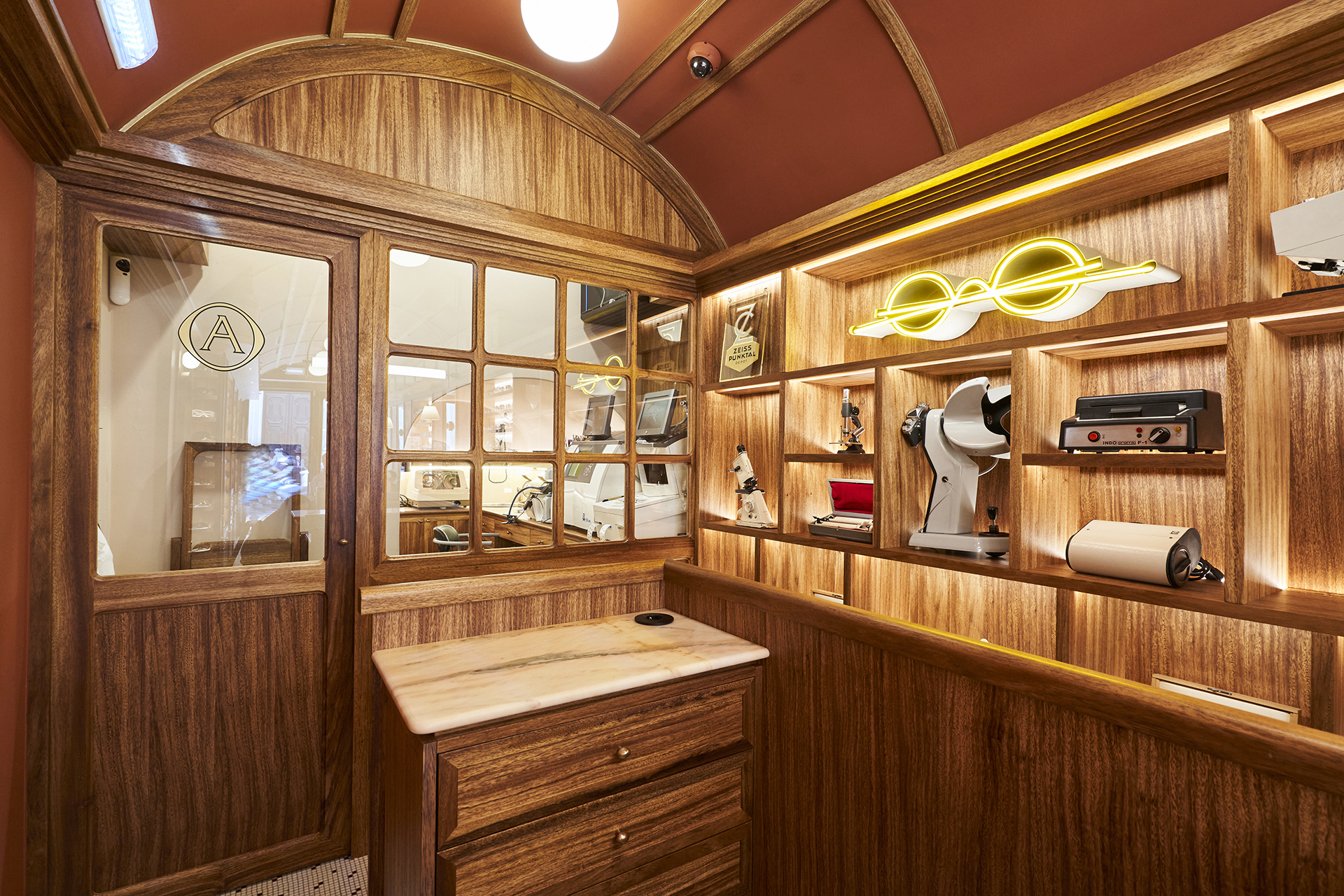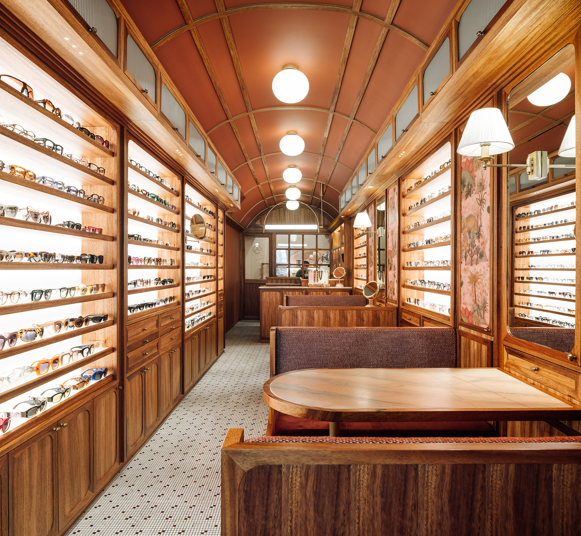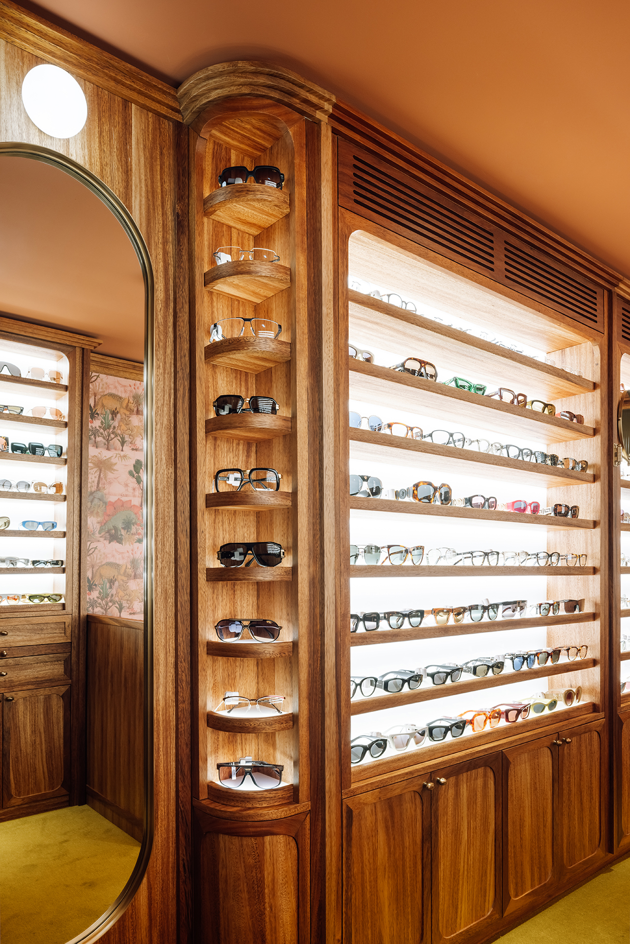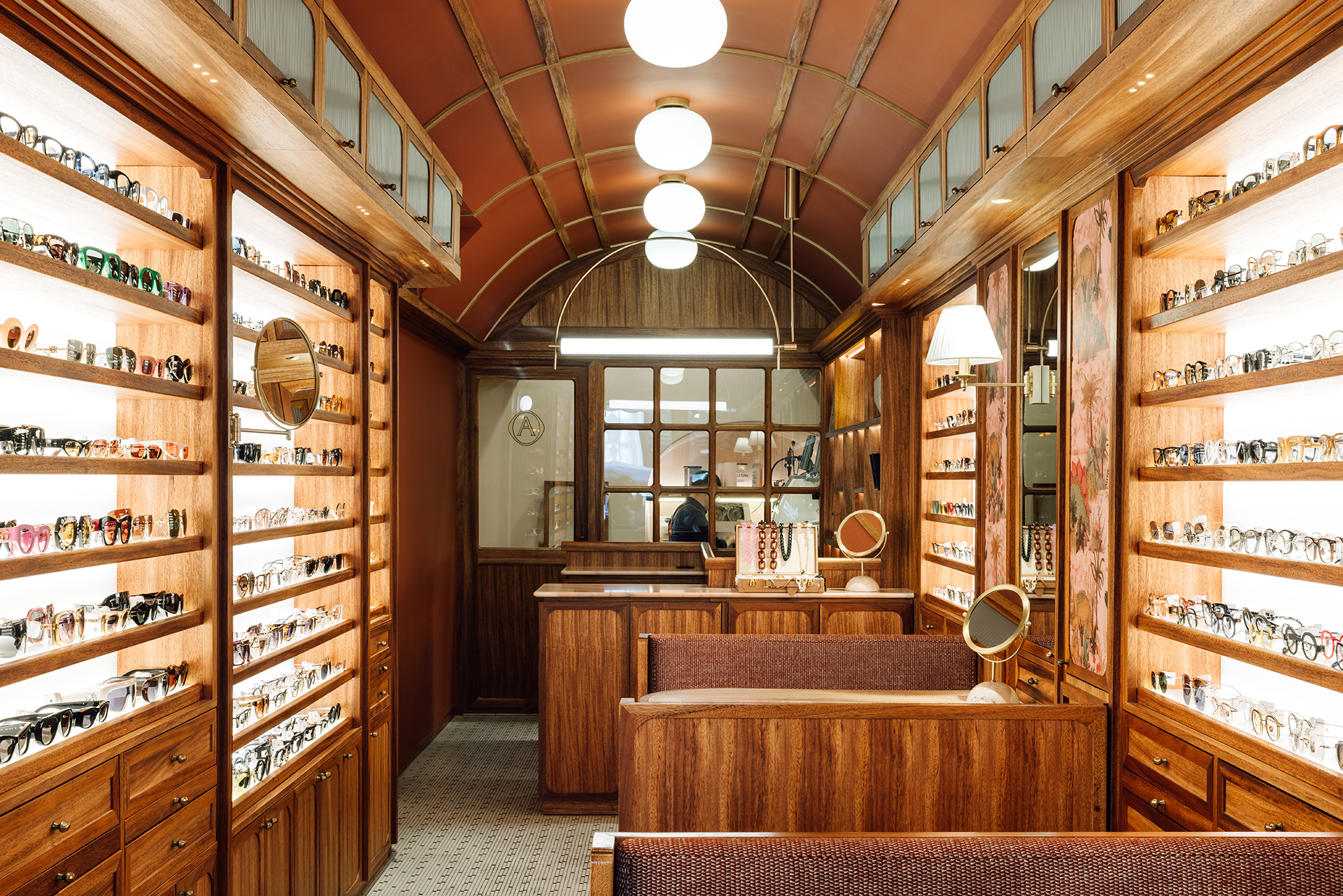 Studio Astolfi conceived and constructed a vast, whimsical “cabinet of curiosities” that wraps around the boutique like a second skin. Inside, vintage and modern spectacles are nestled among curious treasures: taxidermy pieces, antique optometry tools, and mysterious gadgets. The cabinet itself is a playground of surprise—drawers transform into tables, vertical compartments reveal hidden spectacles, and display surfaces appear as needed. Every element, from lighting to mirrors, was handcrafted to perfectly merge form with function.
