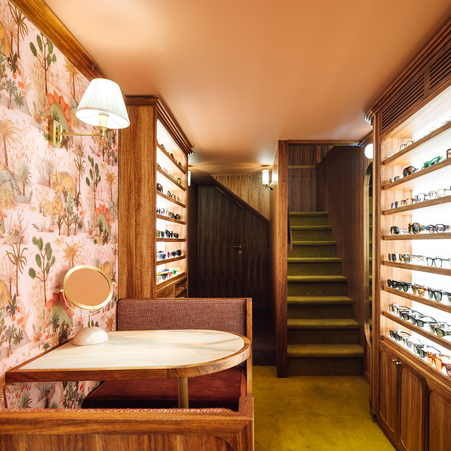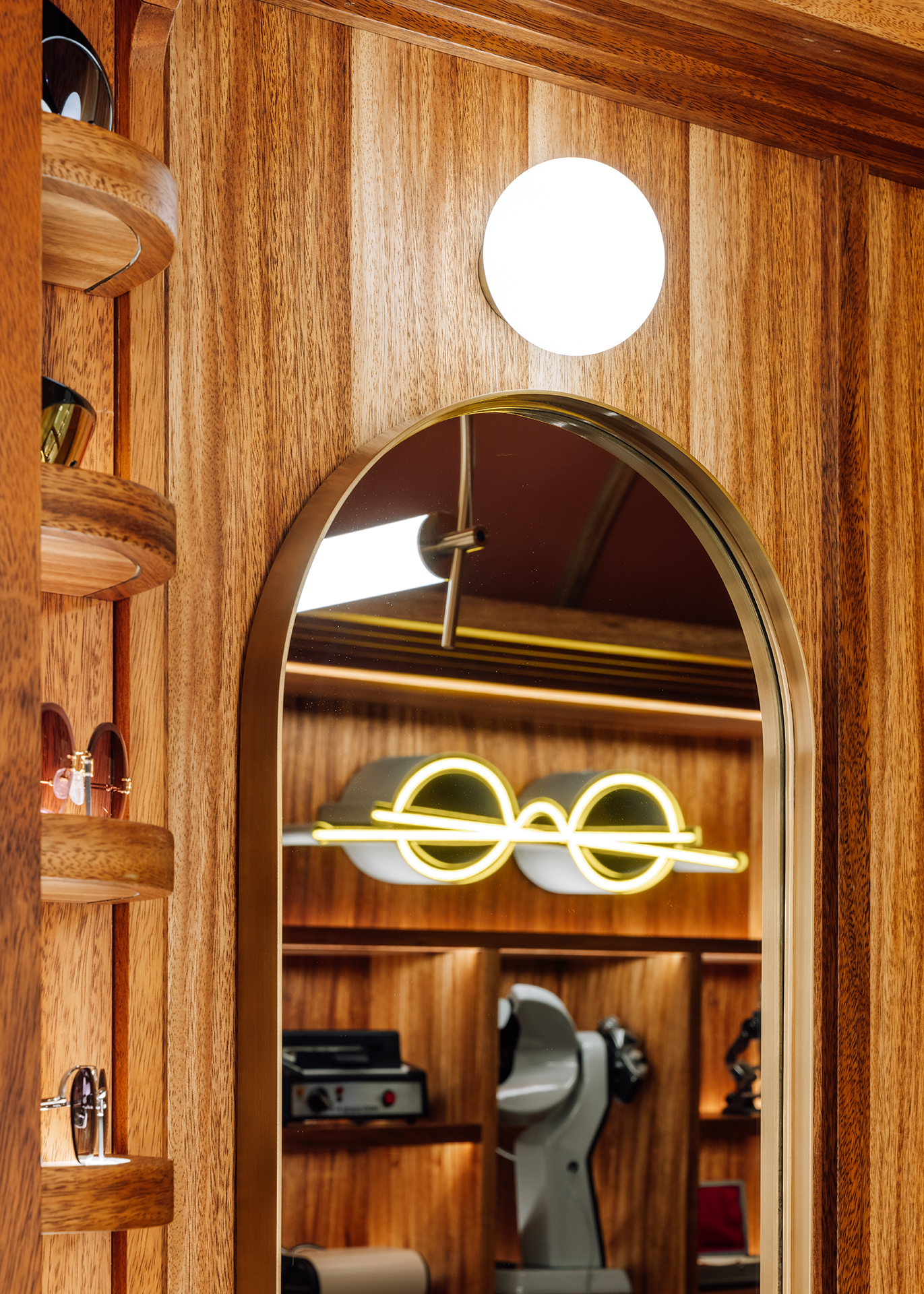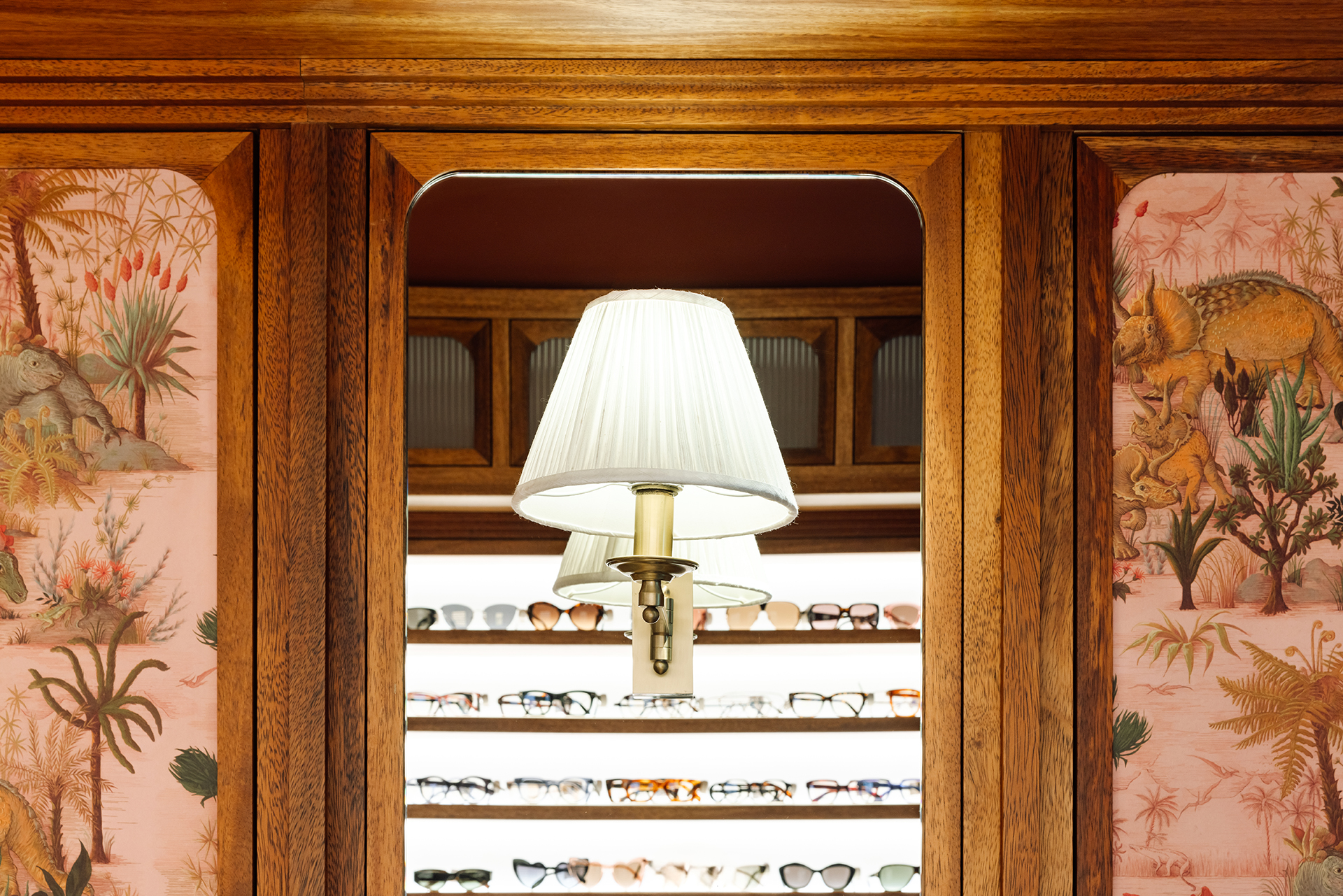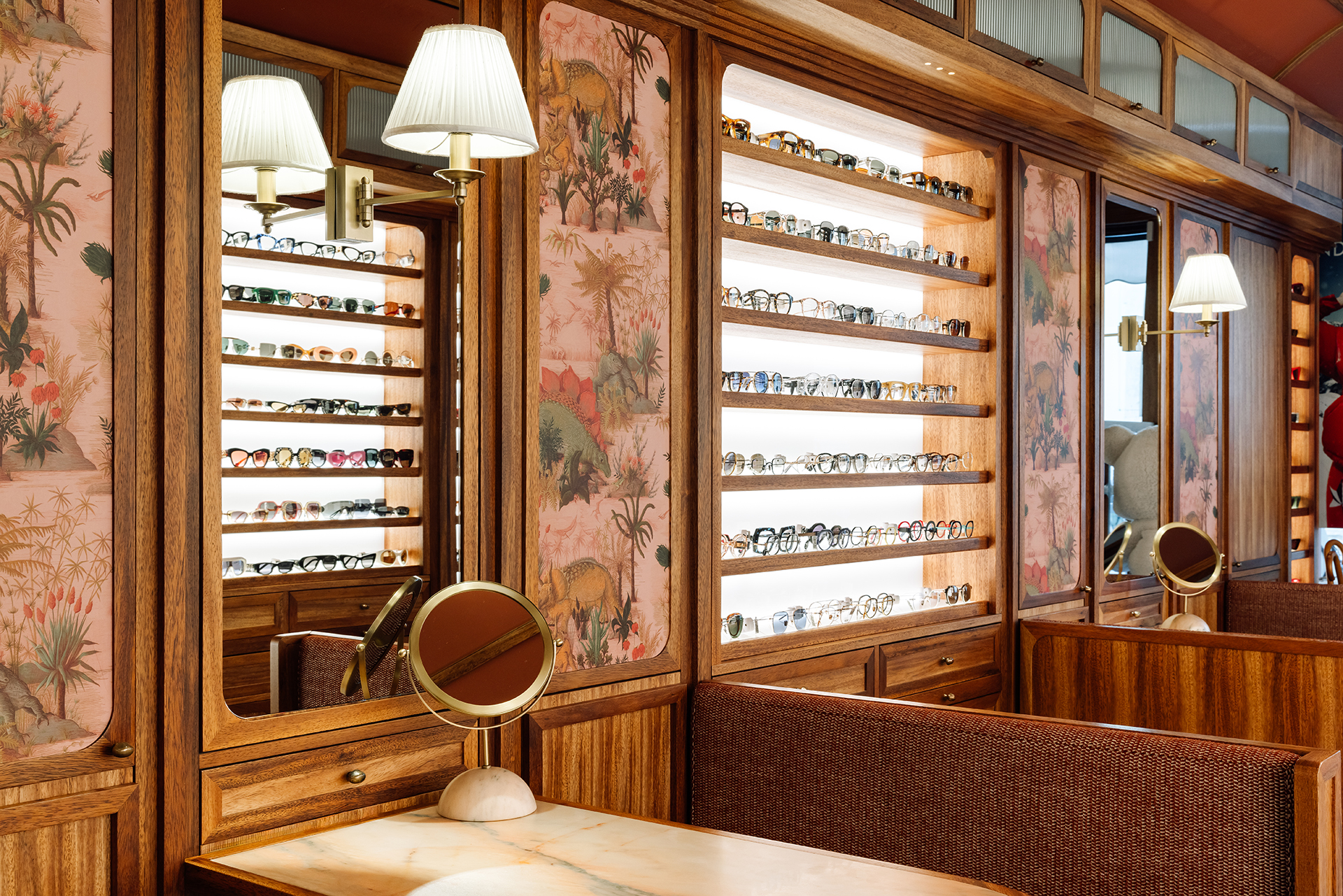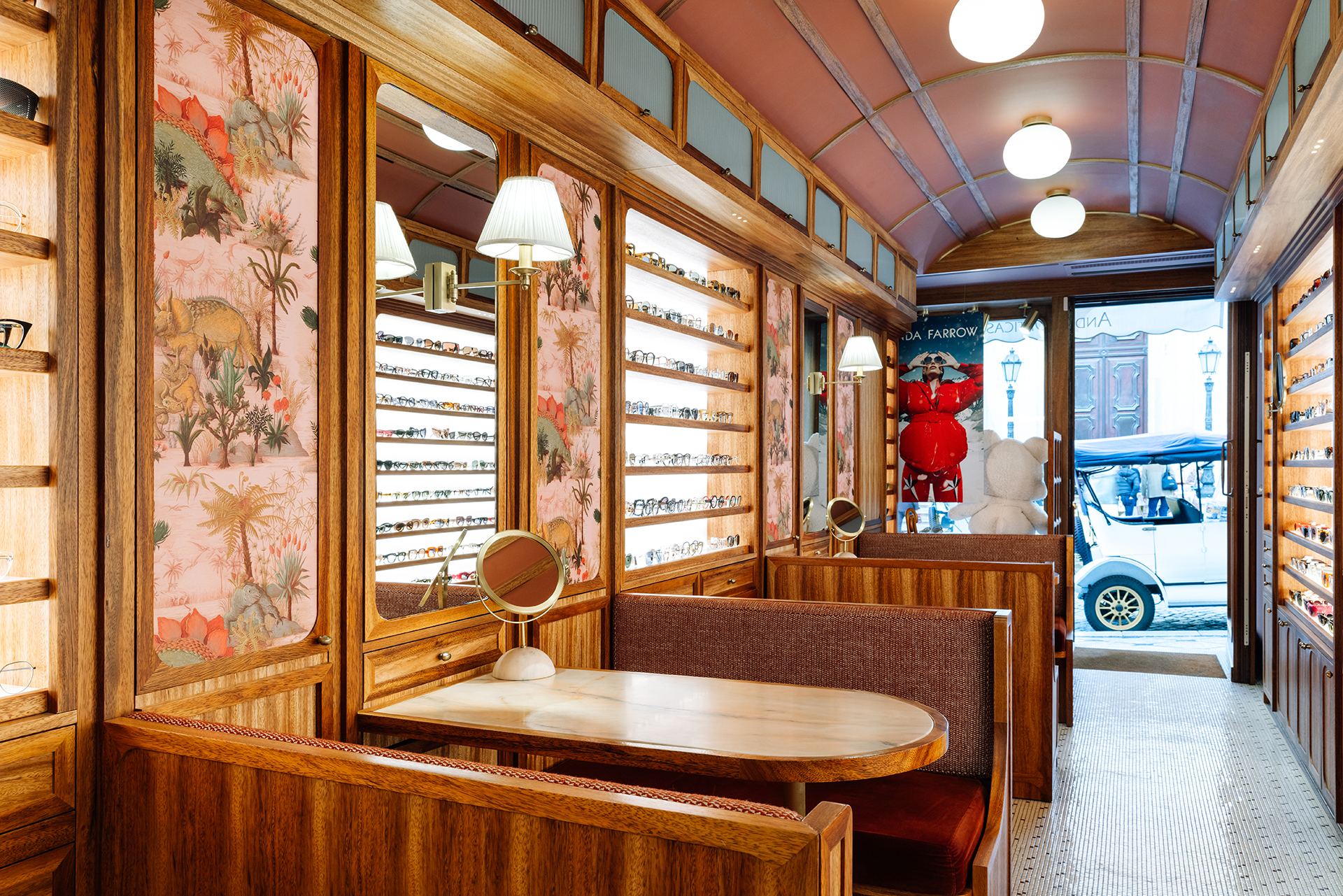 Studio Astolfi conceived and constructed a vast, whimsical “cabinet of curiosities” that wraps around the boutique like a second skin. Inside, vintage and modern spectacles are nestled among curious treasures: taxidermy pieces, antique optometry tools, and mysterious gadgets. The cabinet itself is a playground of surprise—drawers transform into tables, vertical compartments reveal hidden spectacles, and display surfaces appear as needed. Every element, from lighting to mirrors, was handcrafted to perfectly merge form with function.