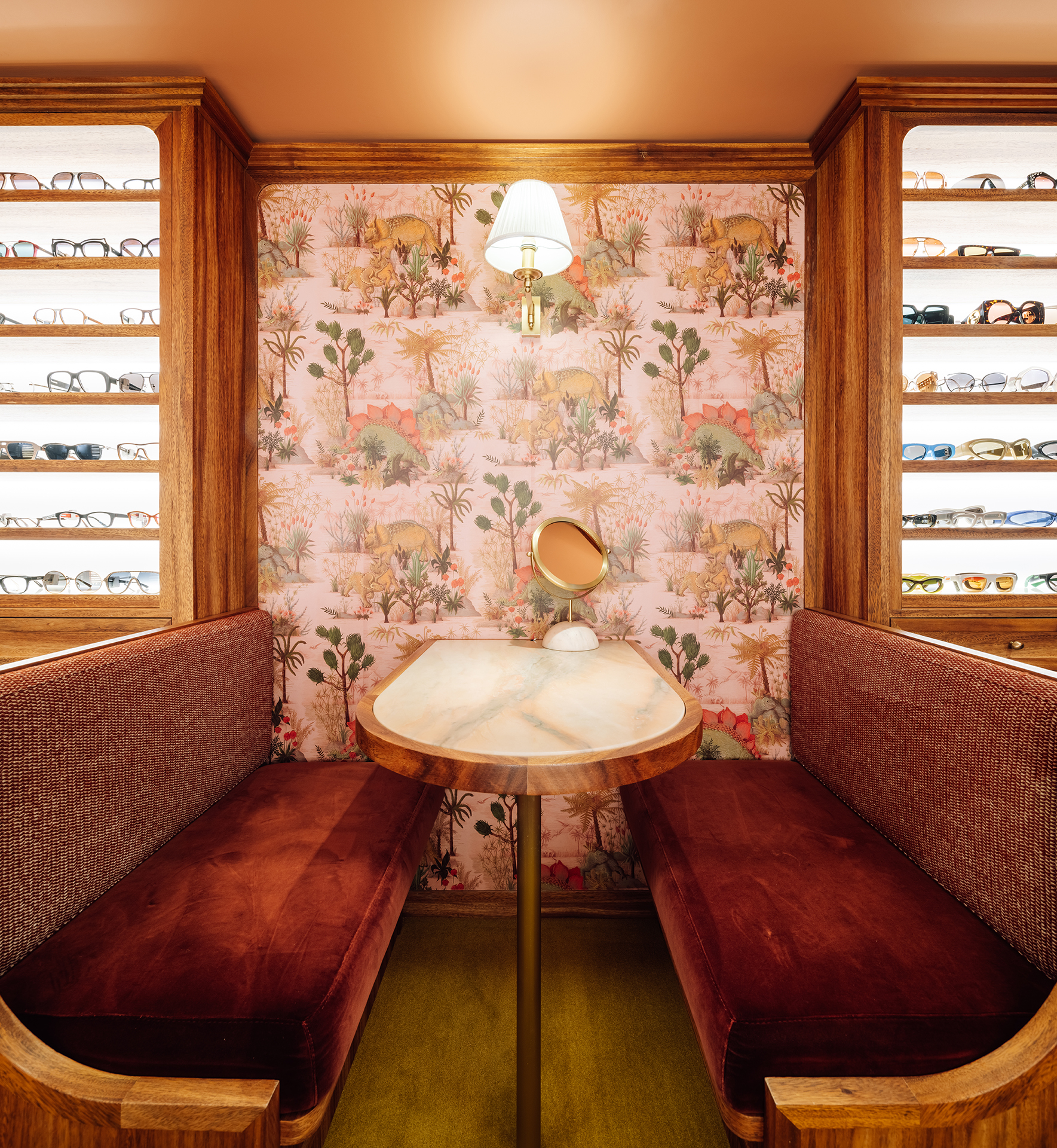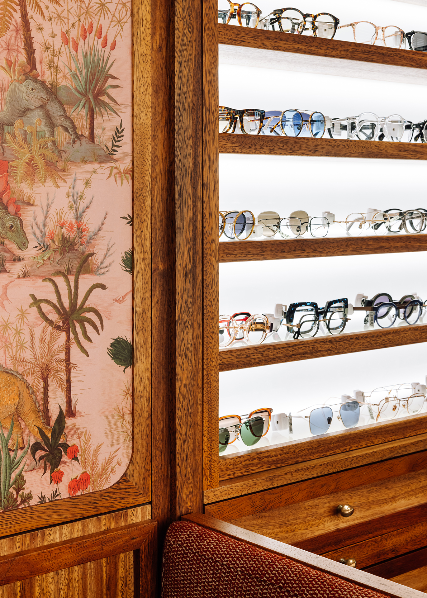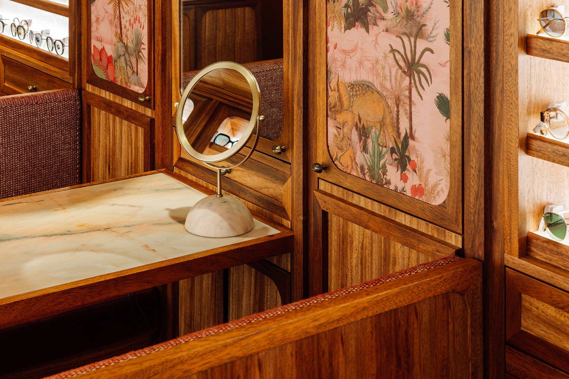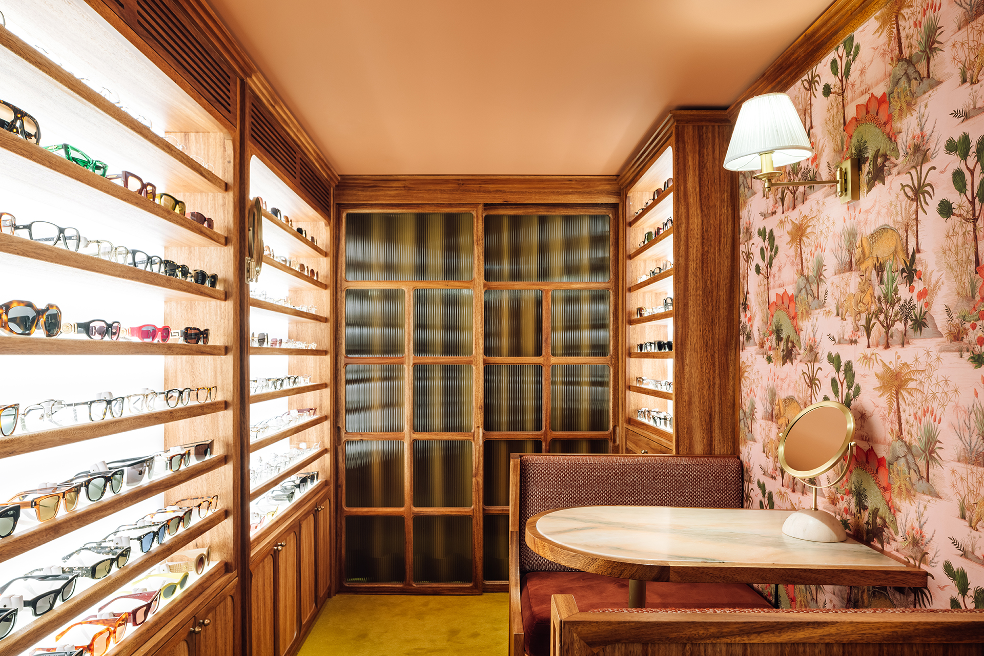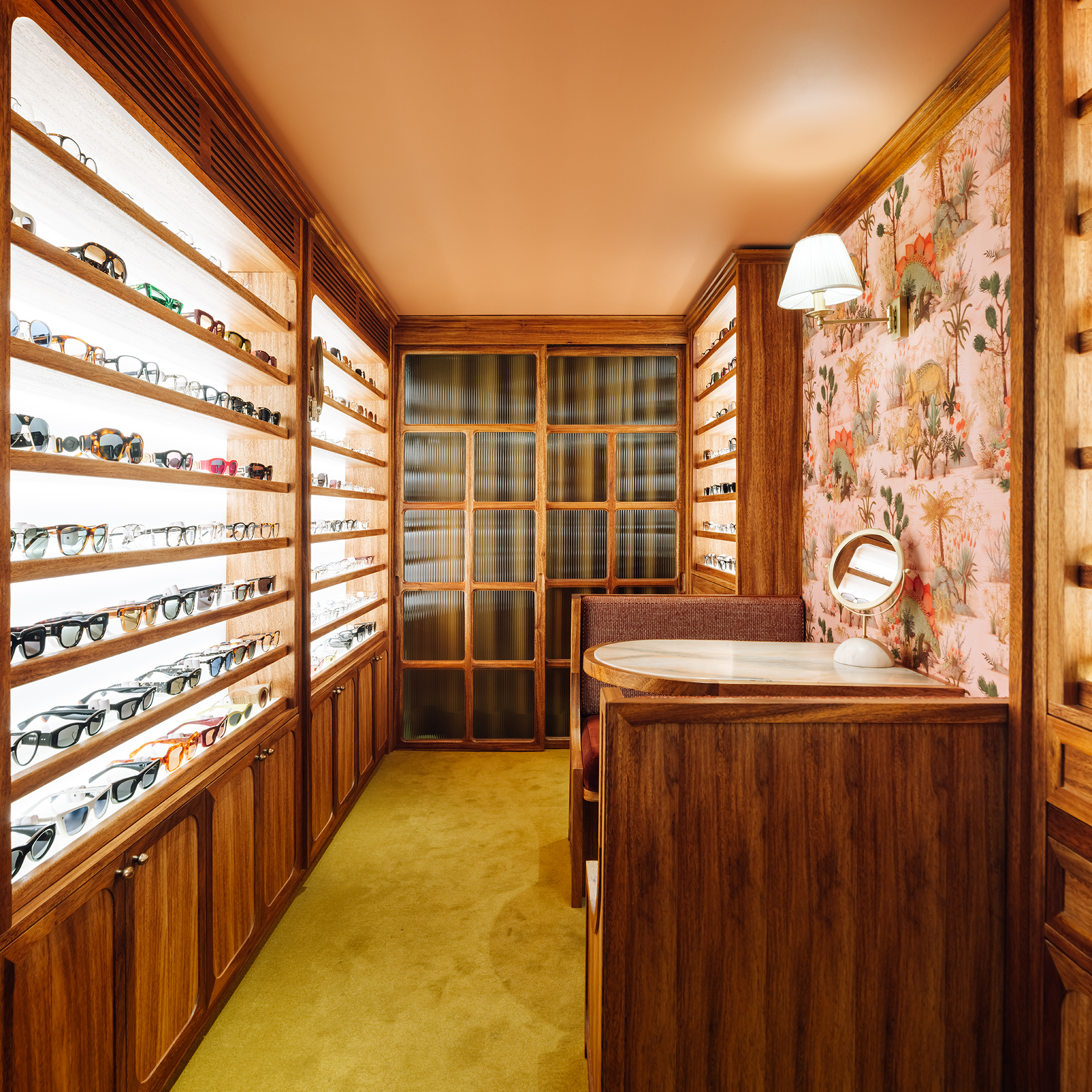 Studio Astolfi conceived and constructed a vast, whimsical “cabinet of curiosities” that wraps around the boutique like a second skin. Inside, vintage and modern spectacles are nestled among curious treasures: taxidermy pieces, antique optometry tools, and mysterious gadgets. The cabinet itself is a playground of surprise—drawers transform into tables, vertical compartments reveal hidden spectacles, and display surfaces appear as needed. Every element, from lighting to mirrors, was handcrafted to perfectly merge form with function.