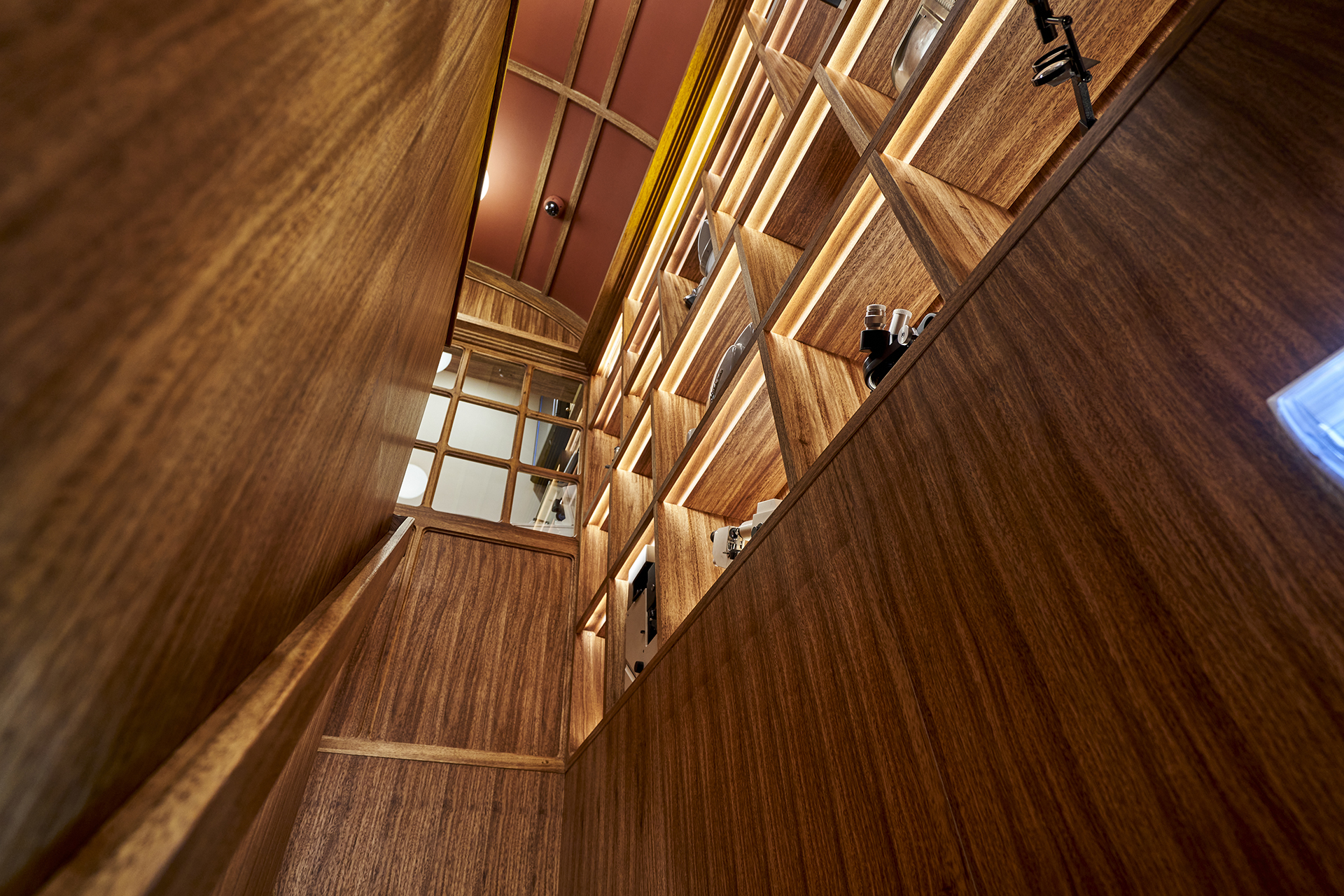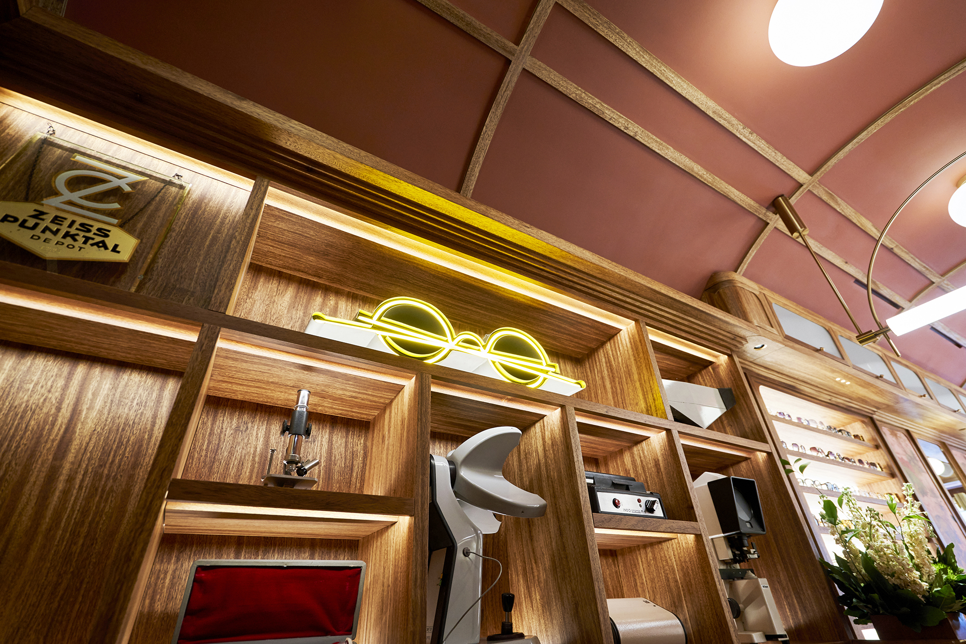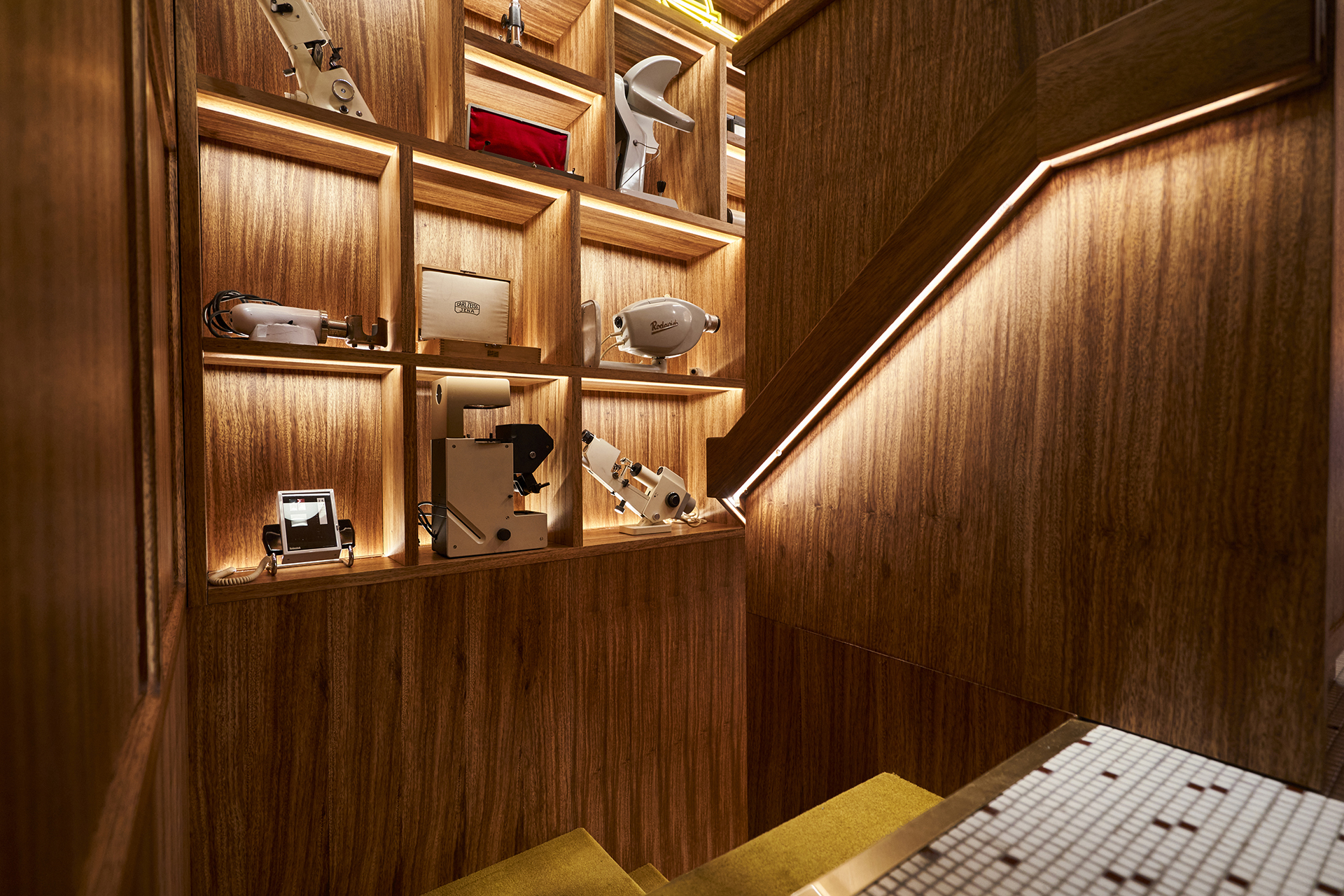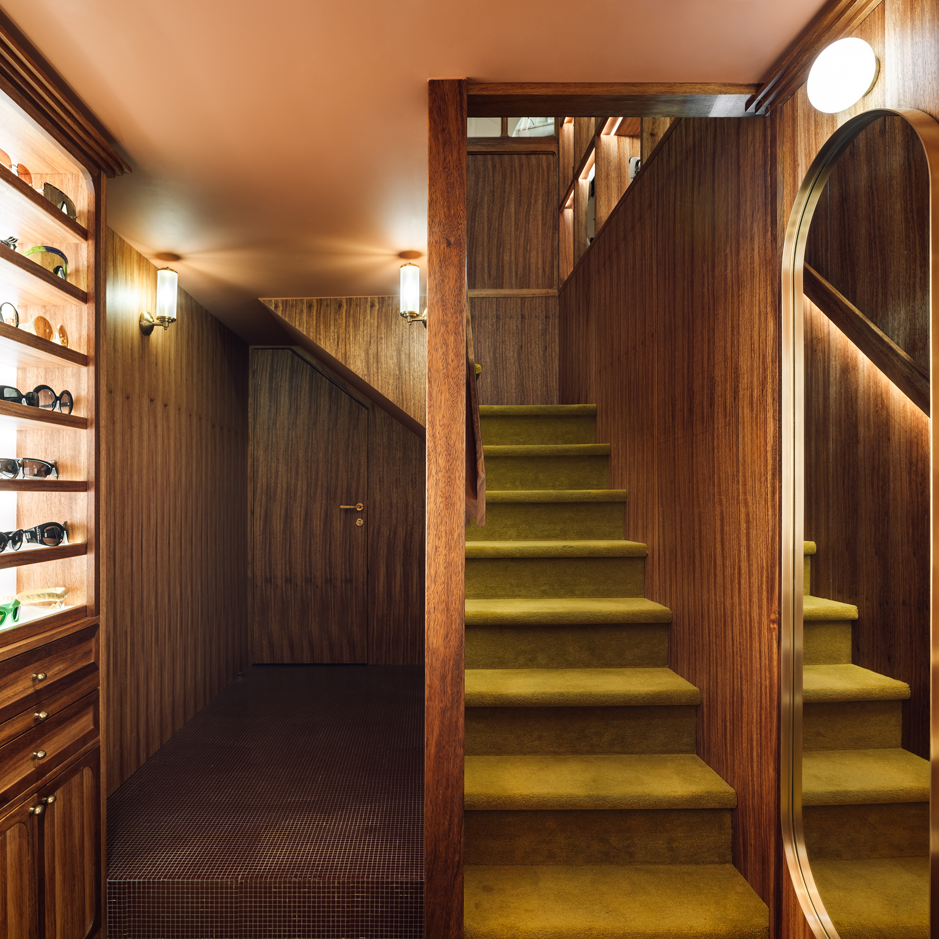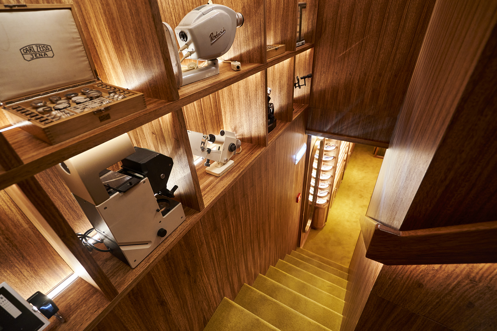 Studio Astolfi conceived and constructed a vast, whimsical “cabinet of curiosities” that wraps around the boutique like a second skin. Inside, vintage and modern spectacles are nestled among curious treasures: taxidermy pieces, antique optometry tools, and mysterious gadgets. The cabinet itself is a playground of surprise—drawers transform into tables, vertical compartments reveal hidden spectacles, and display surfaces appear as needed. Every element, from lighting to mirrors, was handcrafted to perfectly merge form with function.