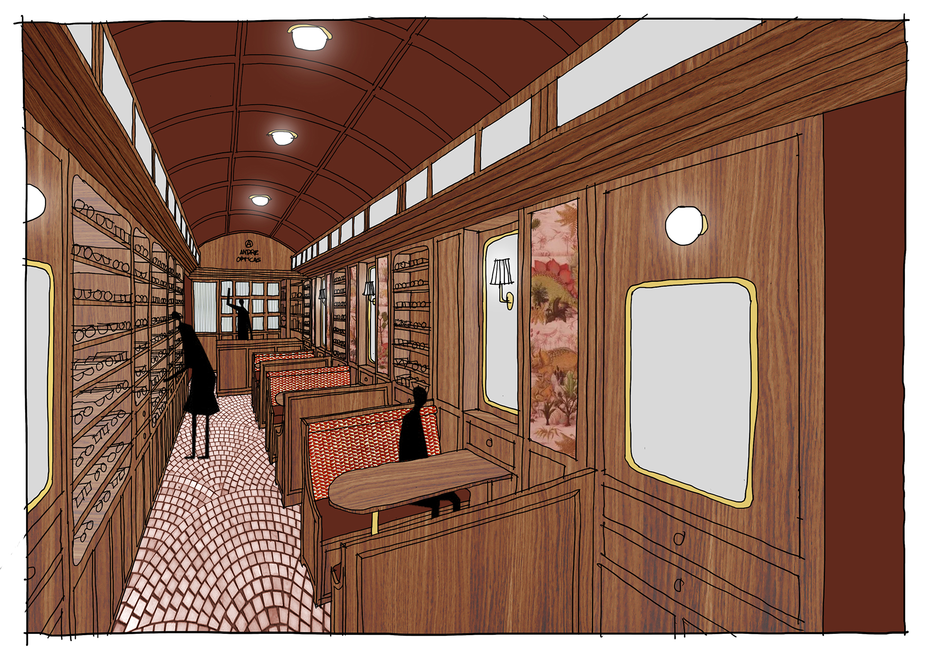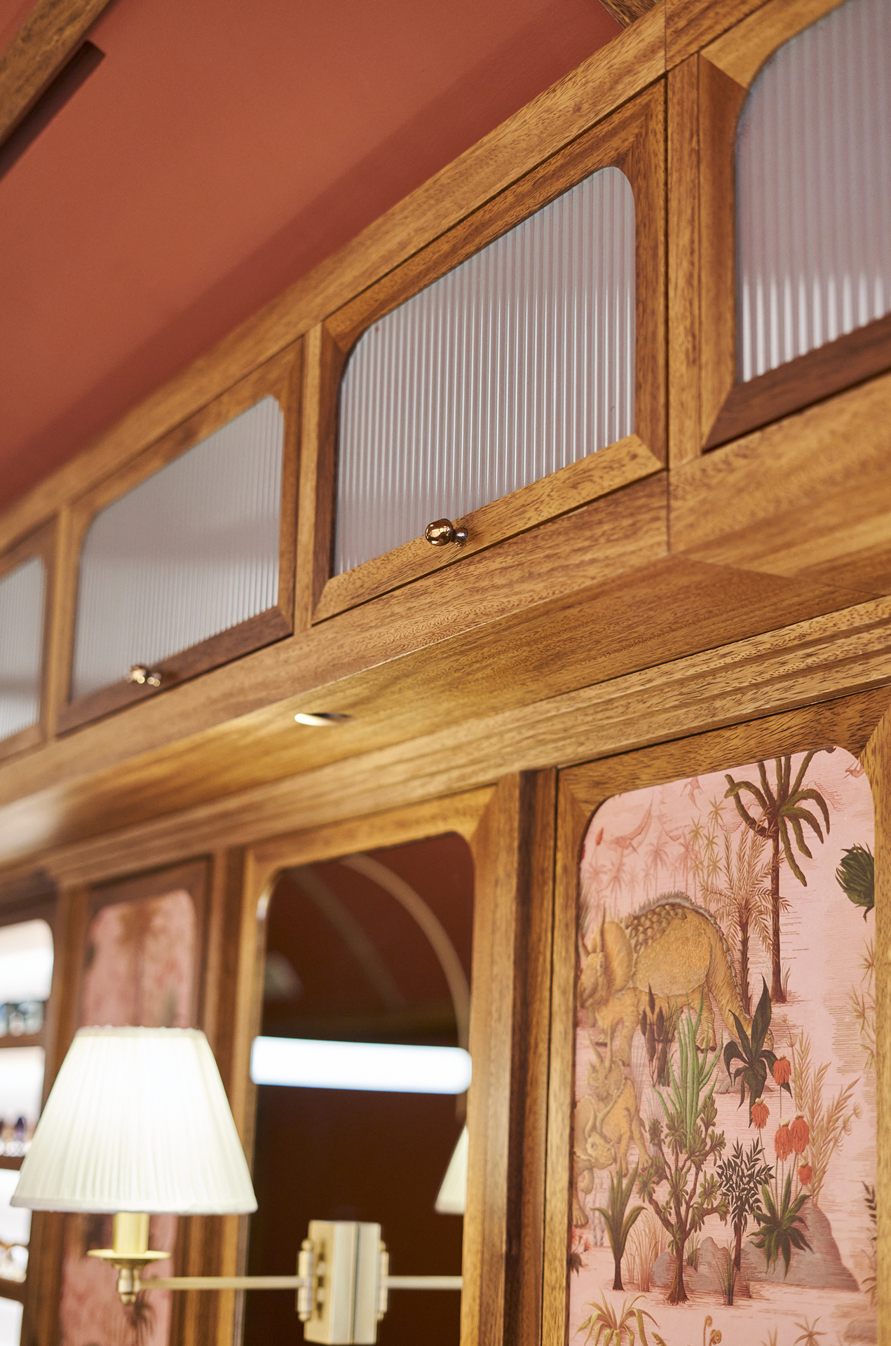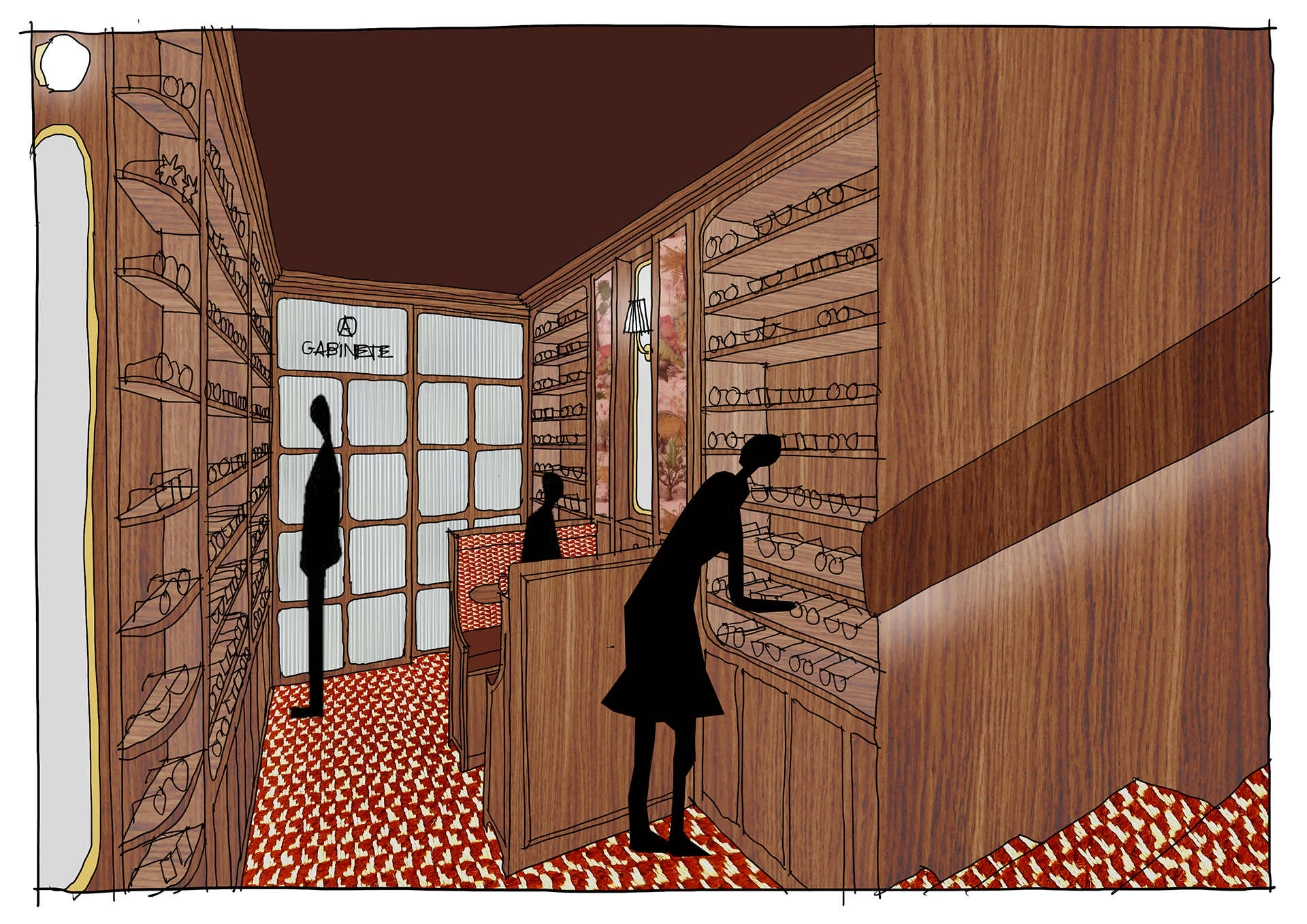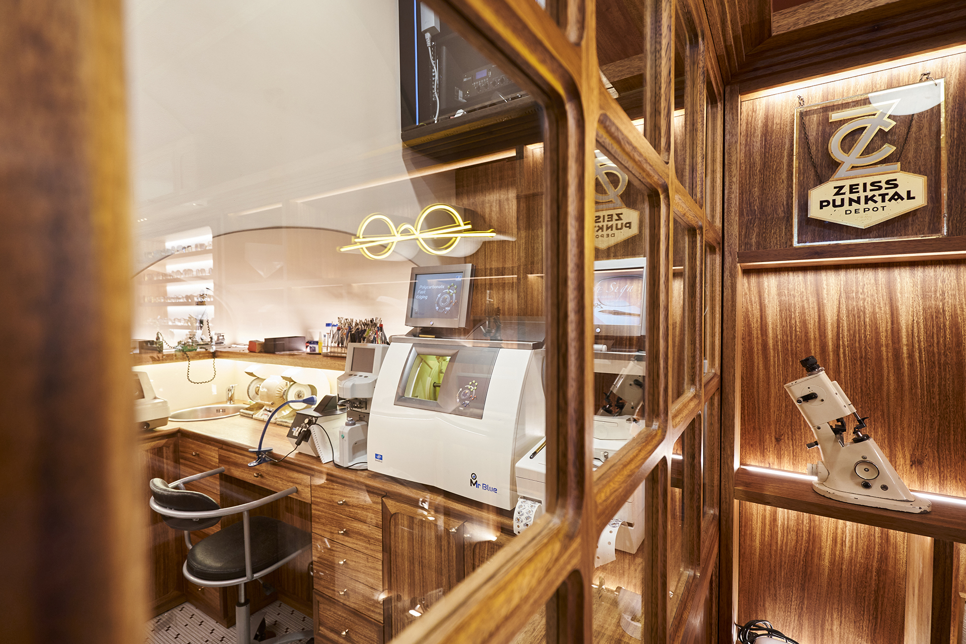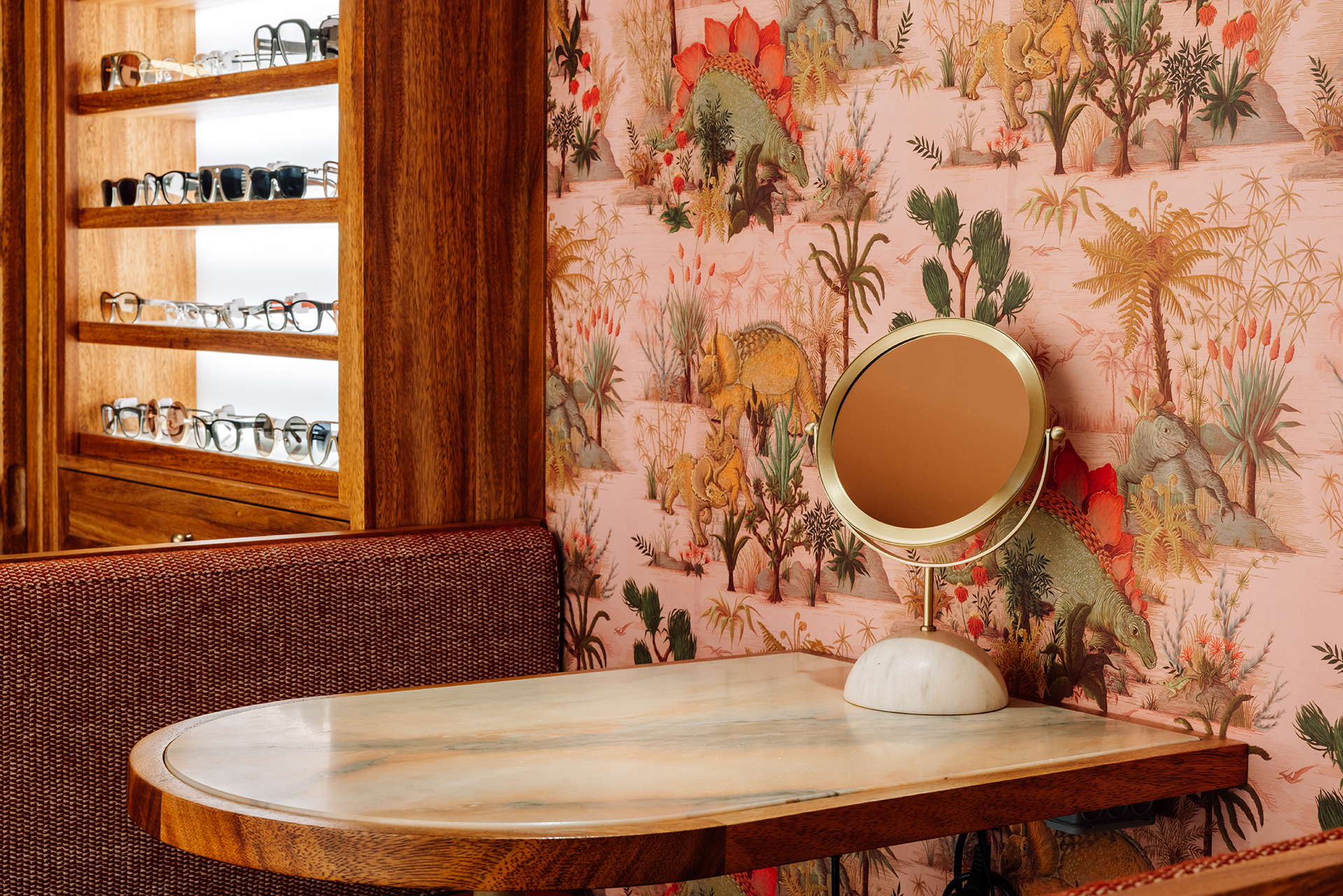 Studio Astolfi conceived and constructed a vast, whimsical “cabinet of curiosities” that wraps around the boutique like a second skin. Inside, vintage and modern spectacles are nestled among curious treasures: taxidermy pieces, antique optometry tools, and mysterious gadgets. The cabinet itself is a playground of surprise—drawers transform into tables, vertical compartments reveal hidden spectacles, and display surfaces appear as needed. Every element, from lighting to mirrors, was handcrafted to perfectly merge form with function.