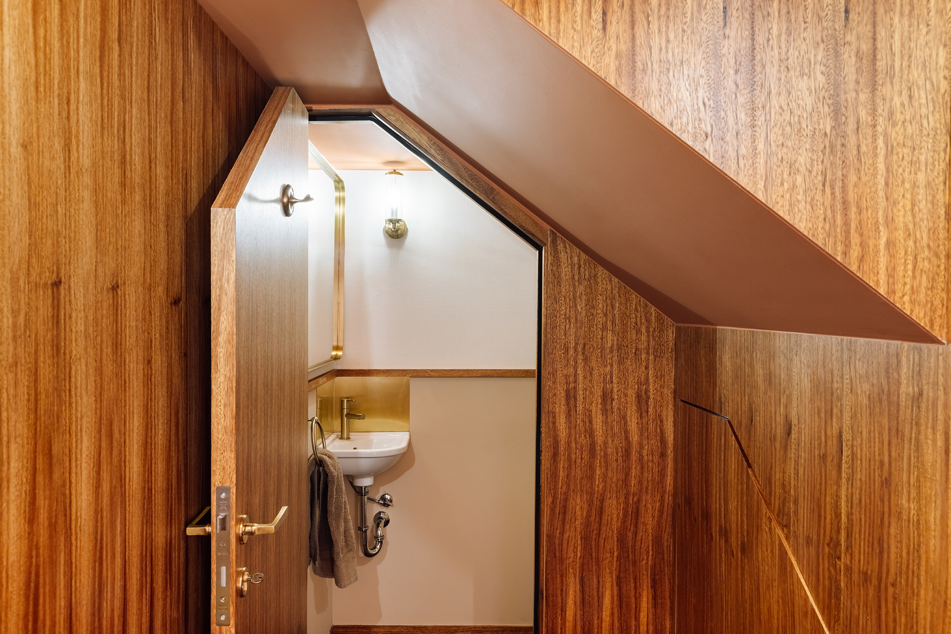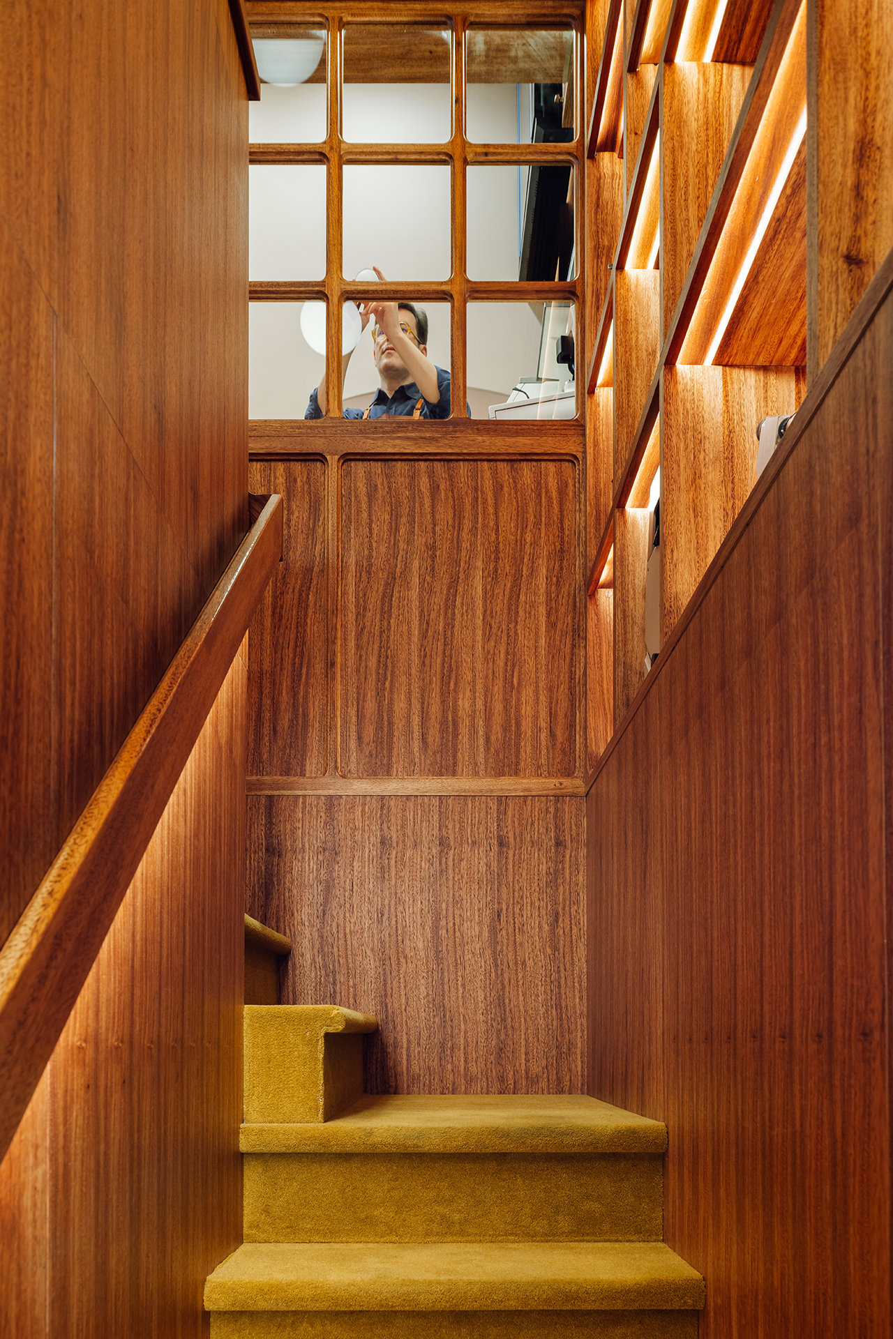 The experience begins on the ground floor. With a palette of refined oak, lacquered finishes, marble, brass, and brown leather, the space is defined by clean, asymmetrical lines and a dynamic play of light and shadow. Custom slate-blue cabinetry contrasts elegantly with bone-white walls and ceiling, creating a striking yet harmonious environment.