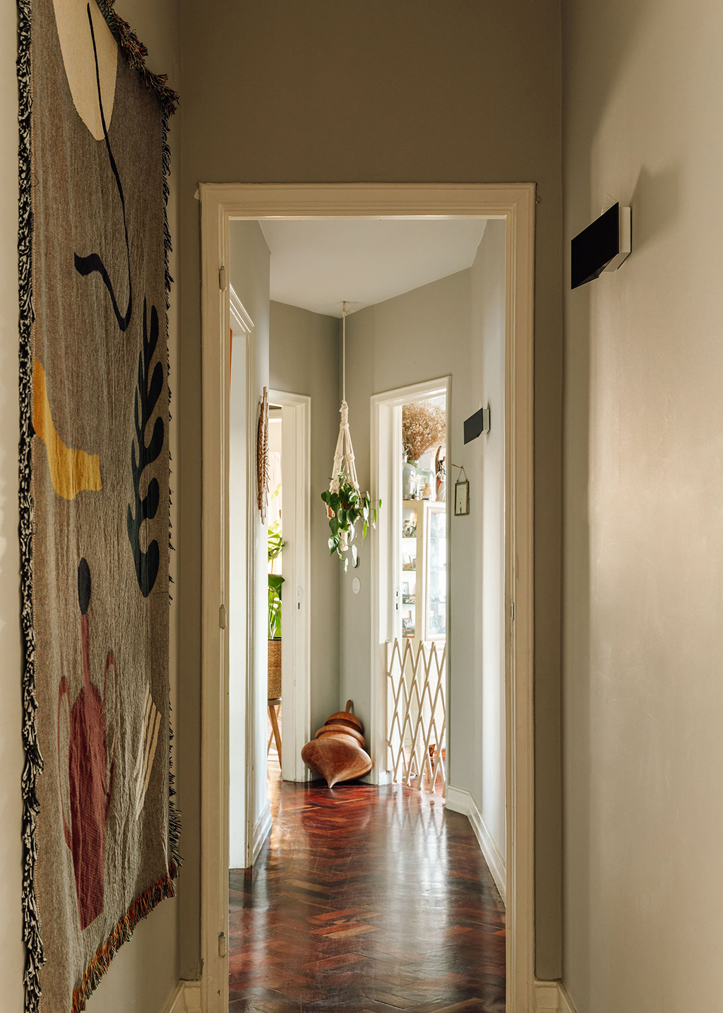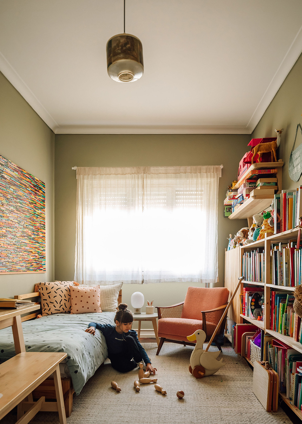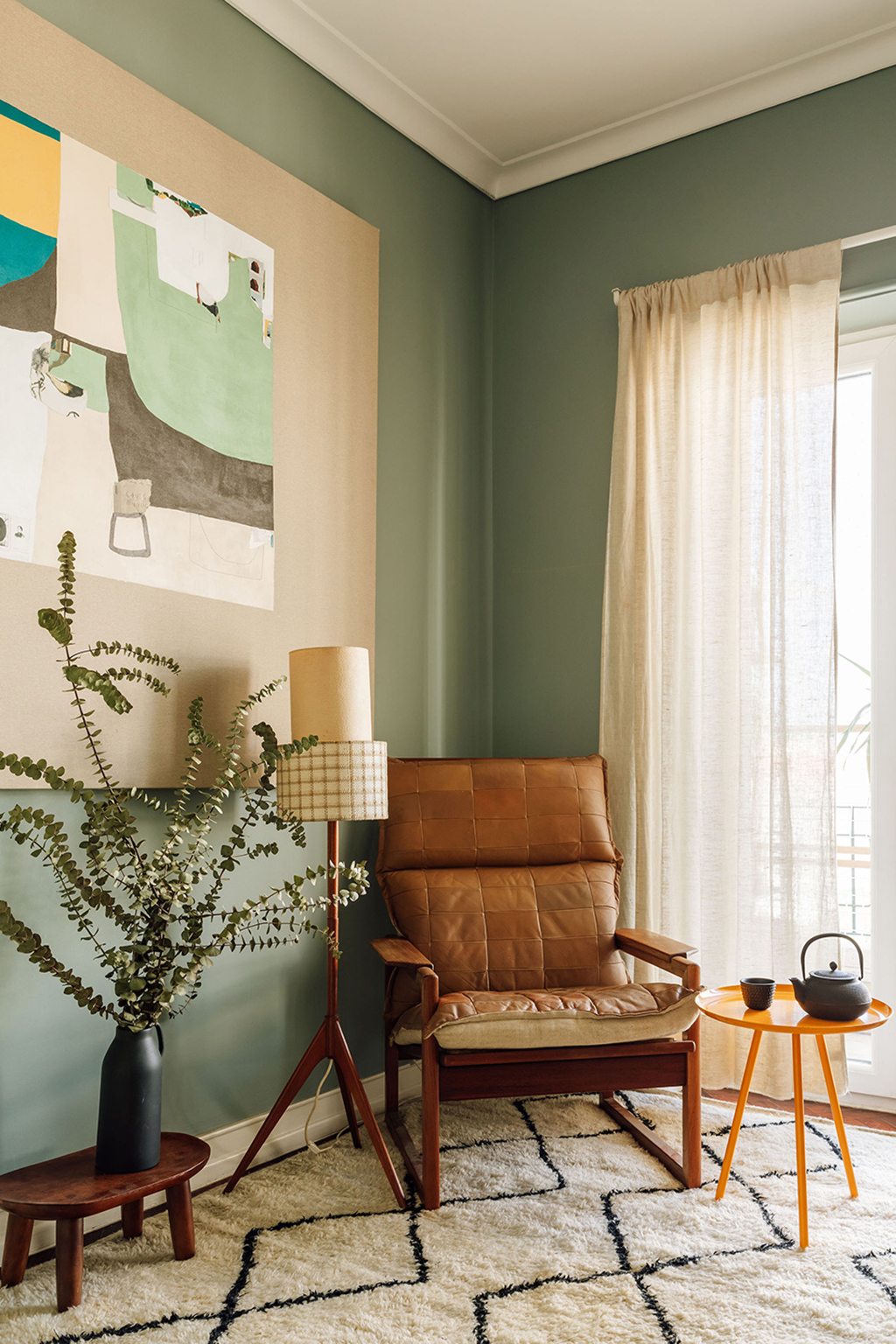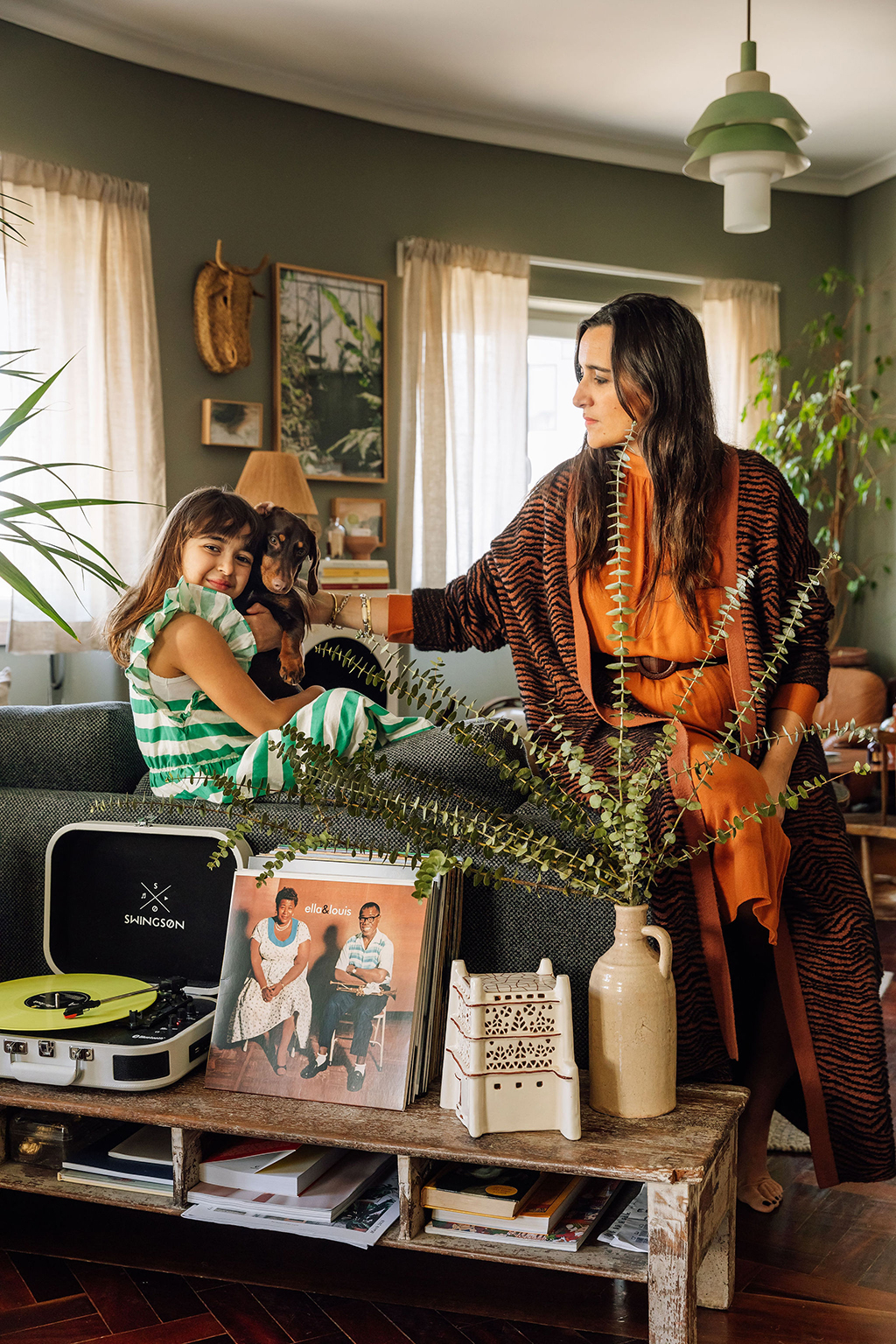 The Portuguese artist, architect and designer Joana Astolfi lives in Lisbon with her six-year- -old daughter Duna and their Dachshund, Lola. Her house nestles on the fifth floor of a classic Estado Novo building in a central urban district. Its 130 square meters are divided into a large living room, kitchen, two bathrooms and four bedrooms; Astolfi uses one of the bedrooms as her home office, and has converted another into a library and music room with a daybed for occasional overnight guests. A small terrace links the office to the master bedroom. She arranges all interior elements - from furniture to color palette to objets d’art - to create distinct spaces (which she calls “moments”) that help to evoke different moods for different times of day. For Astolfi, all “moments” are inclined toward moods of comfort, safety, happiness and joy. “My house is an embodiment of my personality,” she says. “The objects that I love to have near me - they’re actually my way of life, my interests, narratives, my memories, that accompany me everywhere I go.” Even - and perhaps especially - when she is not going much of anywhere: while working and schooling Duna here during the past year, Astolfi has come to appreciate the comfort and functionality of home more than ever. For her, the aesthetic beauty of her space is also “essential.”