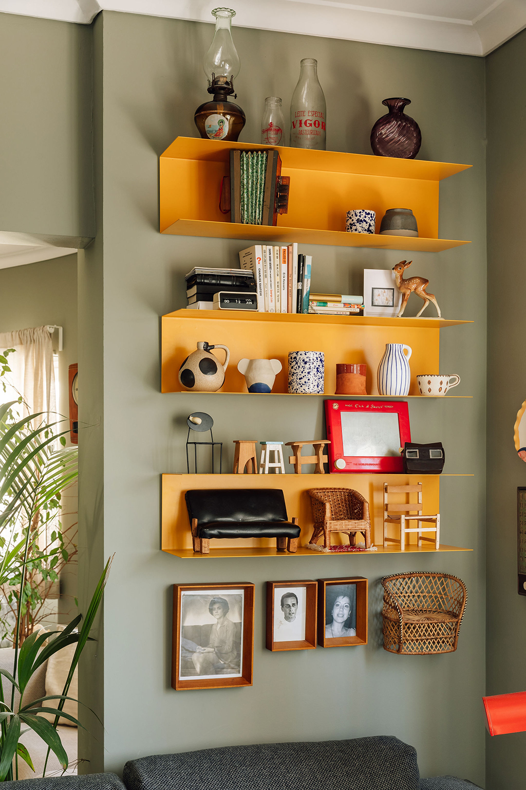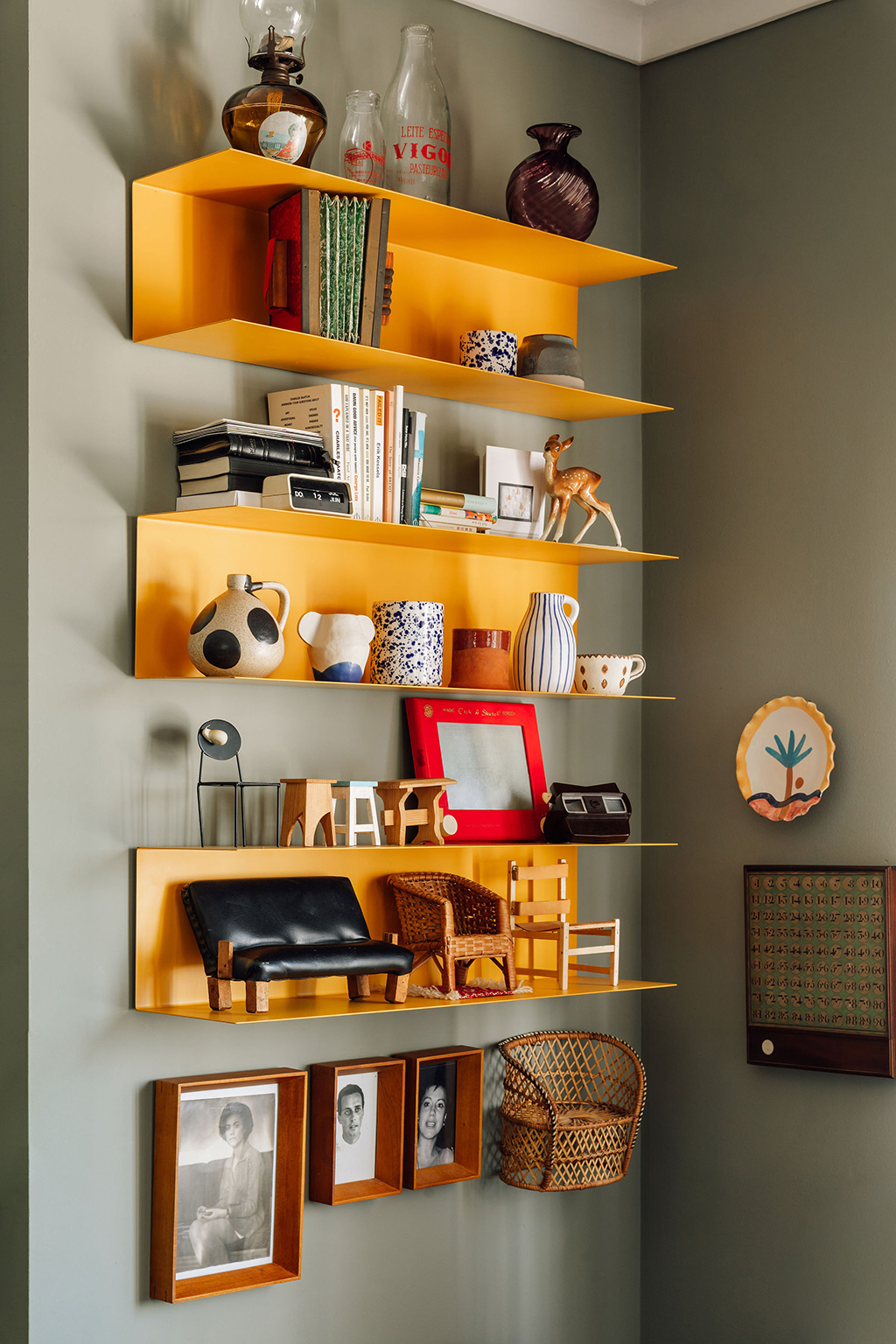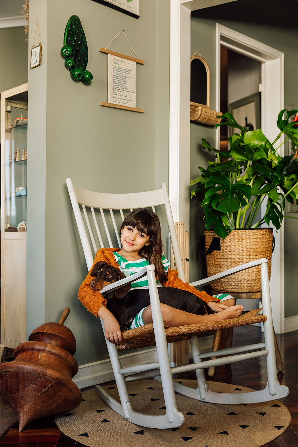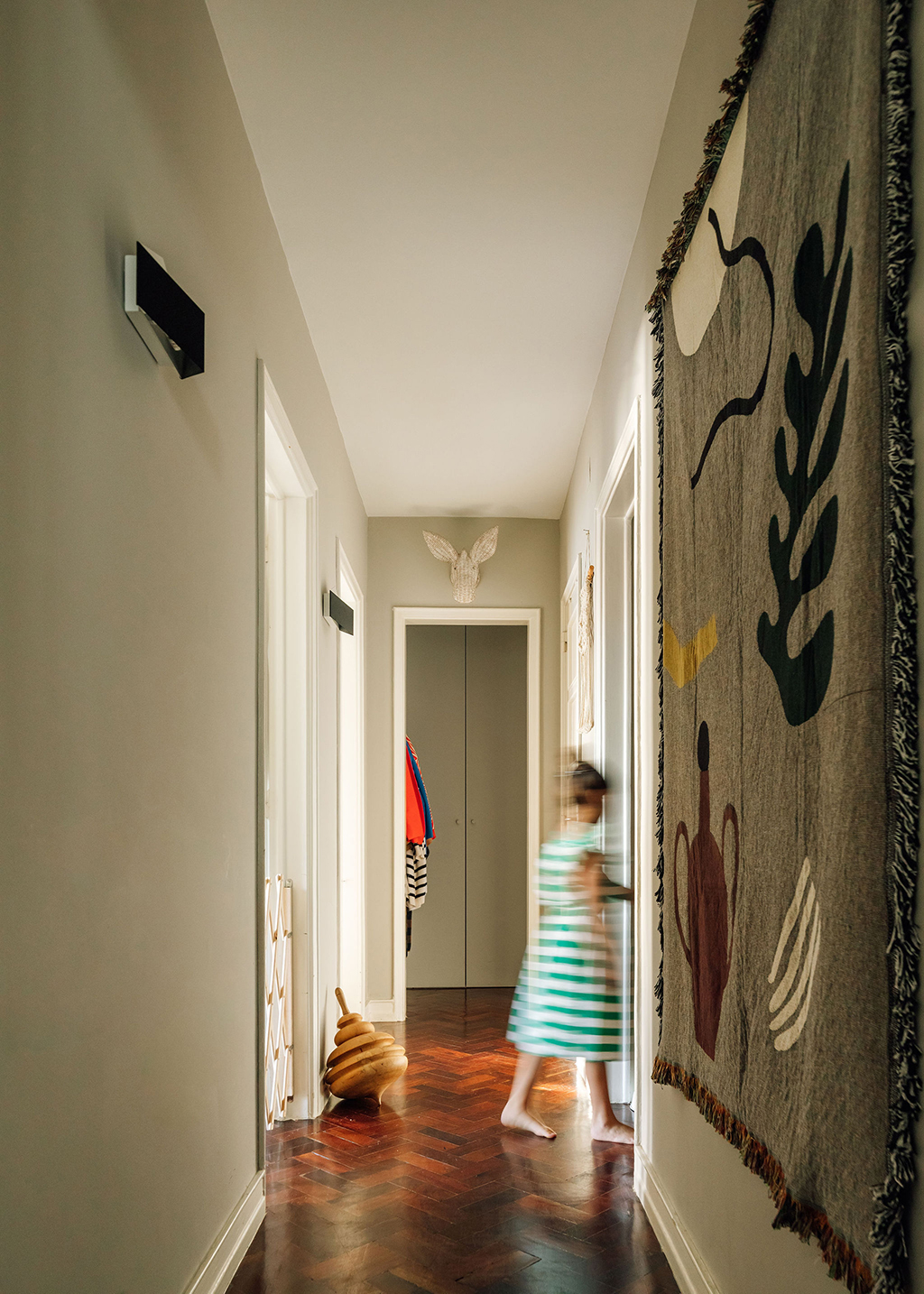 The Portuguese artist, architect and designer Joana Astolfi lives in Lisbon with her six-year- -old daughter Duna and their Dachshund, Lola. Her house nestles on the fifth floor of a classic Estado Novo building in a central urban district. Its 130 square meters are divided into a large living room, kitchen, two bathrooms and four bedrooms; Astolfi uses one of the bedrooms as her home office, and has converted another into a library and music room with a daybed for occasional overnight guests. A small terrace links the office to the master bedroom. She arranges all interior elements - from furniture to color palette to objets d’art - to create distinct spaces (which she calls “moments”) that help to evoke different moods for different times of day. For Astolfi, all “moments” are inclined toward moods of comfort, safety, happiness and joy. “My house is an embodiment of my personality,” she says. “The objects that I love to have near me - they’re actually my way of life, my interests, narratives, my memories, that accompany me everywhere I go.” Even - and perhaps especially - when she is not going much of anywhere: while working and schooling Duna here during the past year, Astolfi has come to appreciate the comfort and functionality of home more than ever. For her, the aesthetic beauty of her space is also “essential.”