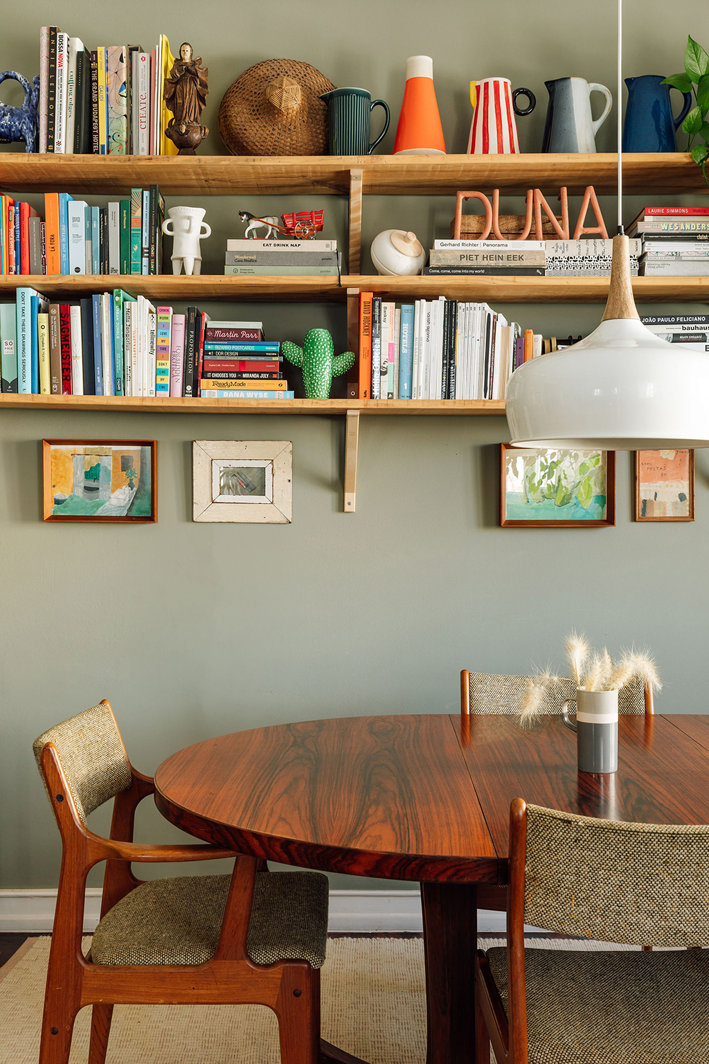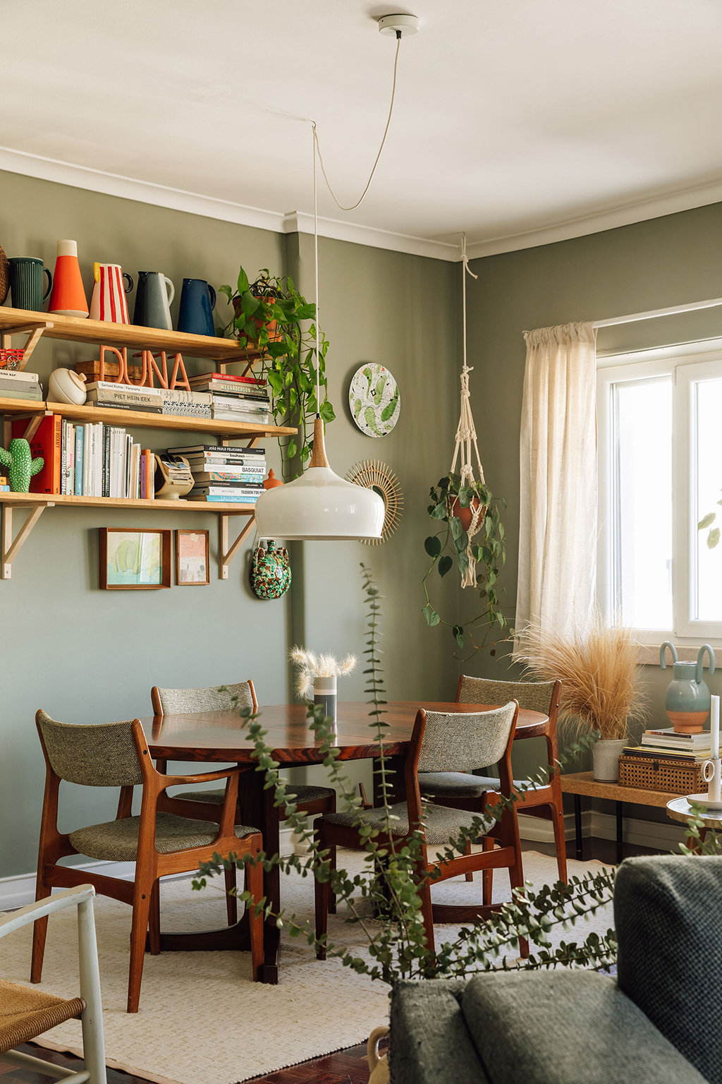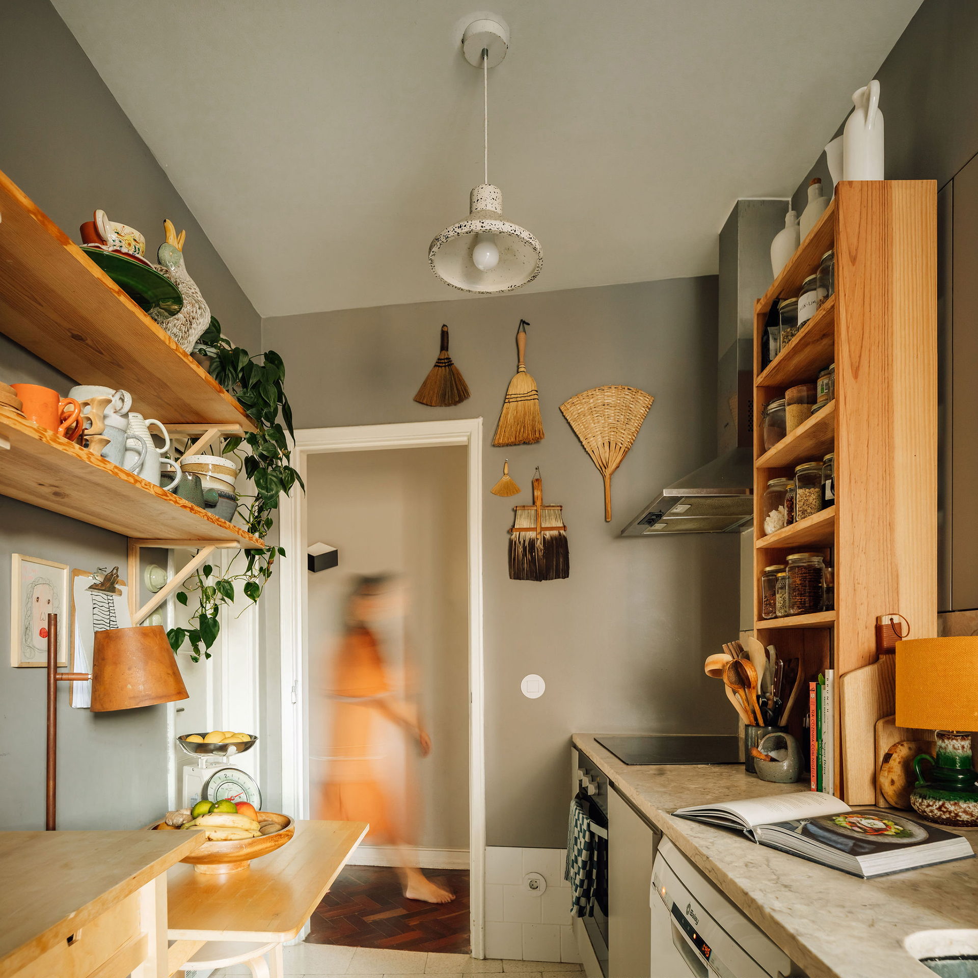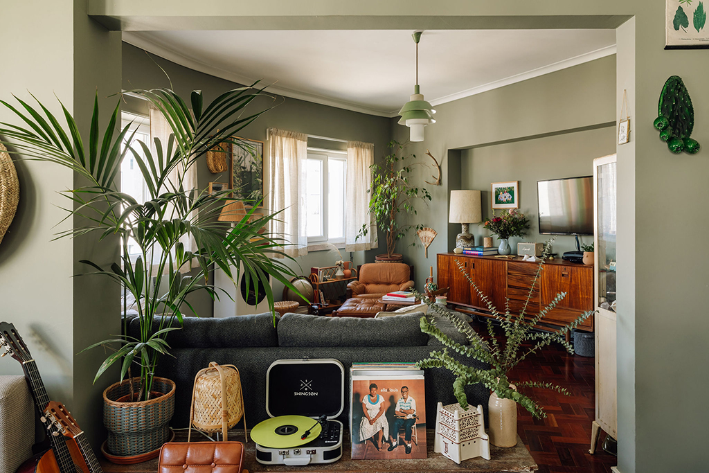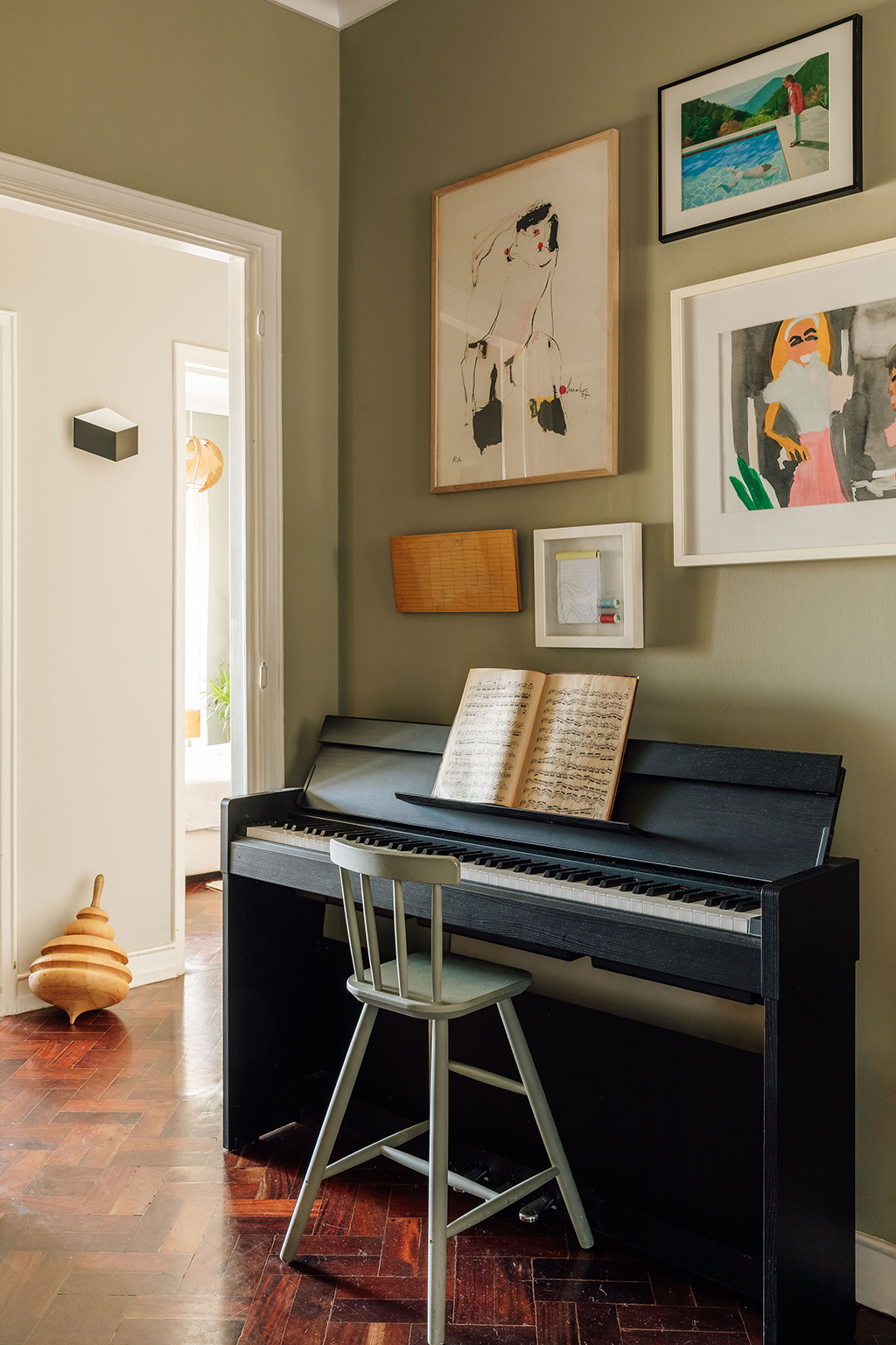 The Portuguese artist, architect and designer Joana Astolfi lives in Lisbon with her six-year- -old daughter Duna and their Dachshund, Lola. Her house nestles on the fifth floor of a classic Estado Novo building in a central urban district. Its 130 square meters are divided into a large living room, kitchen, two bathrooms and four bedrooms; Astolfi uses one of the bedrooms as her home office, and has converted another into a library and music room with a daybed for occasional overnight guests. A small terrace links the office to the master bedroom. She arranges all interior elements - from furniture to color palette to objets d’art - to create distinct spaces (which she calls “moments”) that help to evoke different moods for different times of day. For Astolfi, all “moments” are inclined toward moods of comfort, safety, happiness and joy. “My house is an embodiment of my personality,” she says. “The objects that I love to have near me - they’re actually my way of life, my interests, narratives, my memories, that accompany me everywhere I go.” Even - and perhaps especially - when she is not going much of anywhere: while working and schooling Duna here during the past year, Astolfi has come to appreciate the comfort and functionality of home more than ever. For her, the aesthetic beauty of her space is also “essential.”
