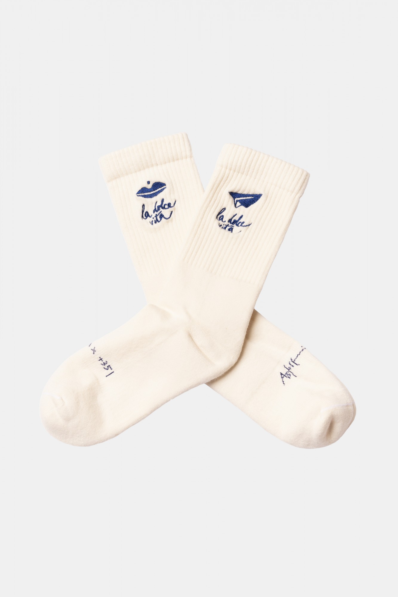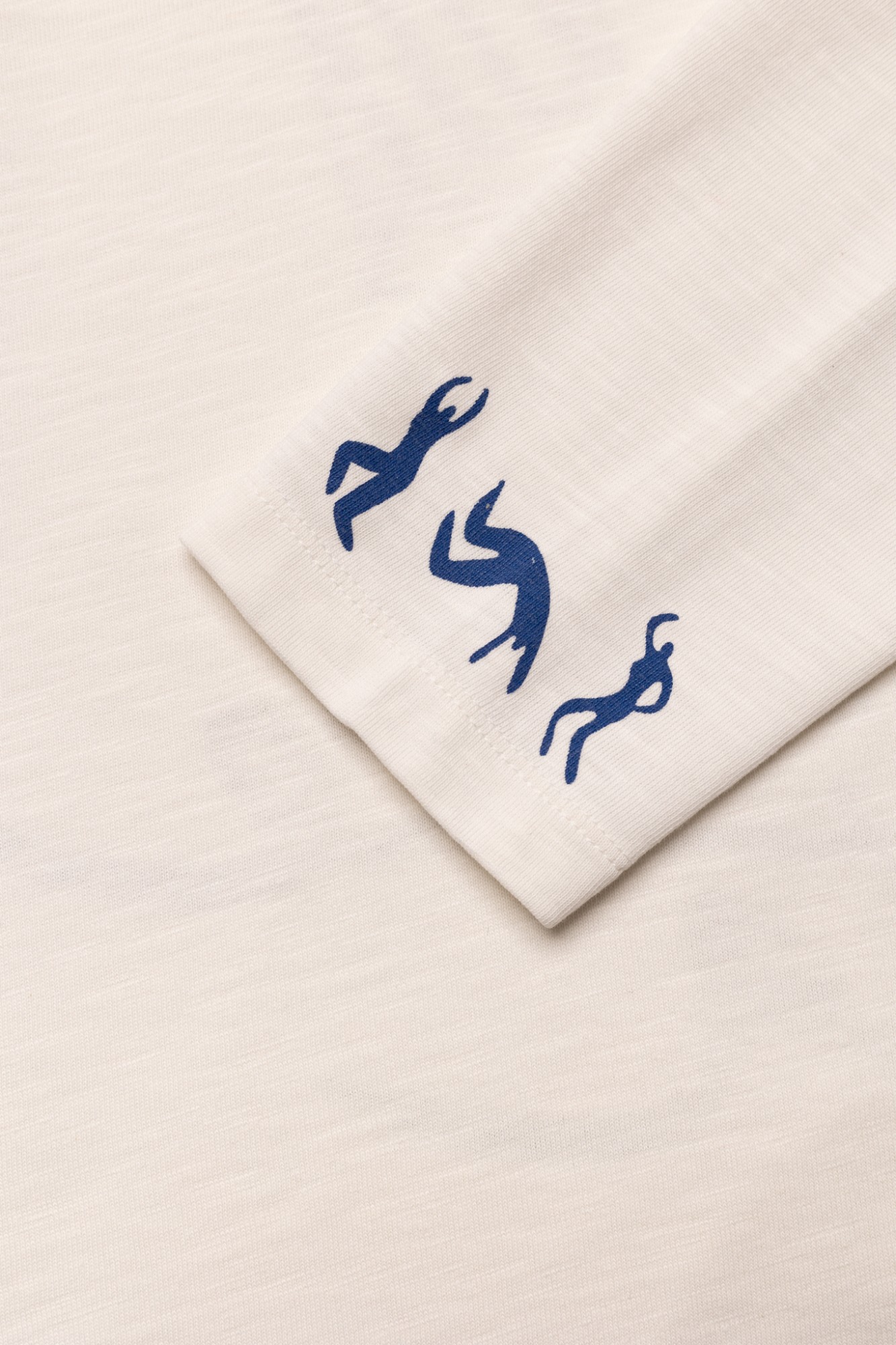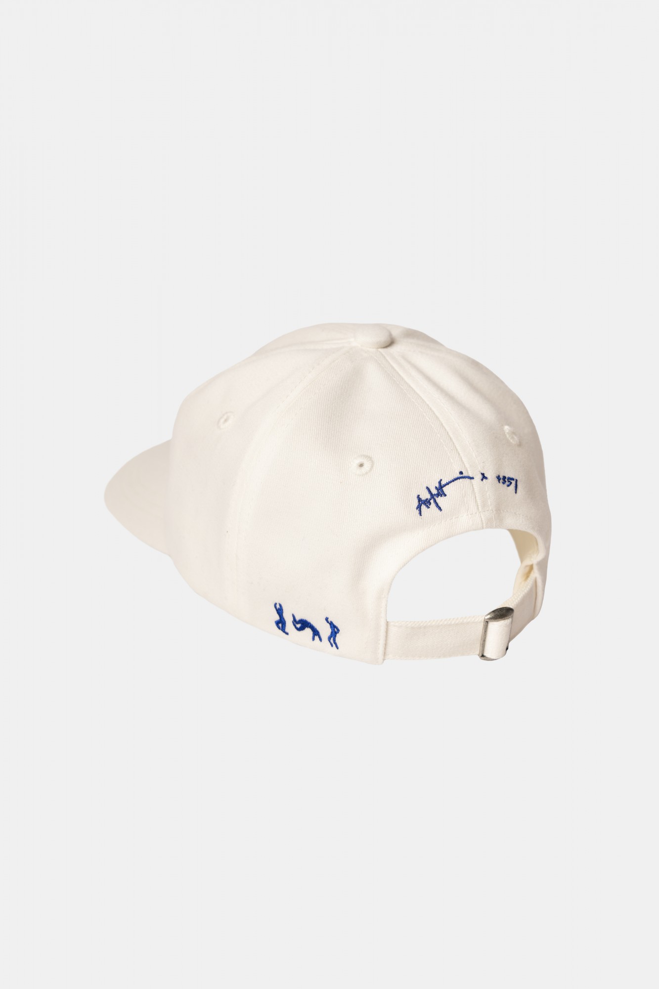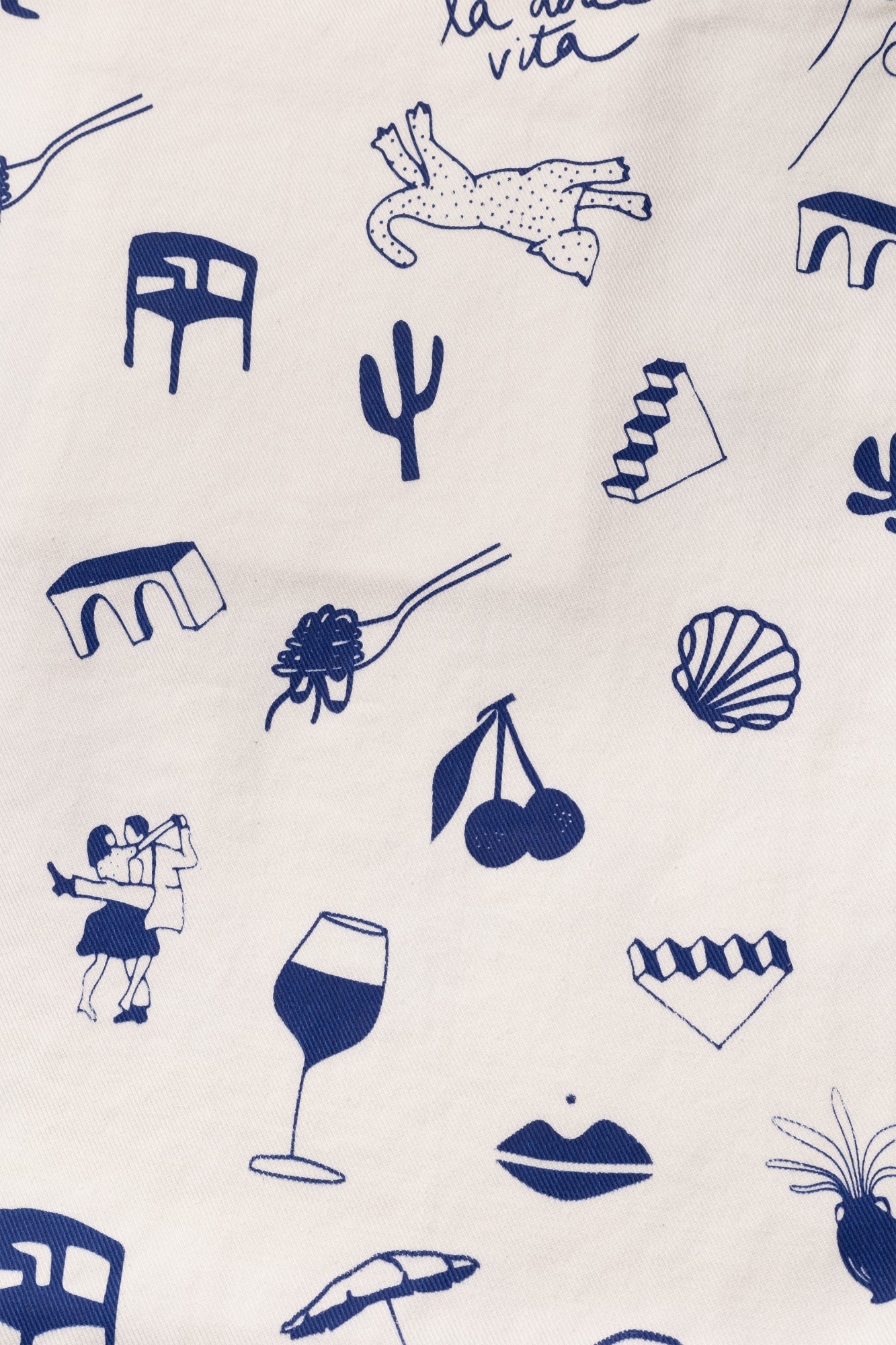 This unisex collection features eight essential pieces made from organic cotton, including T-shirts, sweatshirts, pants, a jacket, a tote bag, socks, and a cap—all crafted entirely in Portugal. The collection’s crisp cream and bold steel-blue palette provides a fresh backdrop for whimsical symbols: dancing couples, ice cream cones, lemons, seashells, paper planes, lips, and playful swimmers. These elements represent the small pleasures of summer and mirror Astolfi’s personal universe.