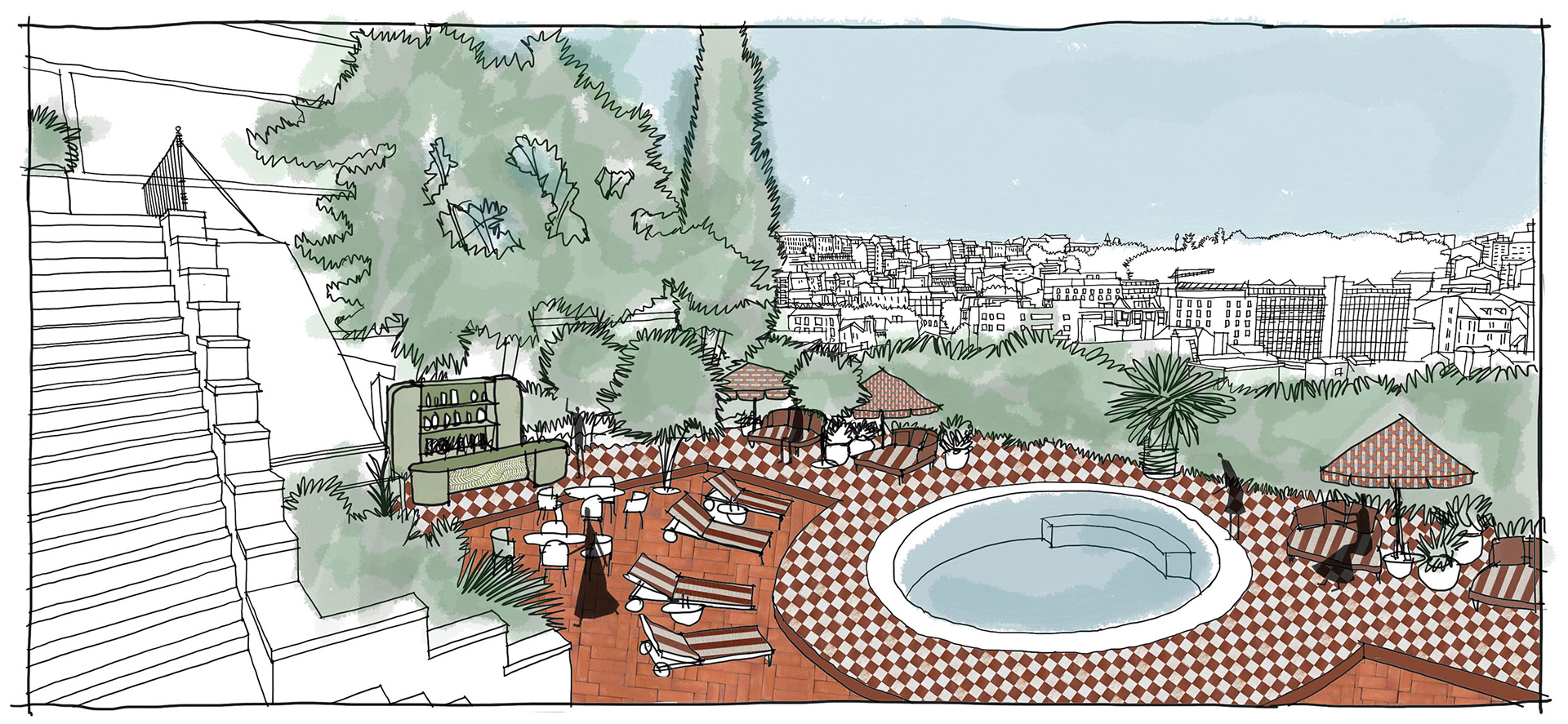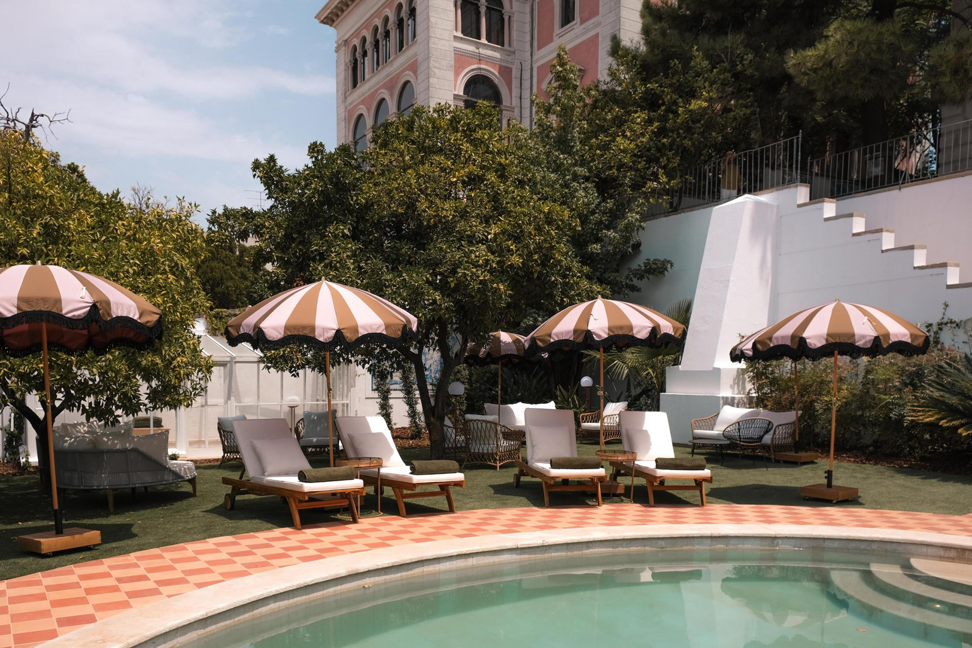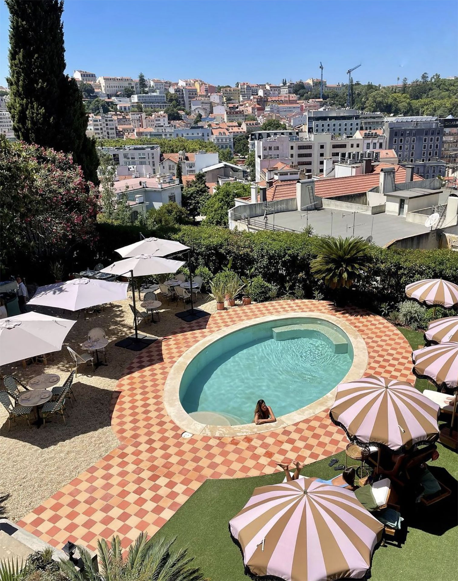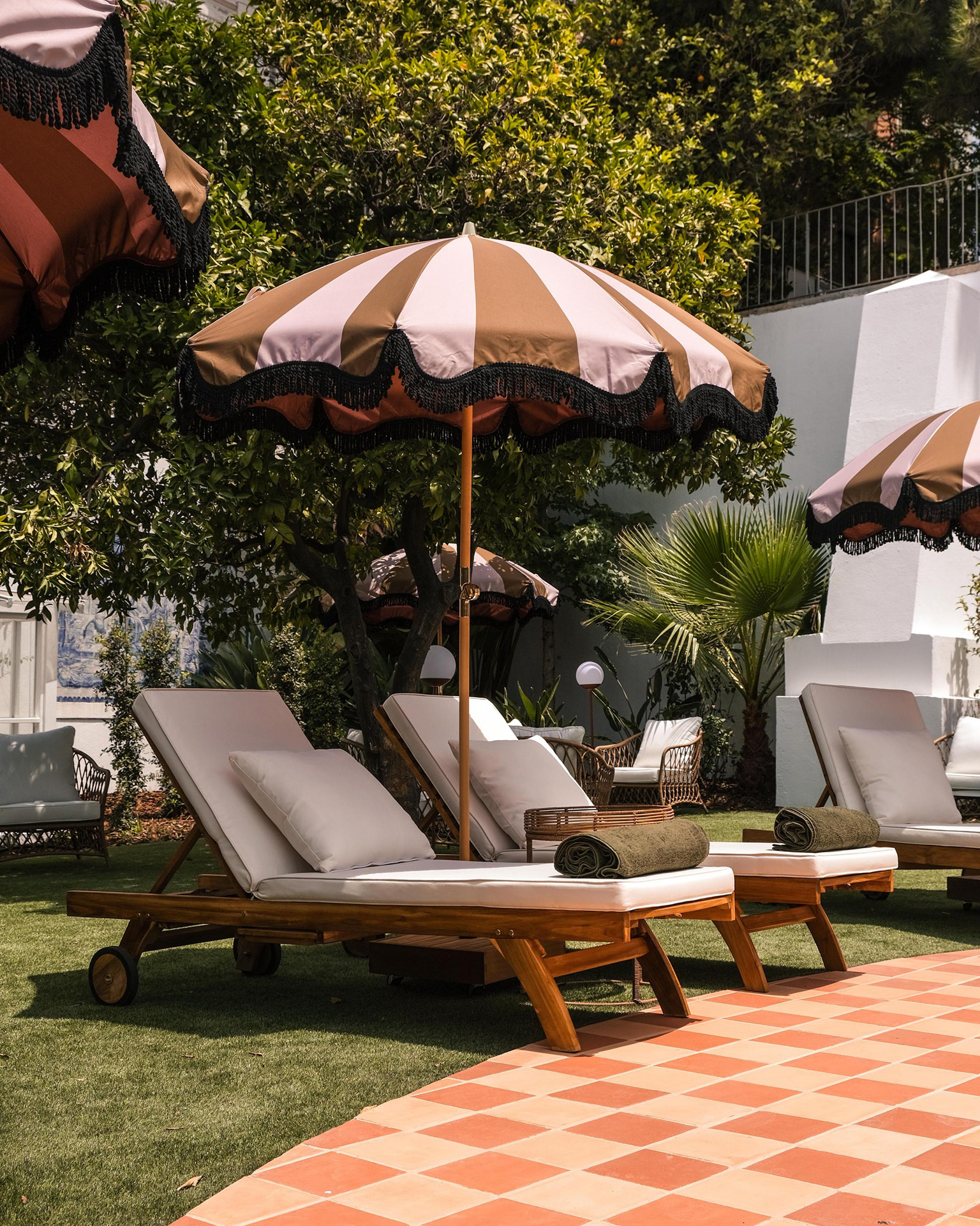 The space unfolds dynamically—bold chess-pattern terracotta tiles frame the pool, and striped sun umbrellas invite relaxed lounging. Around every corner, cozy nooks spark curiosity and discovery, making each moment feel like a little adventure.