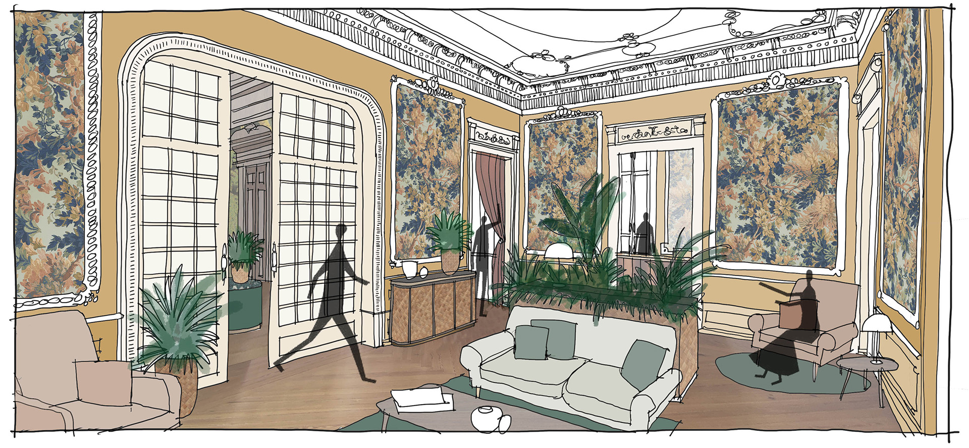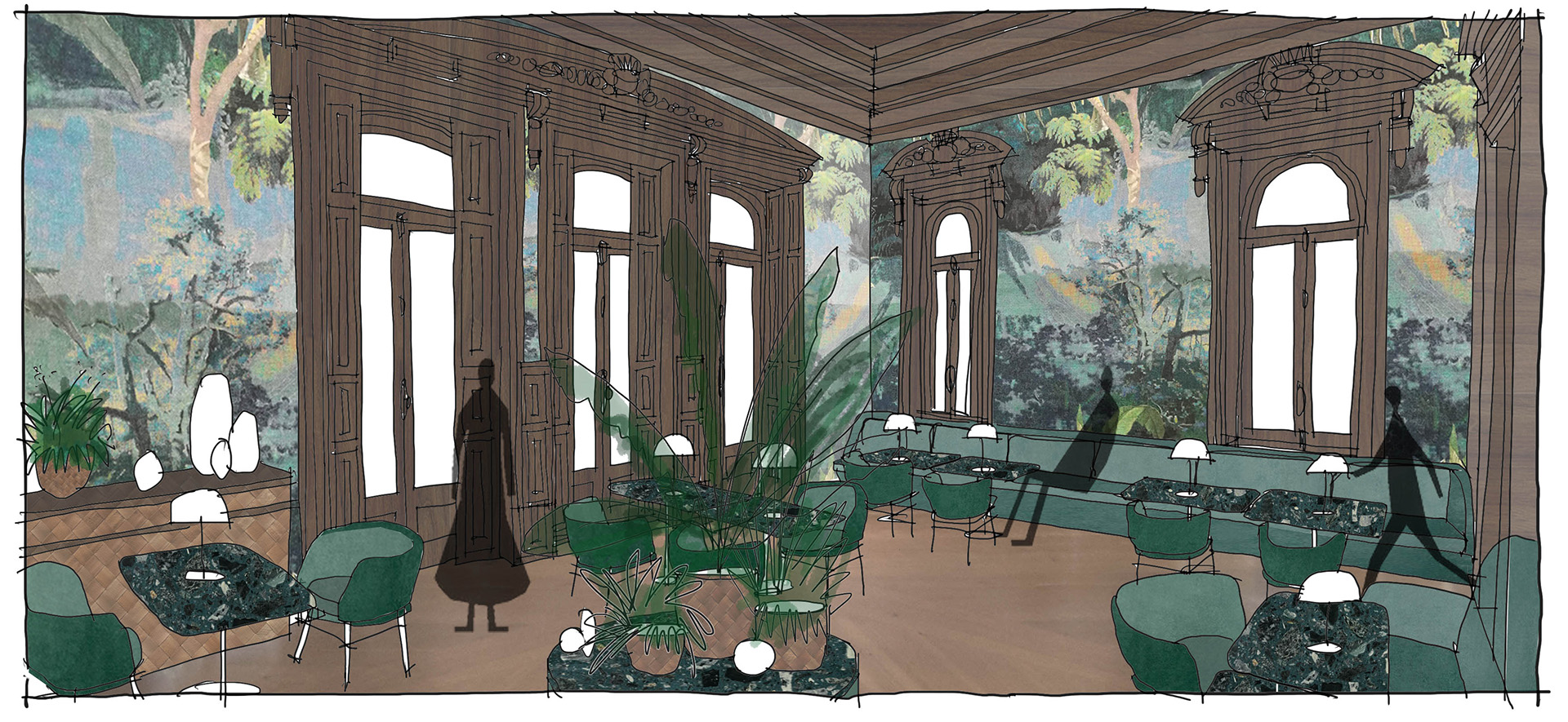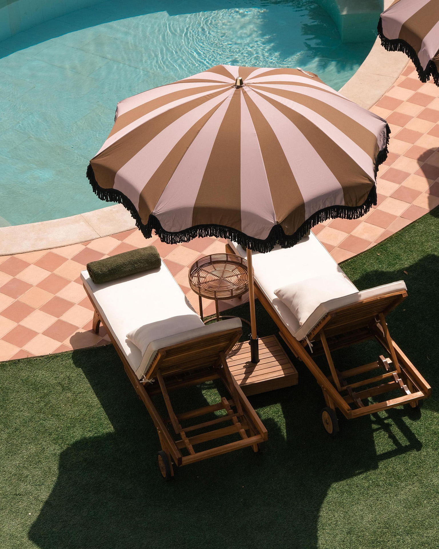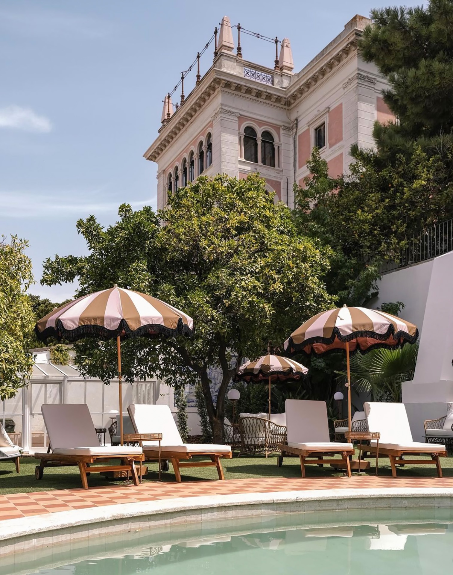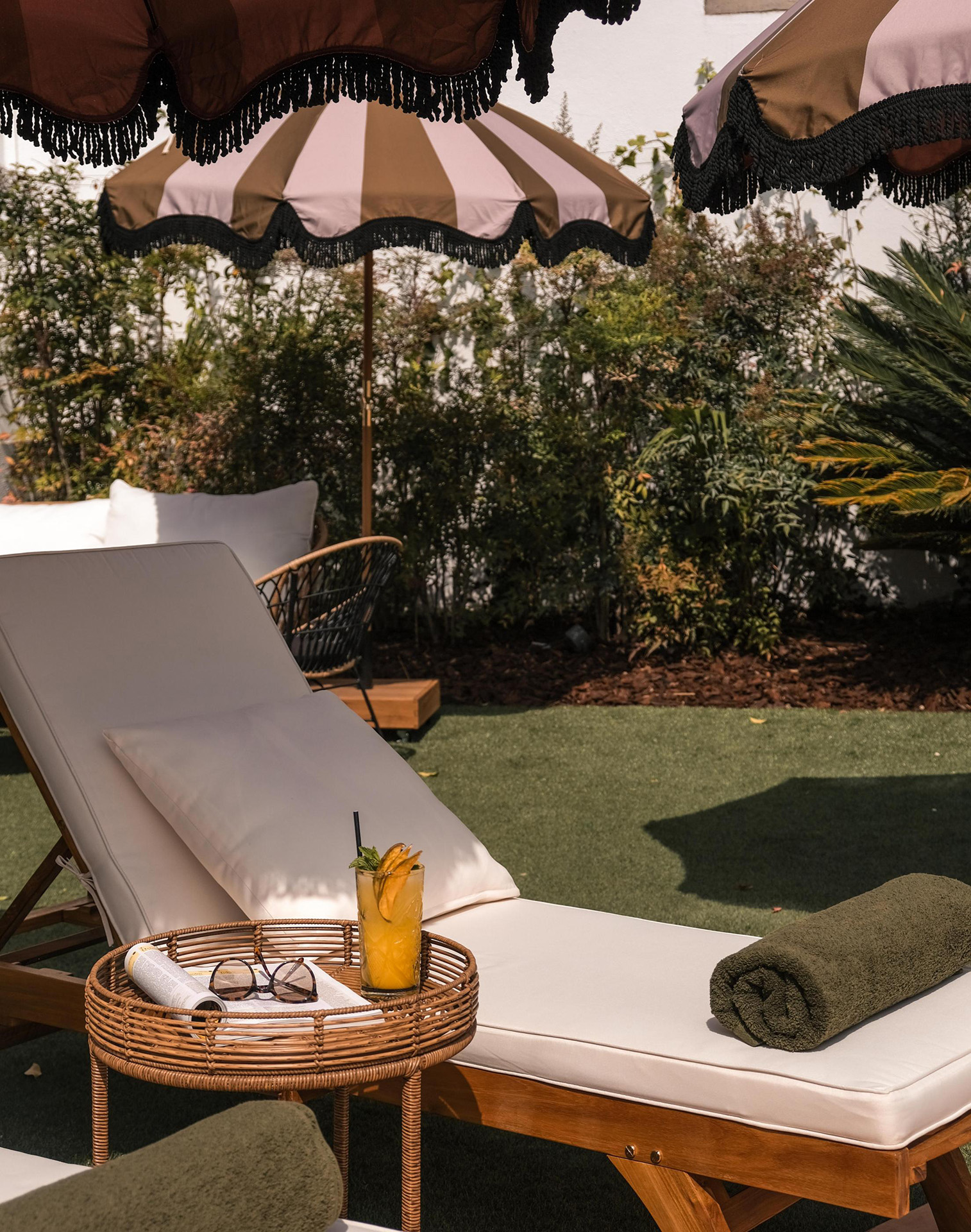 The space unfolds dynamically—bold chess-pattern terracotta tiles frame the pool, and striped sun umbrellas invite relaxed lounging. Around every corner, cozy nooks spark curiosity and discovery, making each moment feel like a little adventure.